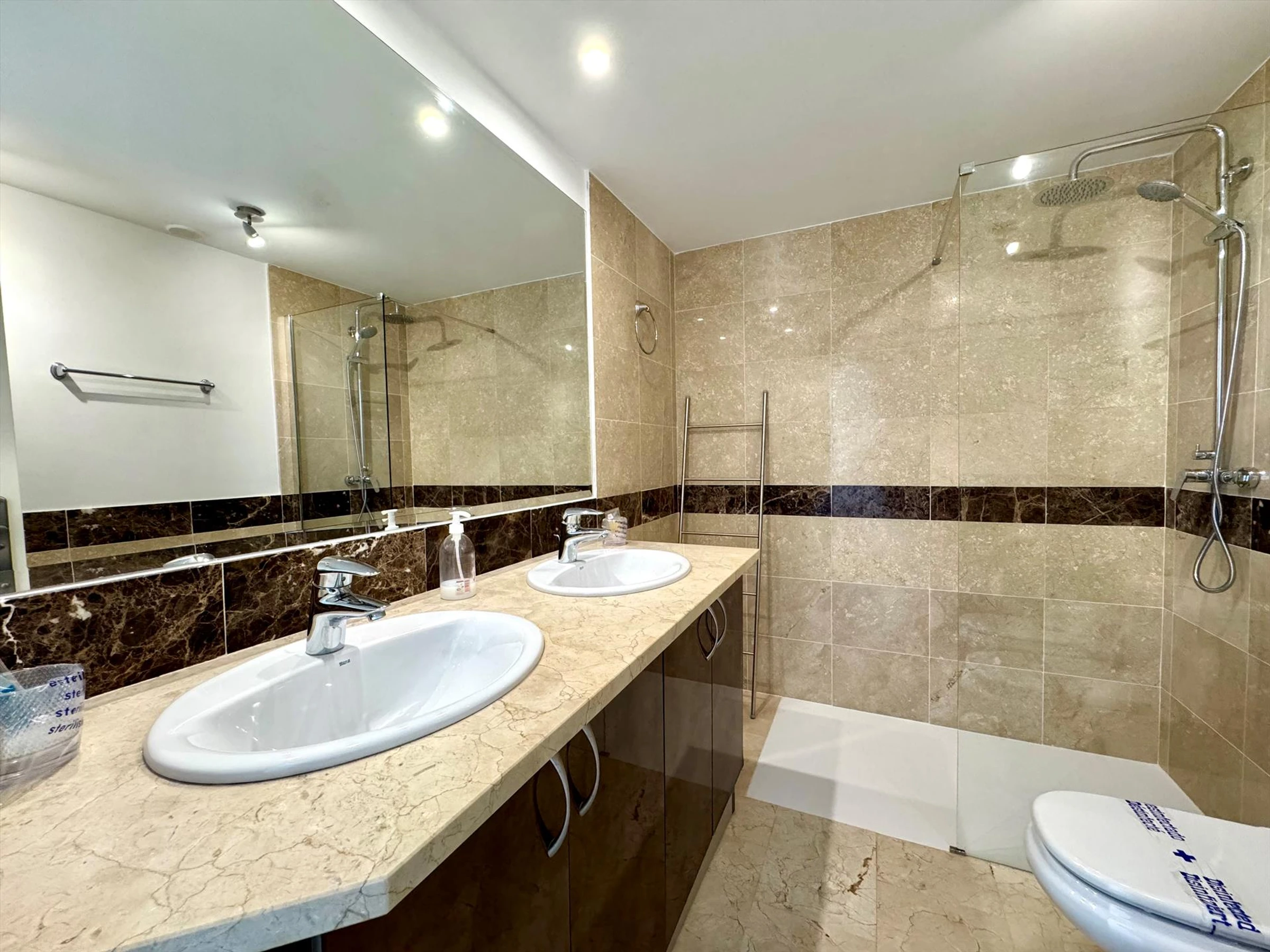 * Hauptbadezimmer mit Walkin-Dusche, Badmöbel mit zwei Waschbecken,