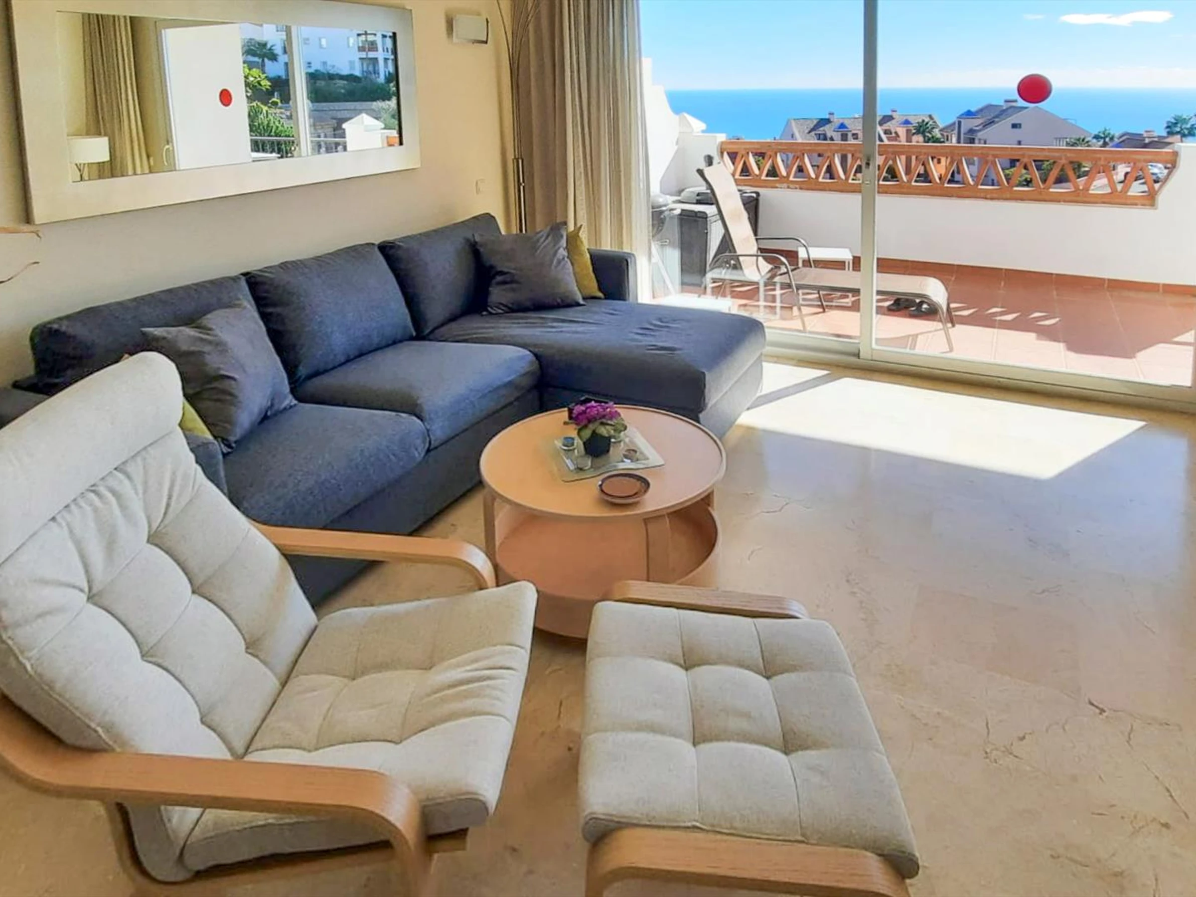 Luxus Ferienwohnung mit Südterrasse und Meerblick, 2 Schlafzimmer, 2 Bäder und Pool in Las Palmeras, Calahonda - Mijas Diese moderne Ferienwohnung mit zwei Schlafzimmern und zwei Bädern befindet sich in ruhiger Lage in Las Palmeras mit Panoramablick auf das Meer und die Küste.