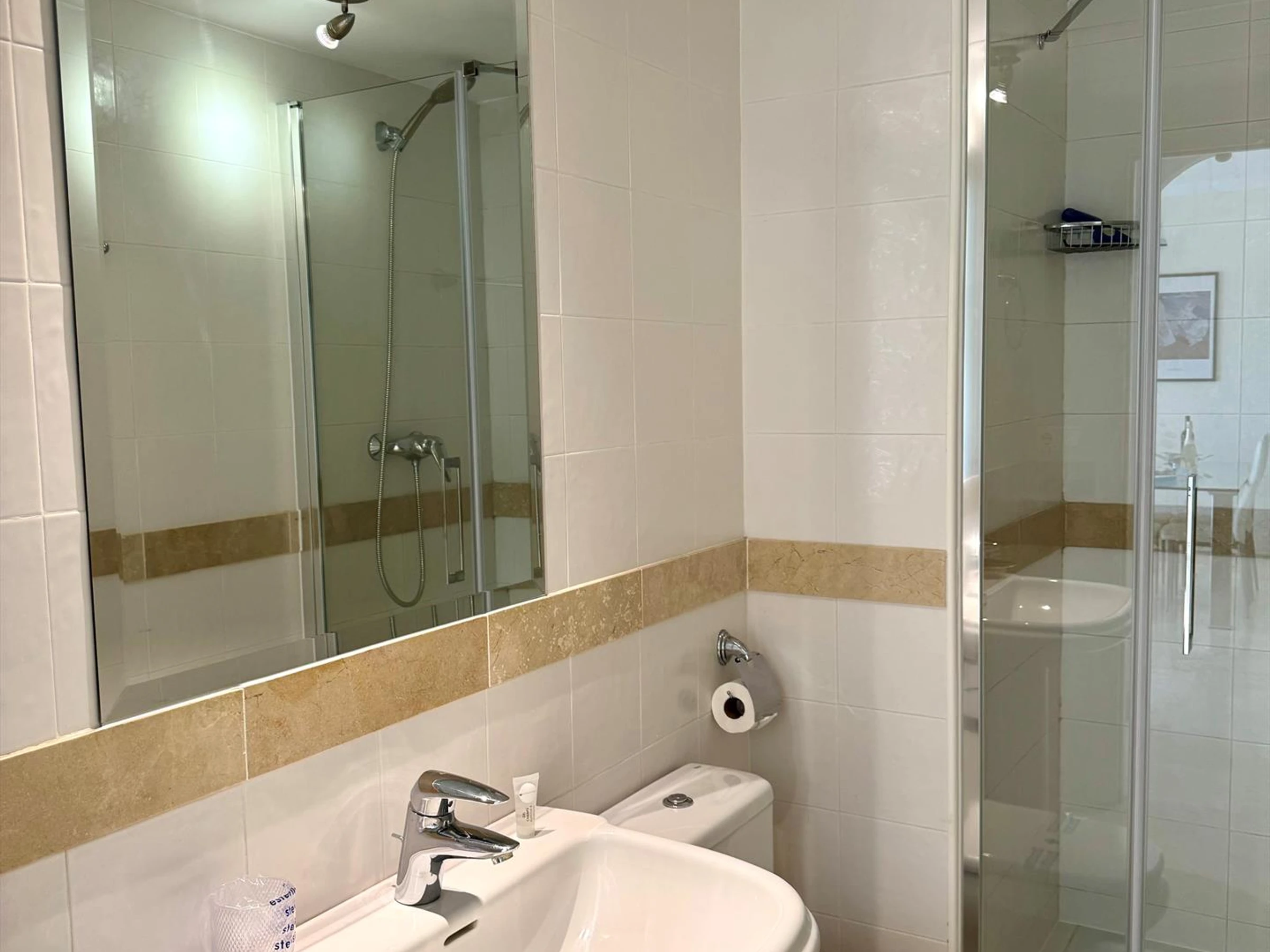 * Zweites Badezimmer mit Dusche, Waschbecken, Fön und WC. Terrasse
