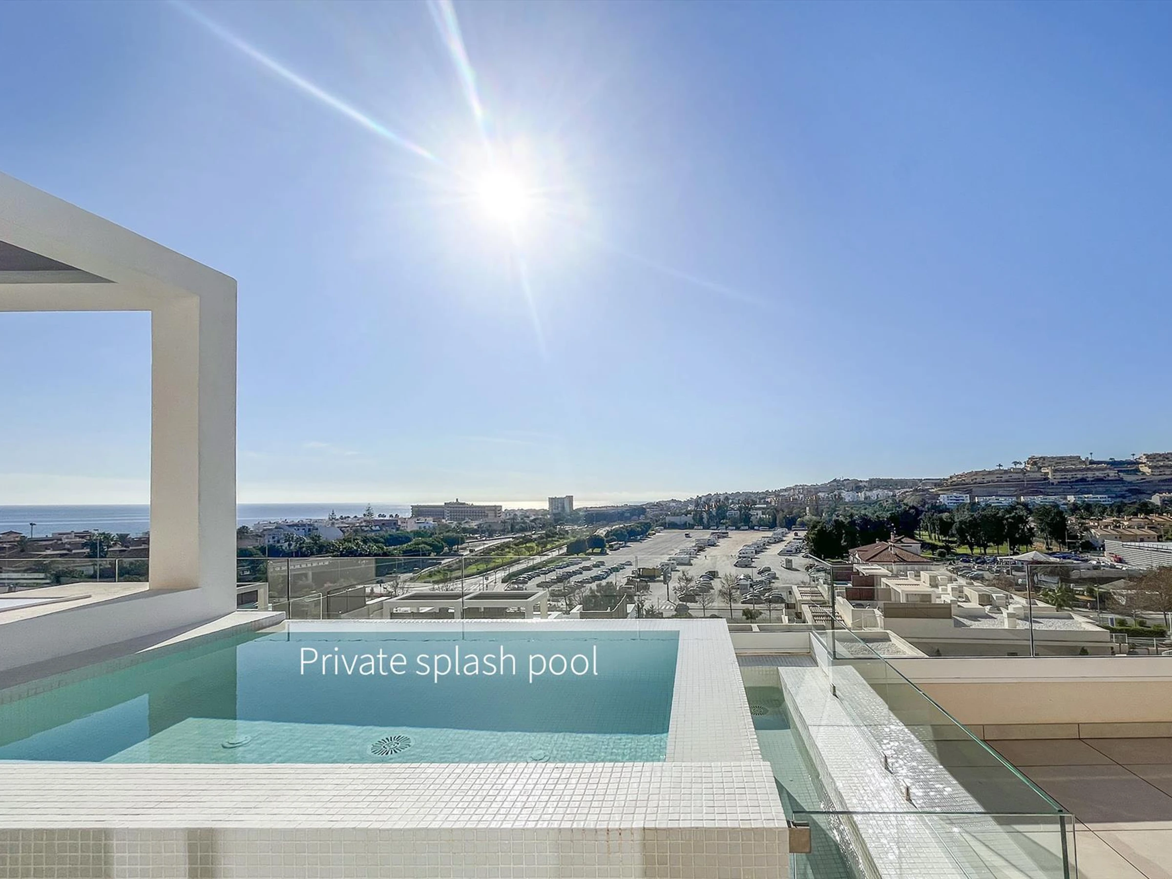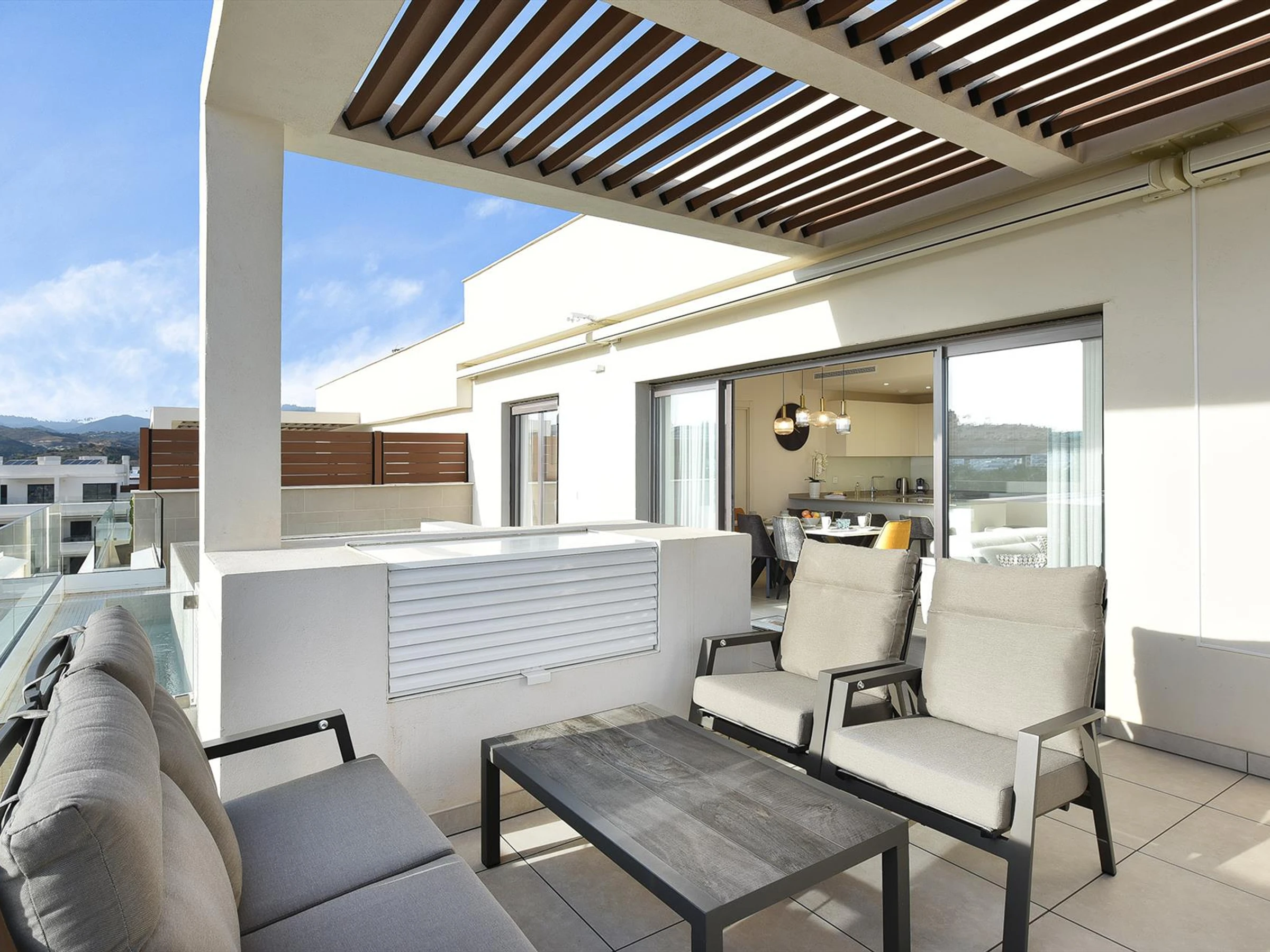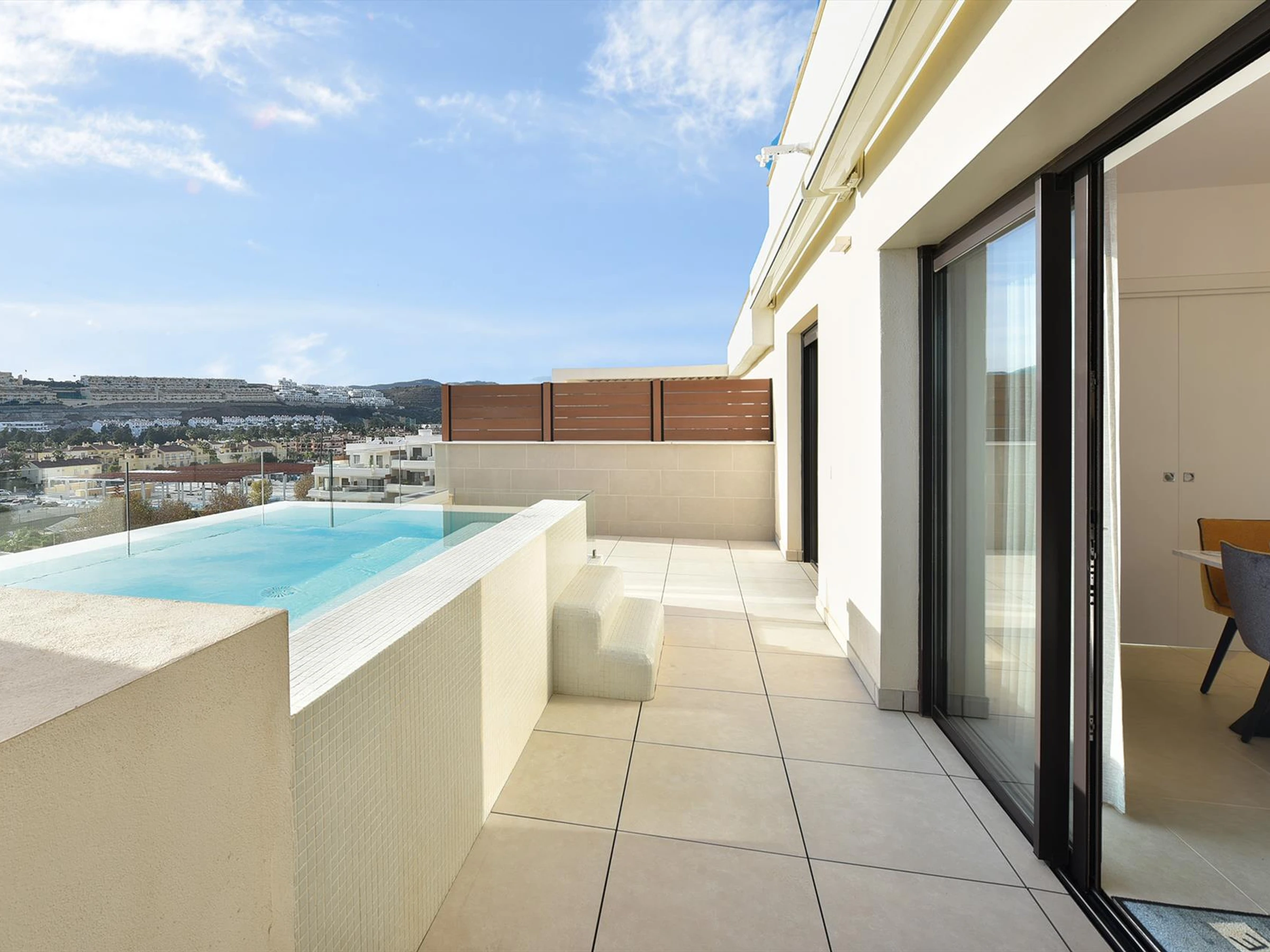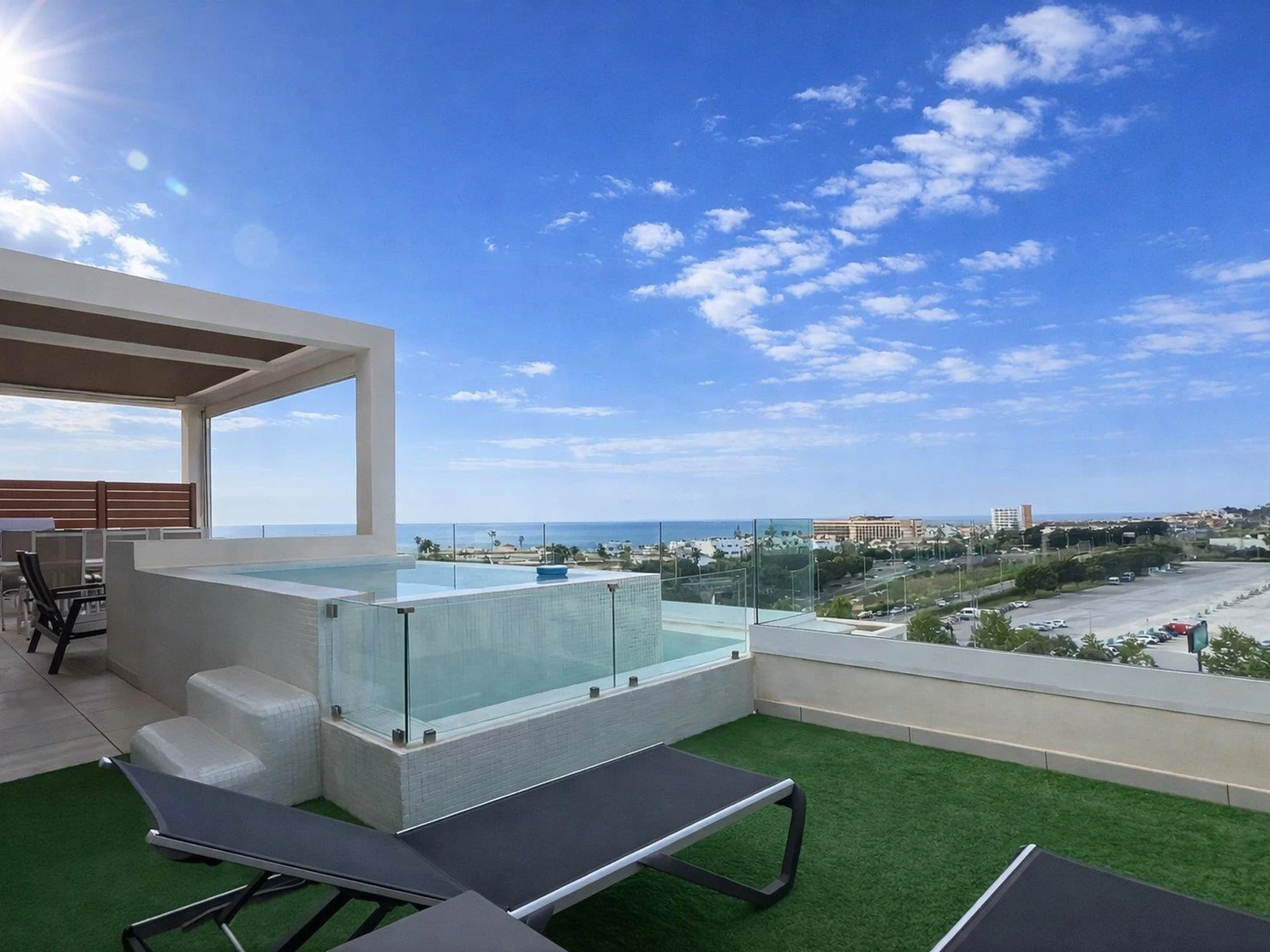 Luxuriöses modernes Ferien-Penthouse mit 3 Schlafzimmern und privatem Planschbecken auf der Terrasse mit Meerblick. Nur 10 Gehminuten vom Strand und der Promenade von La Cala de Mijas und 7 Gehminuten von Geschäften und Restaurants entfernt.