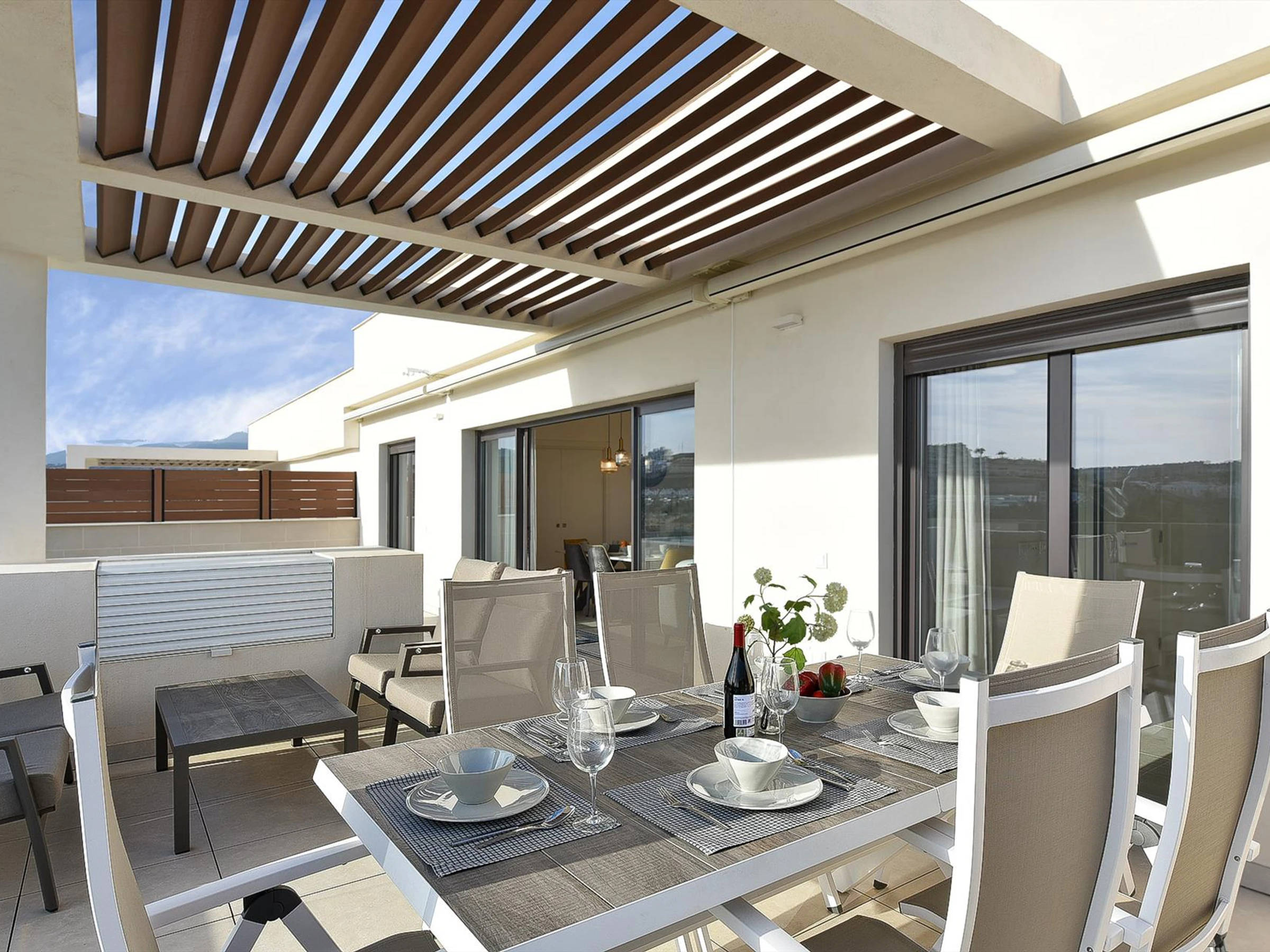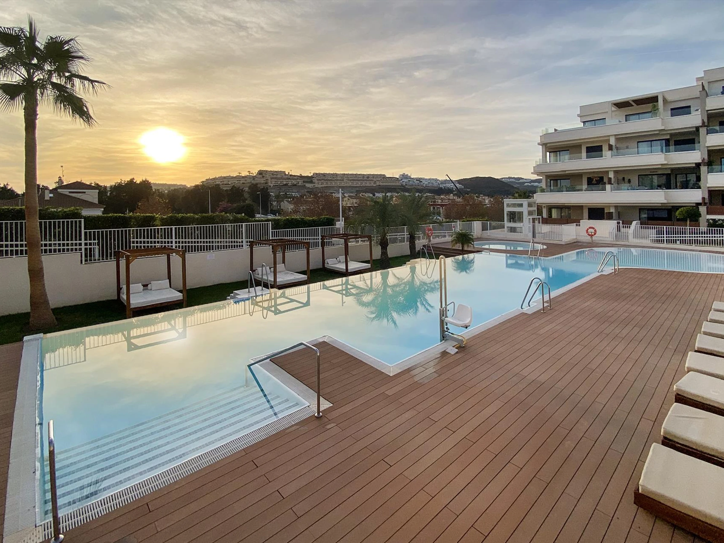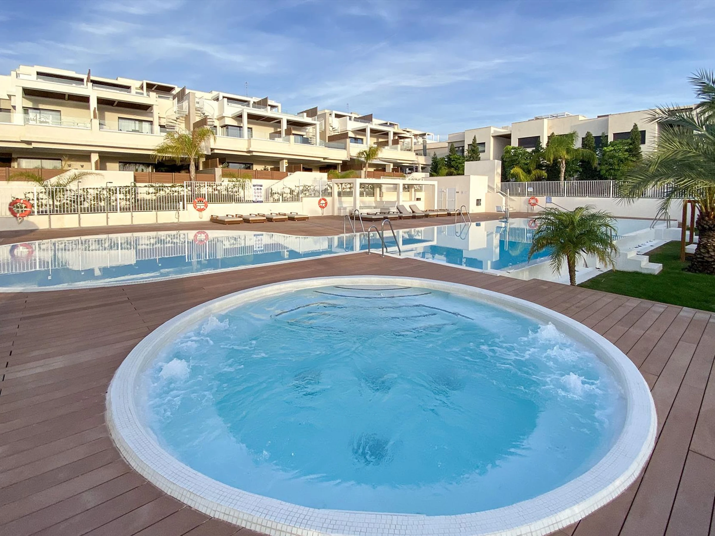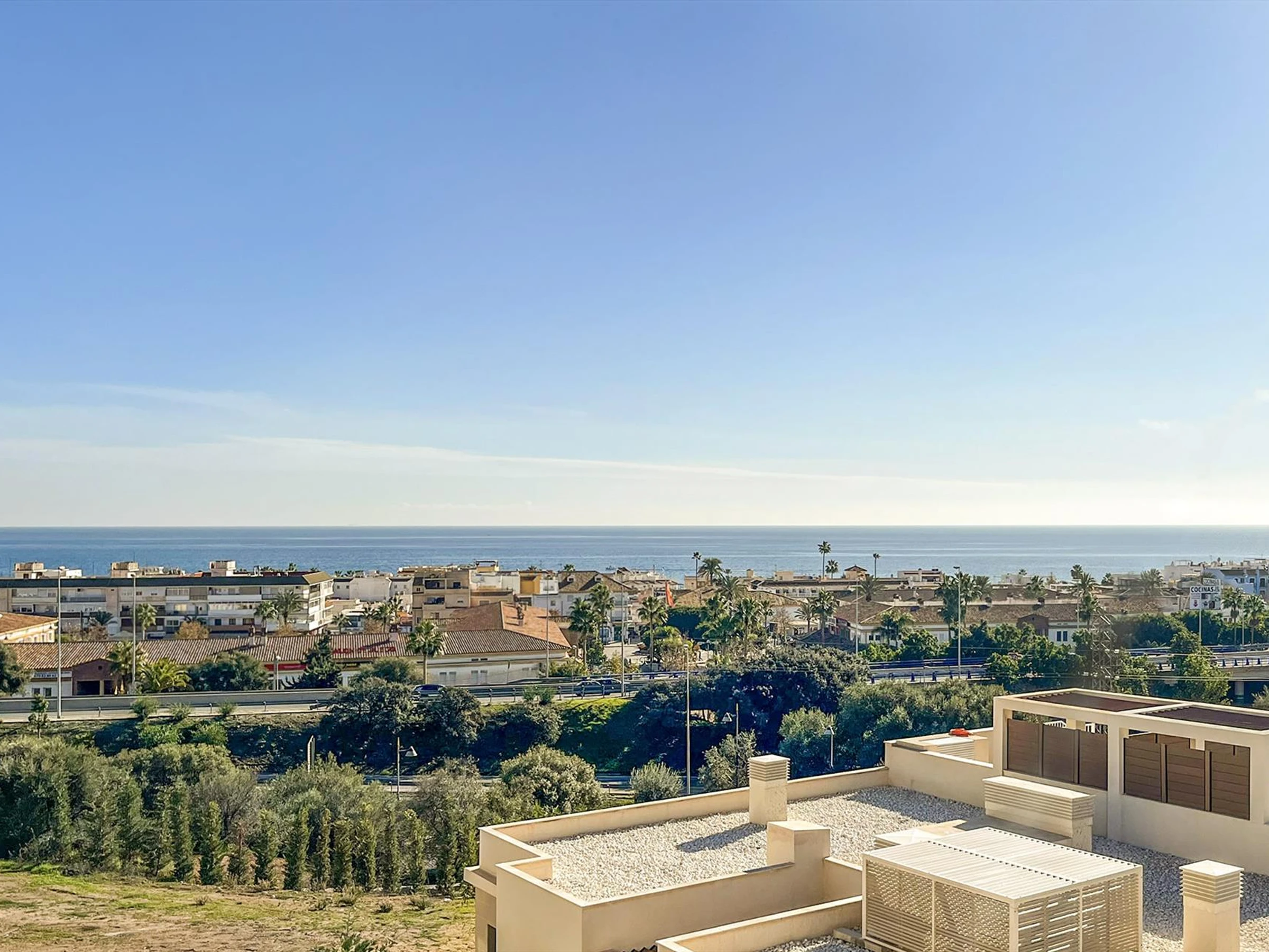 Luxuriöses modernes Ferien-Penthouse mit 3 Schlafzimmern und privatem Planschbecken auf der Terrasse mit Meerblick. Nur 10 Gehminuten vom Strand und der Promenade von La Cala de Mijas und 7 Gehminuten von Geschäften und Restaurants entfernt.
