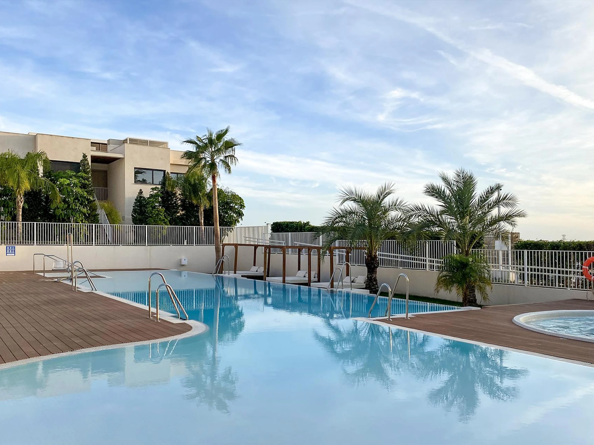 * Gemeinschaftspool umgeben von einer hölzernen Sonnenterrasse mit