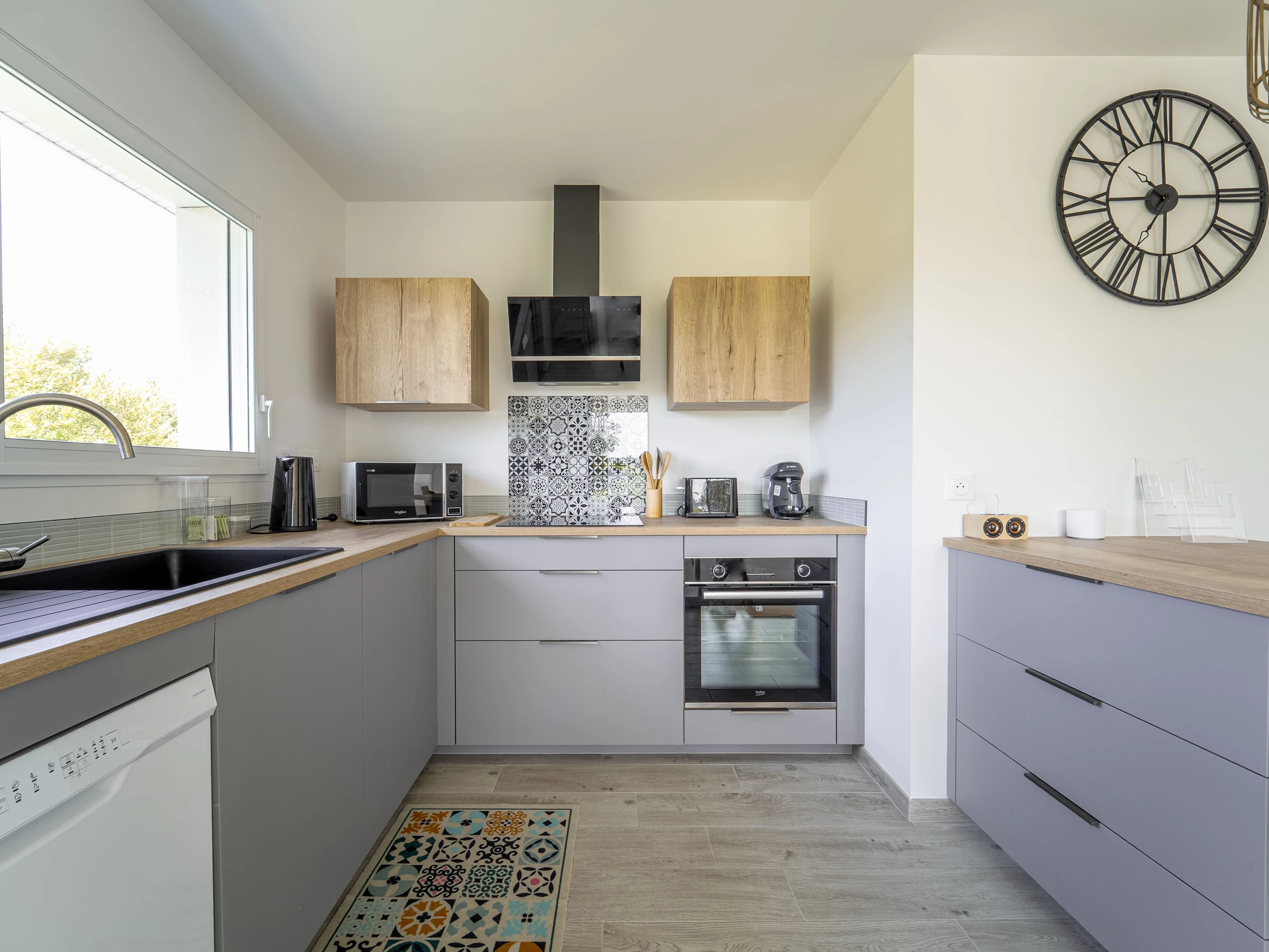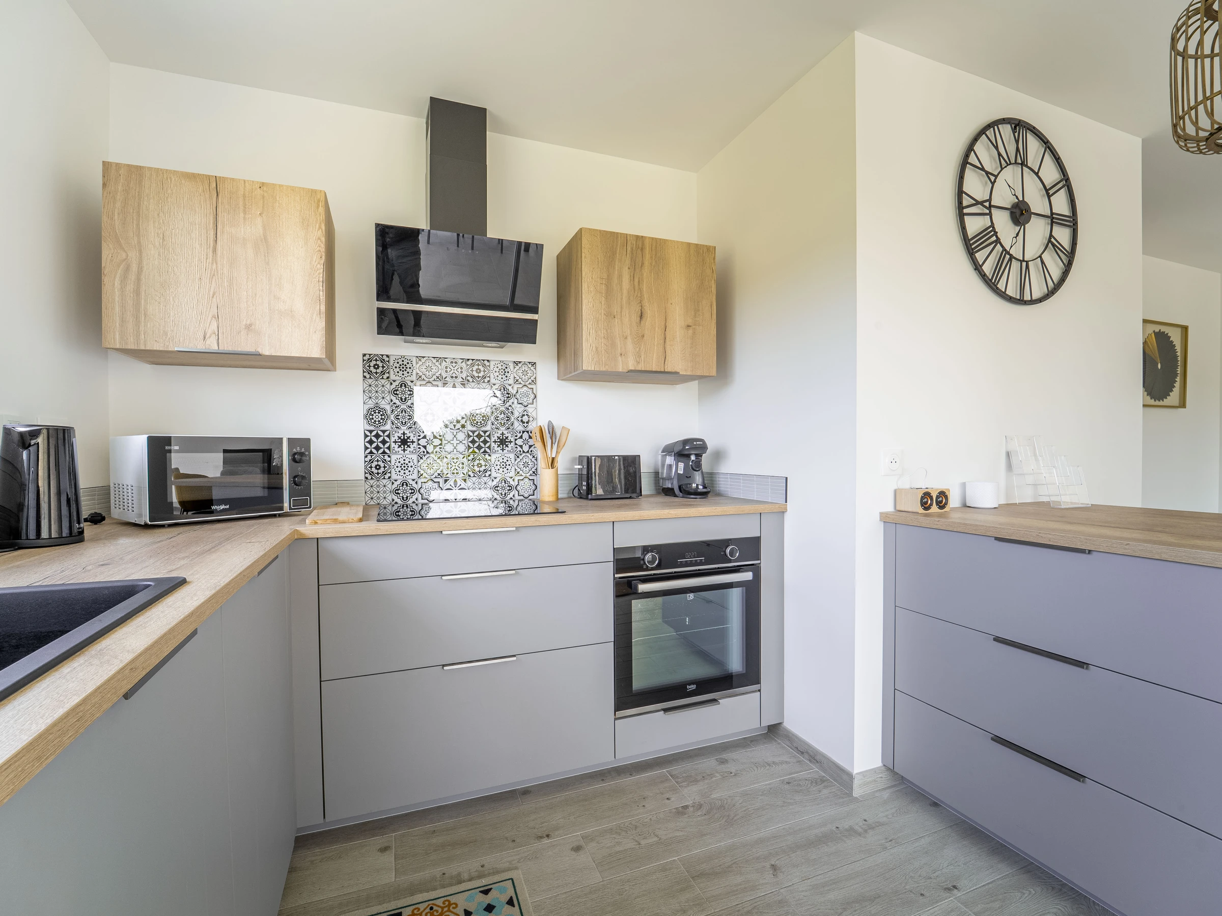 Der helle und einladende Wohnbereich umfasst ein Wohnzimmer mit Sofa und Flachbildfernseher, einen gemütlichen Essbereich und eine voll ausgestattete offene Küche: Kühl-Gefrierkombination, Backofen, Mikrowelle, Geschirrspüler, Kapselkaffeemaschine, Wasserkocher und Toaster stehen Ihnen zur Verfügung. Für Ihren Komfort verfügt das Haus über Glasfaser-Internet und Klimaanlage. Eine Waschküche mit Waschmaschine ist ebenfalls vorhanden.