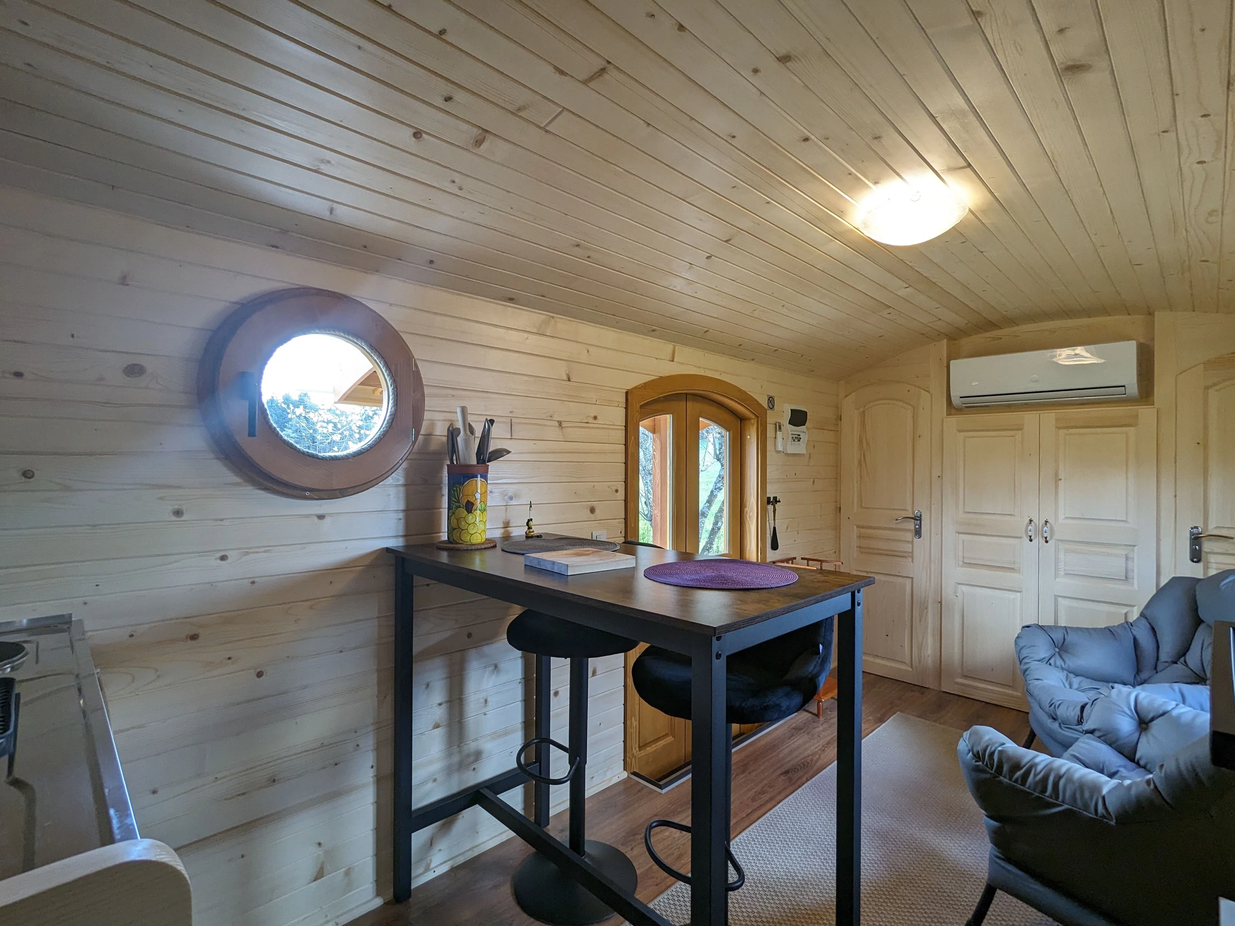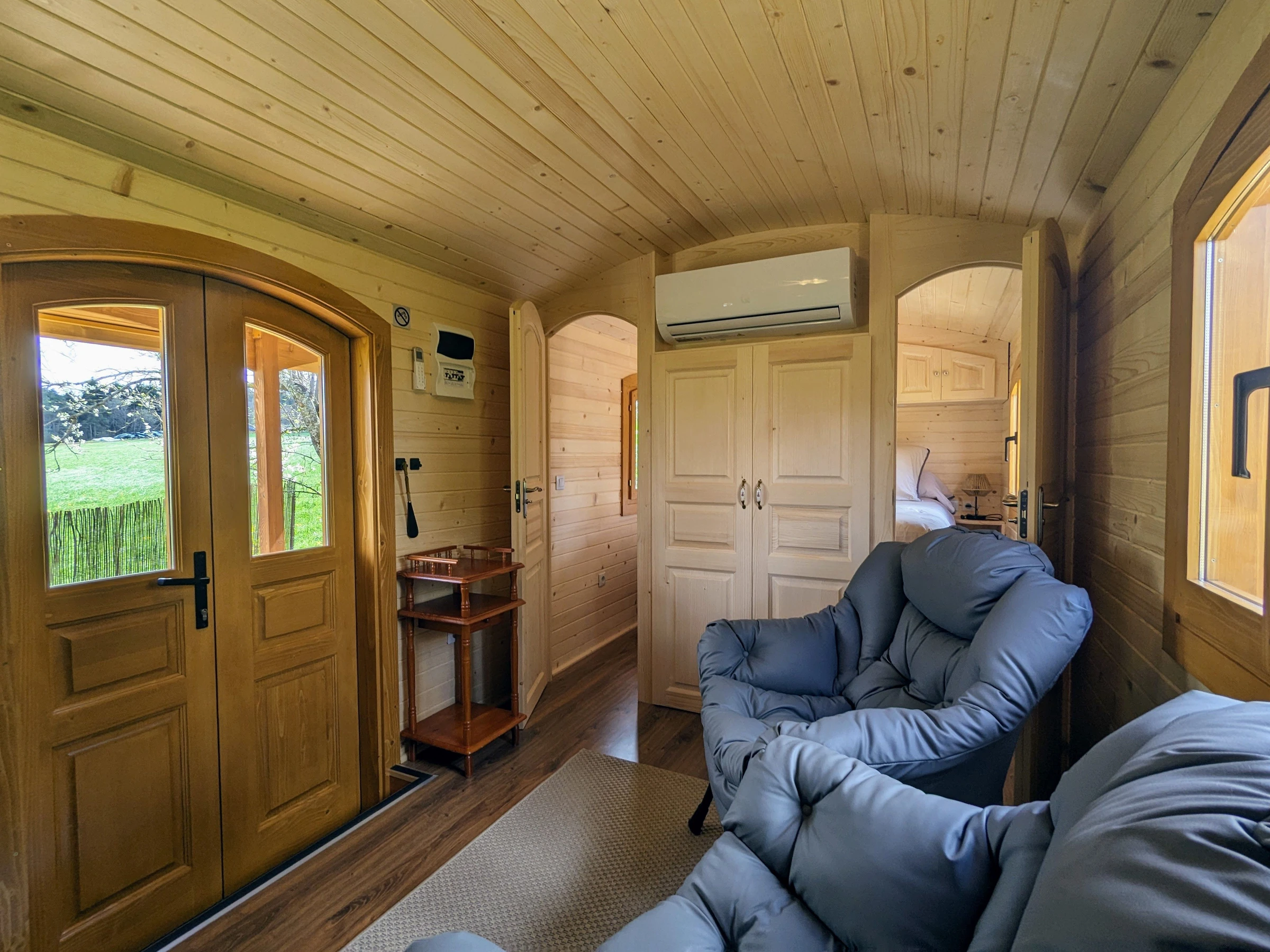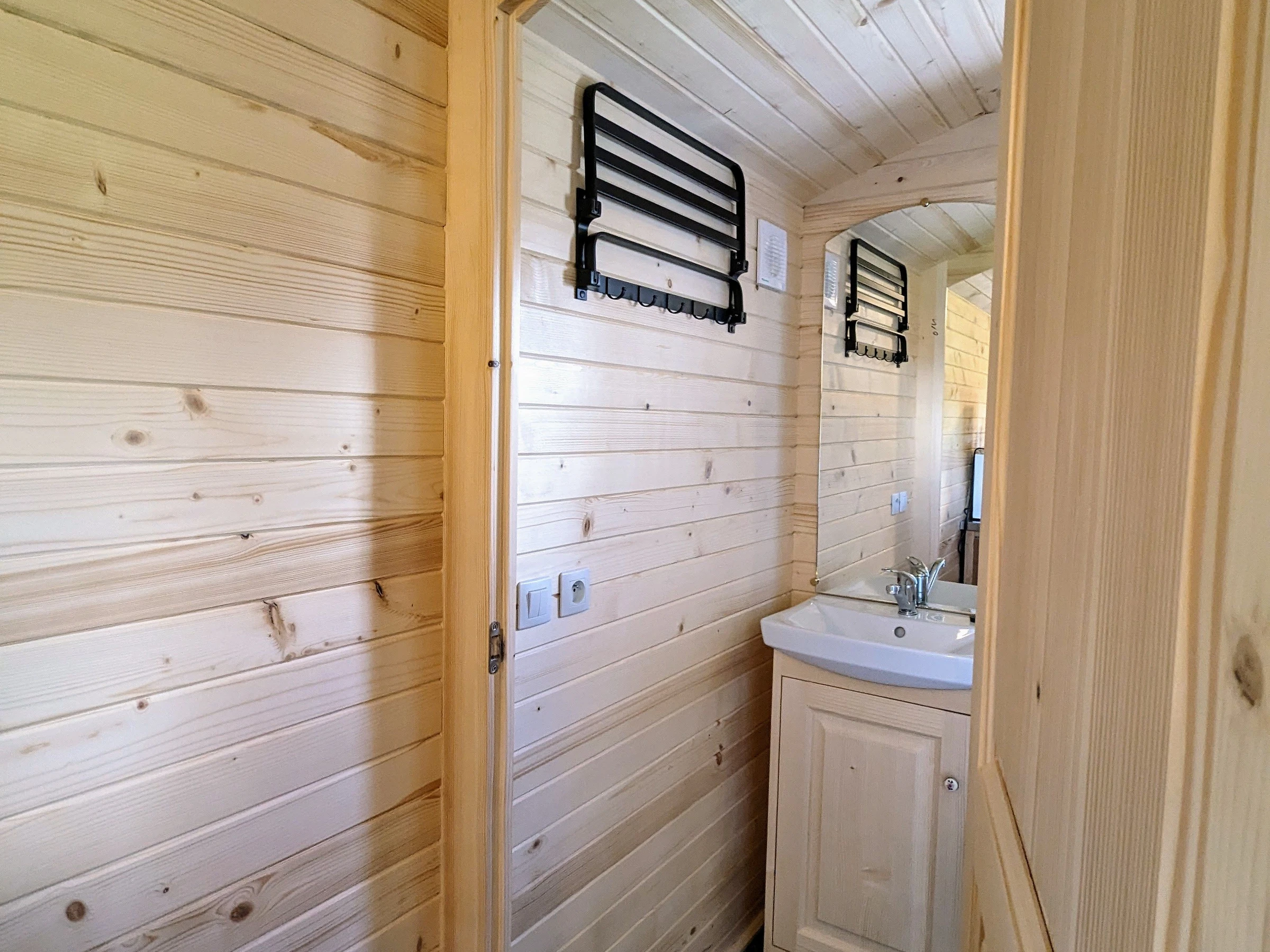 Der Innenbereich ist perfekt ausgestattet und verfügt über ein Schlafzimmer mit Stauraum, ein kleines Wohnzimmer mit Kochnische und ein Badezimmer. Vor Ort genießen Sie die Ruhe der Landschaft, das Spa: den norwegischen Whirlpool (optional) und Spaziergänge.