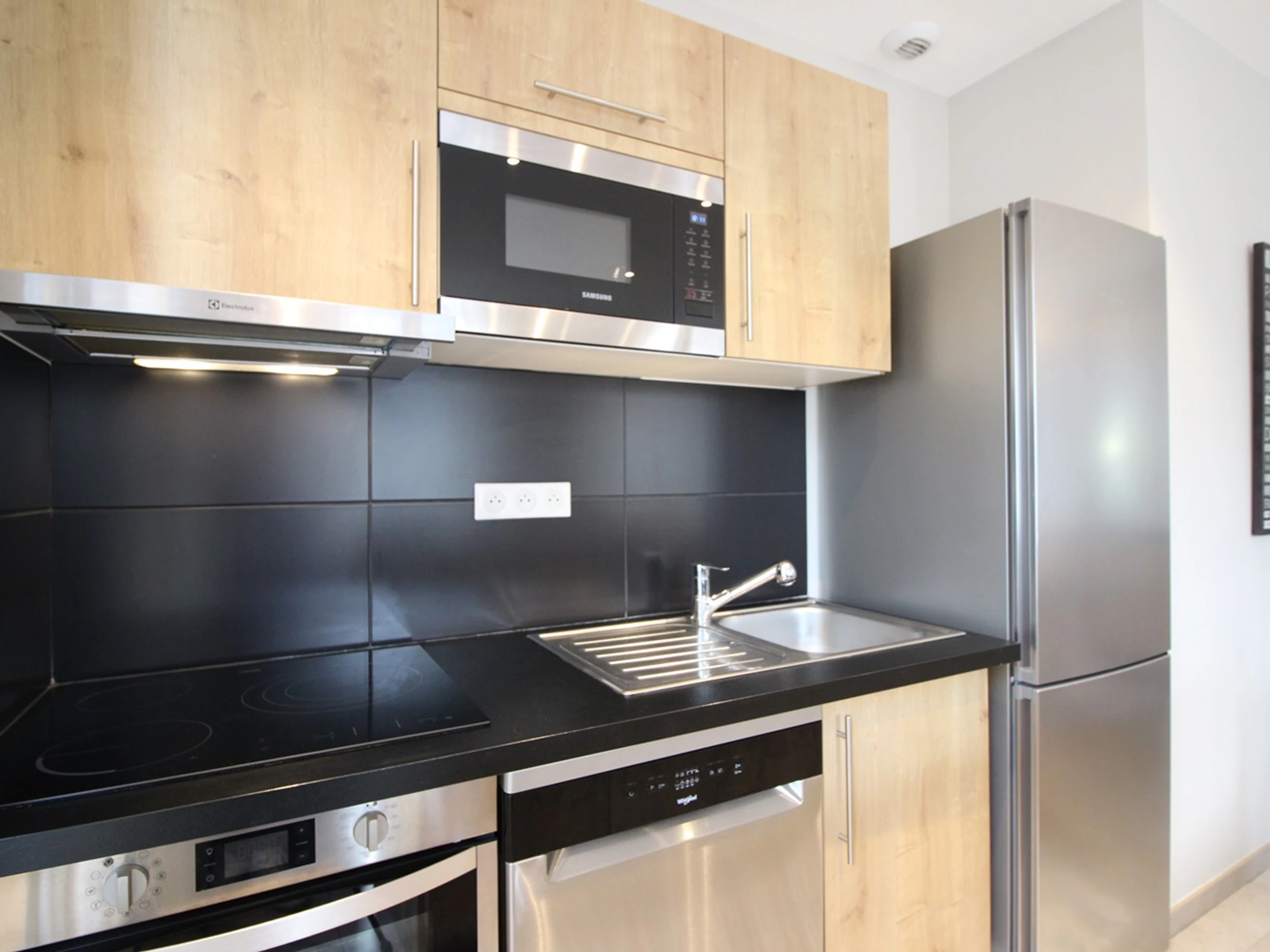 Eine Küche ausgestattet mit Induktionskochfeld, Backofen, Dunstabzugshaube, Mikrowelle, großem Kühlschrank mit Gefrierfach, Geschirrspüler usw.