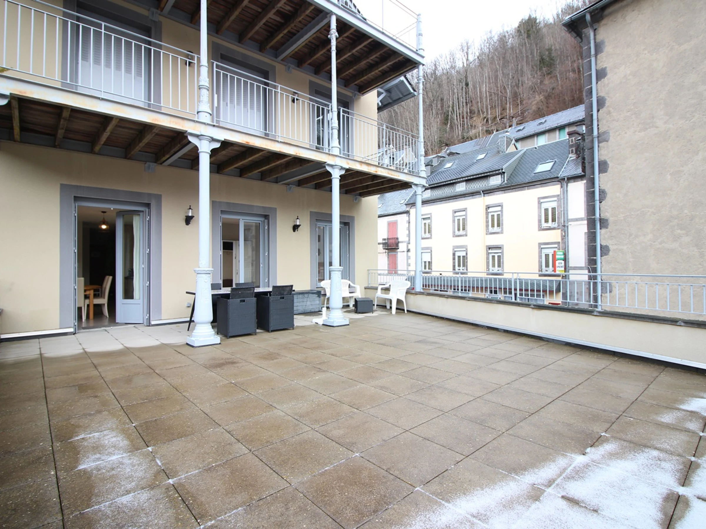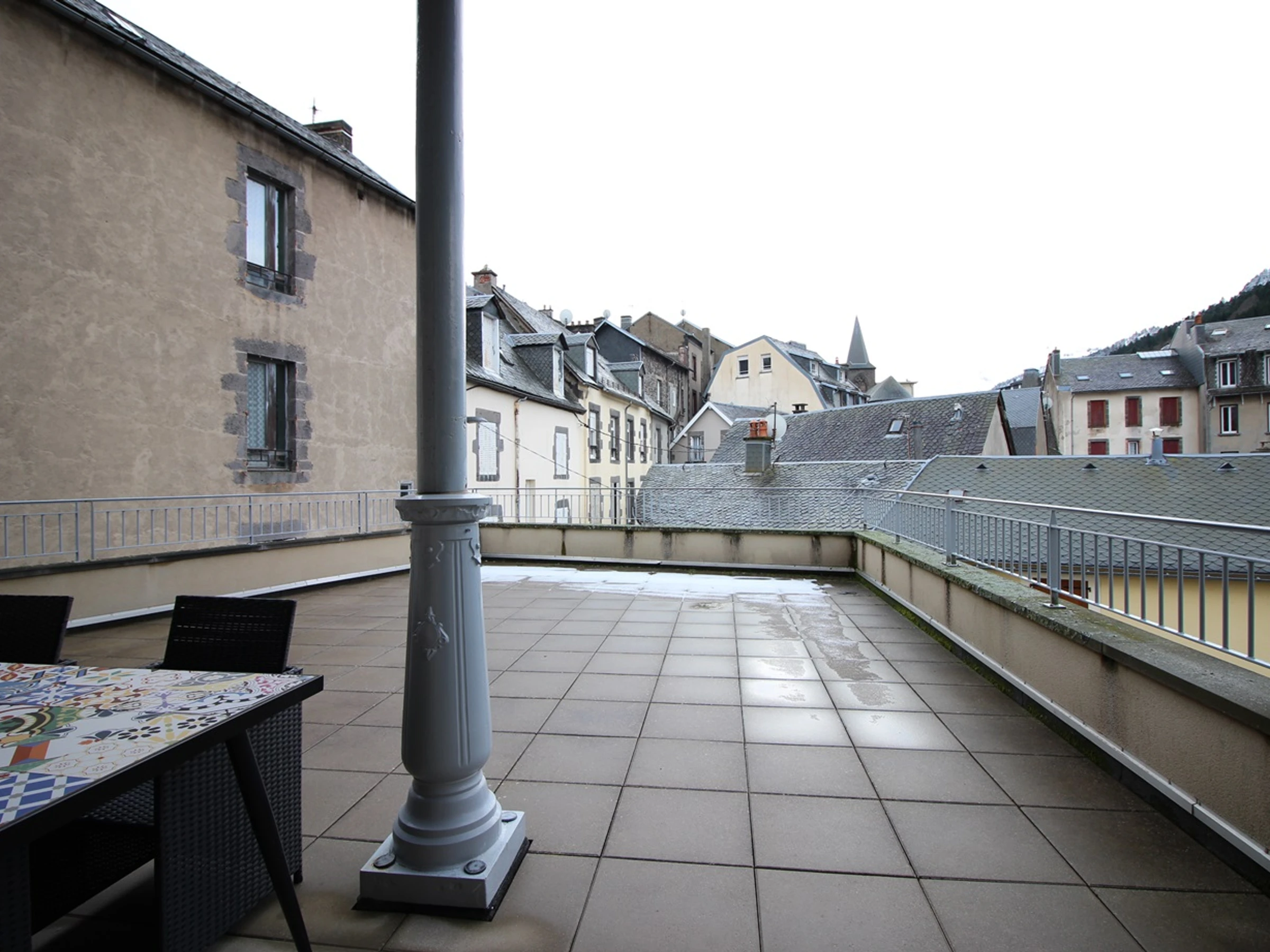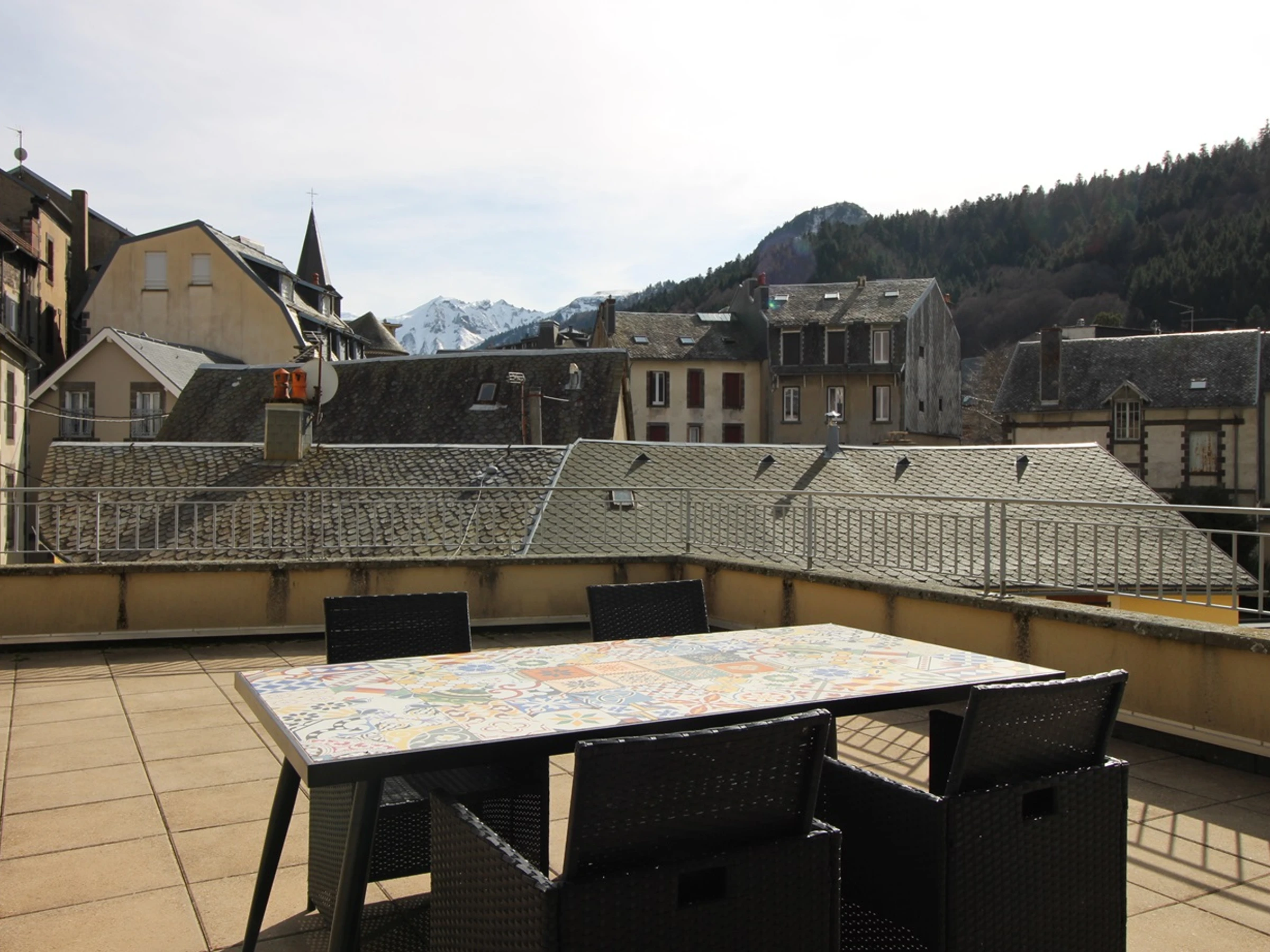 Das Apartment liegt im 2. Stock eines Wohnhauses mit Aufzug und besteht aus einem Wohnzimmer mit einem 25 m² großen Schlafsofa und Zugang zu einer 60 m² großen Südterrasse mit herrlichem Blick auf den Sancy.