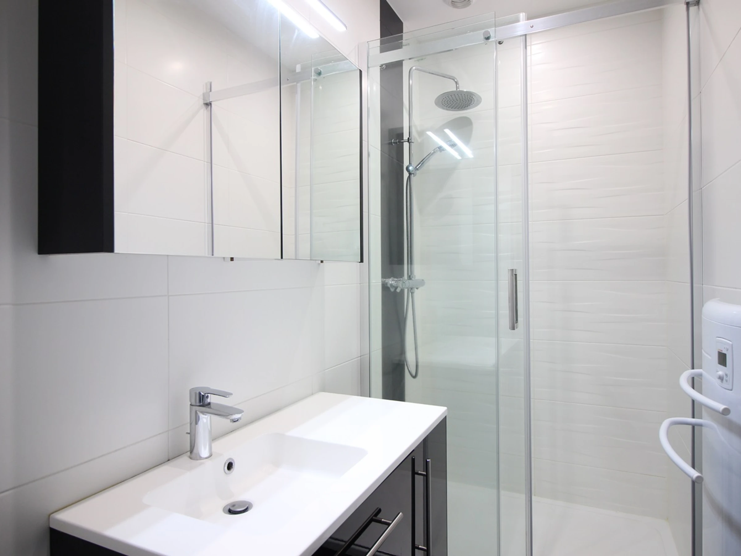 Ein Badezimmer (Dusche) mit Handtuchtrockner, Waschmaschine und Wäschetrockner.