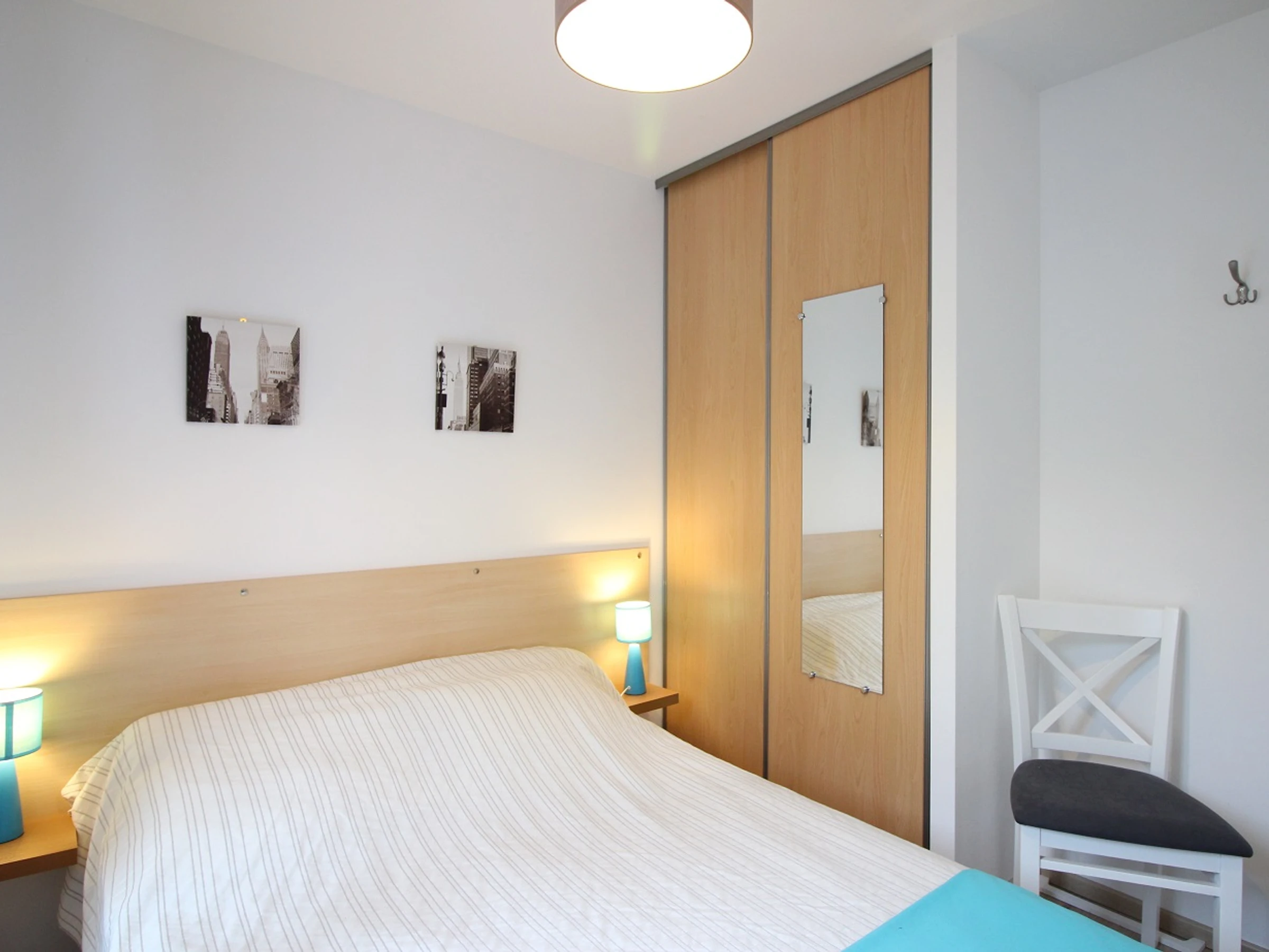Zwei Schlafzimmer, eines mit einem 140 cm breiten Bett, das andere mit einem 160 cm breiten Bett und ein drittes Schlafzimmer mit Etagenbetten (2x90),