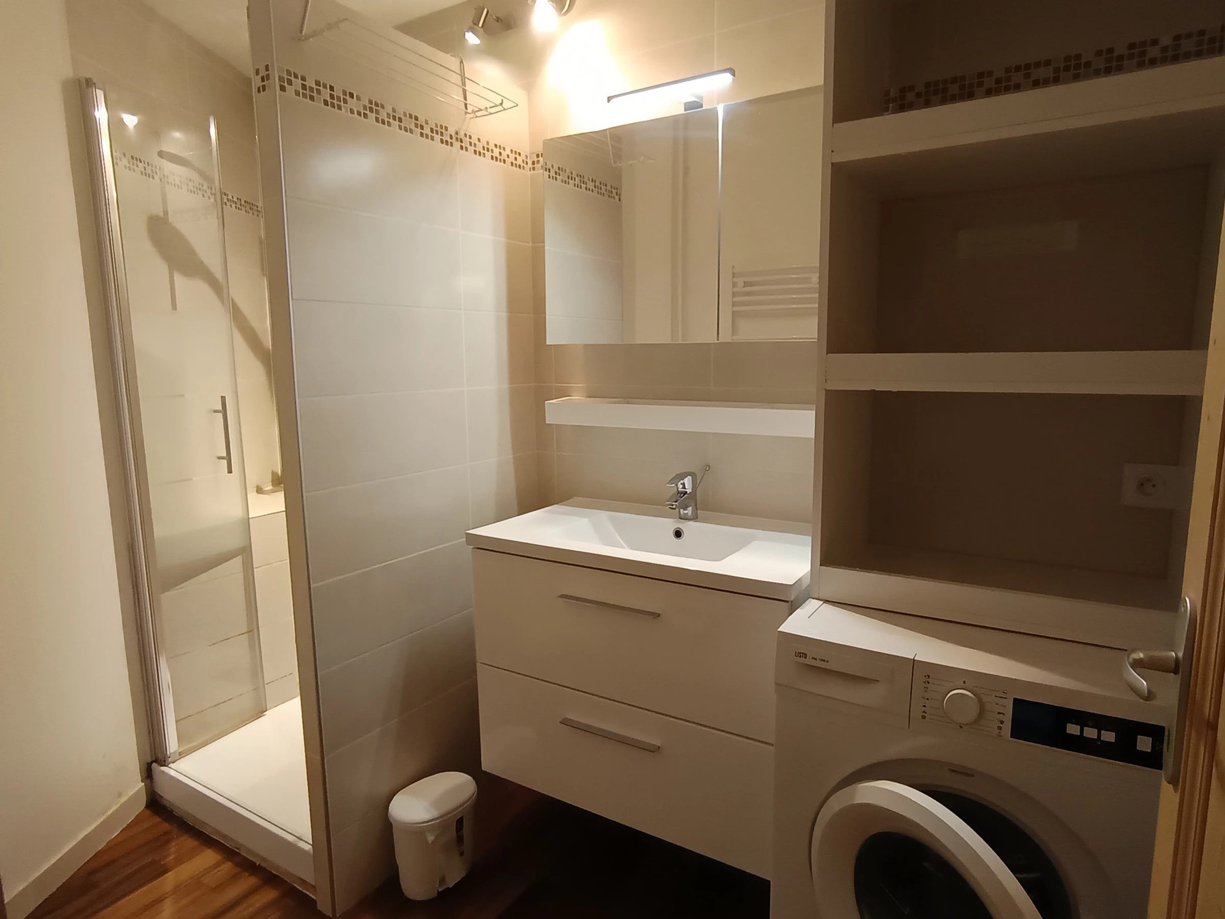Badezimmer: Duschkabine mit Duschabtrennung, Waschbecken, großer Spiegel, Waschmaschine, elektrischer Handtuchtrockner, Stauraum, Bügeleisen.