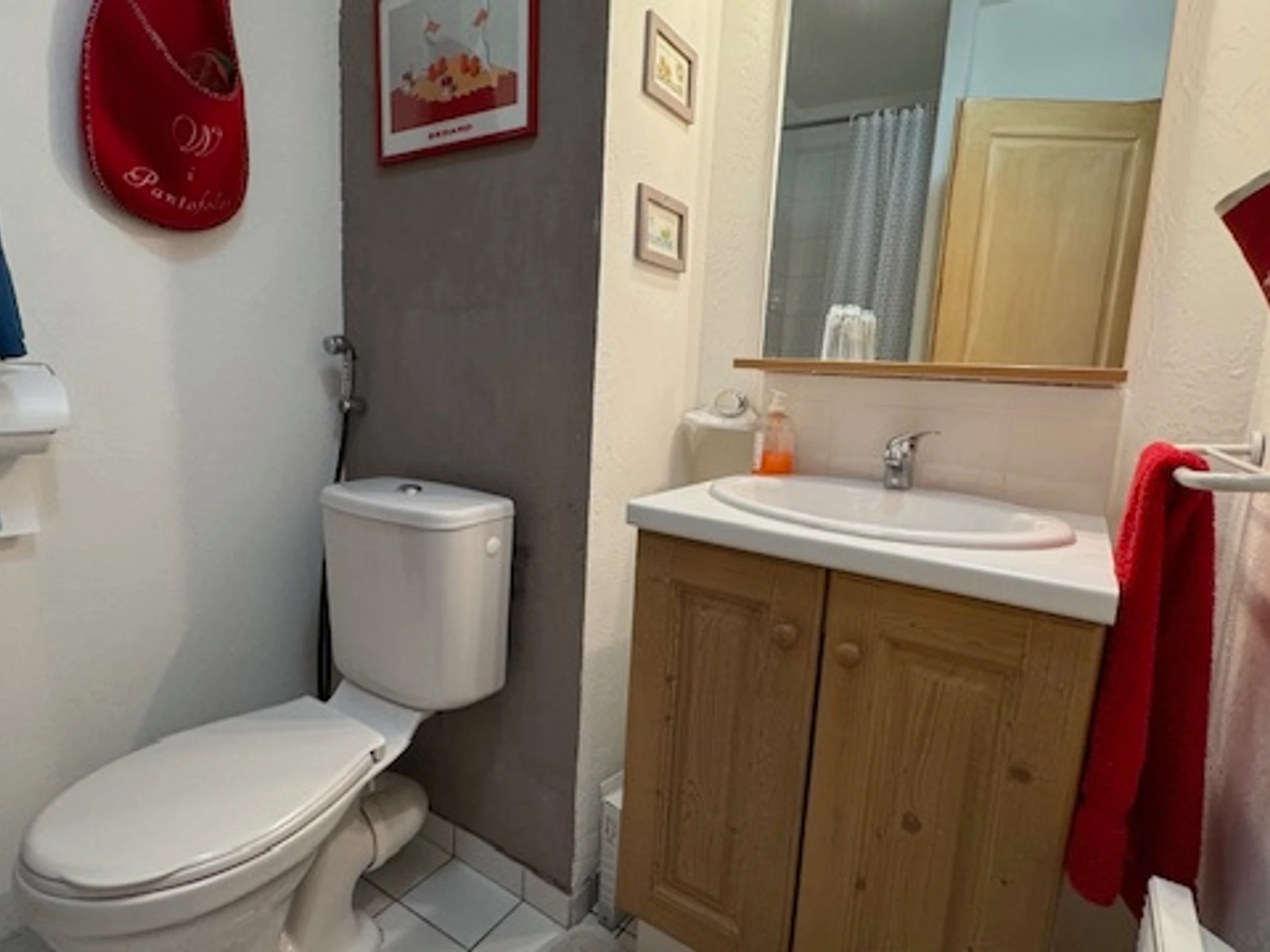 Badezimmer: Duschkabine mit Duschvorhang, Waschtisch mit Waschbecken, Schrank, großer Spiegel, Föhn, WC.