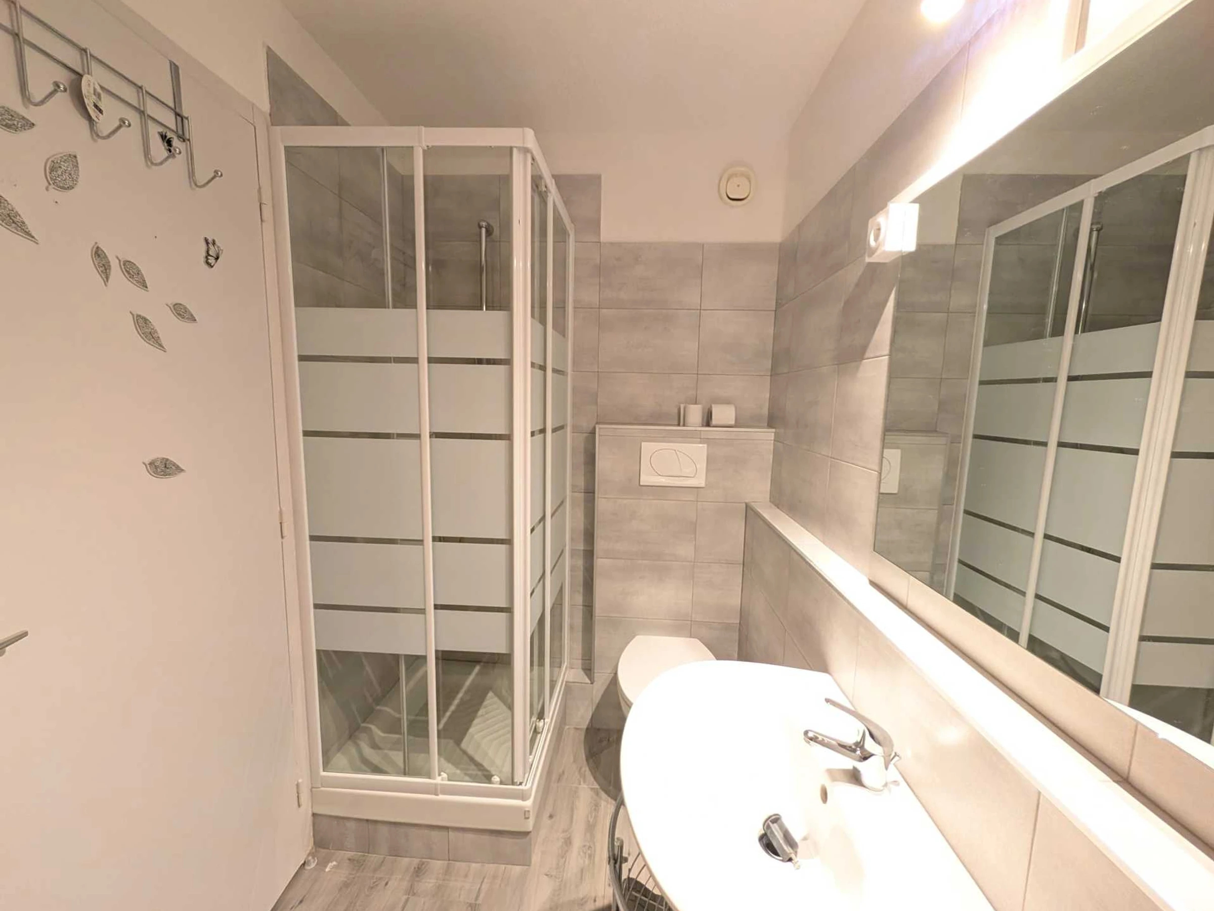 Badezimmer: Duschkabine mit Duschwand, Waschbecken, Bidet, WC, Handtuchhalter, elektrischer Heizkörper