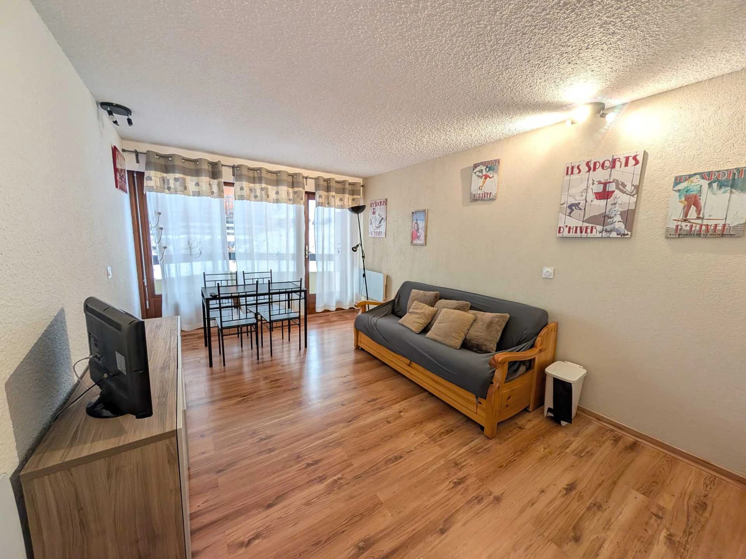 Wohnzimmer: Möbel mit TV, Sofa, Couchtisch, Essbereich mit Tisch und Stühlen für 4 Personen.