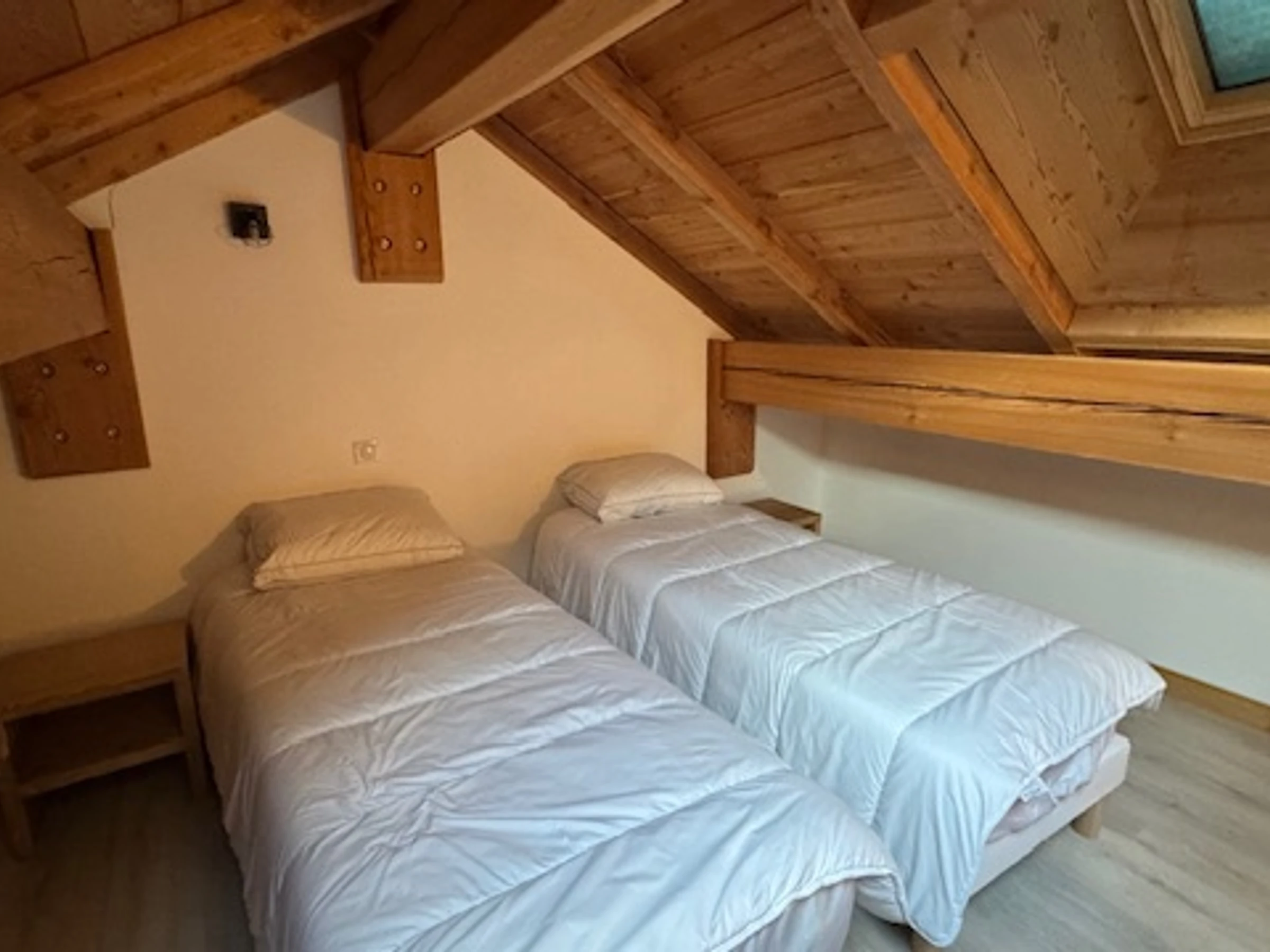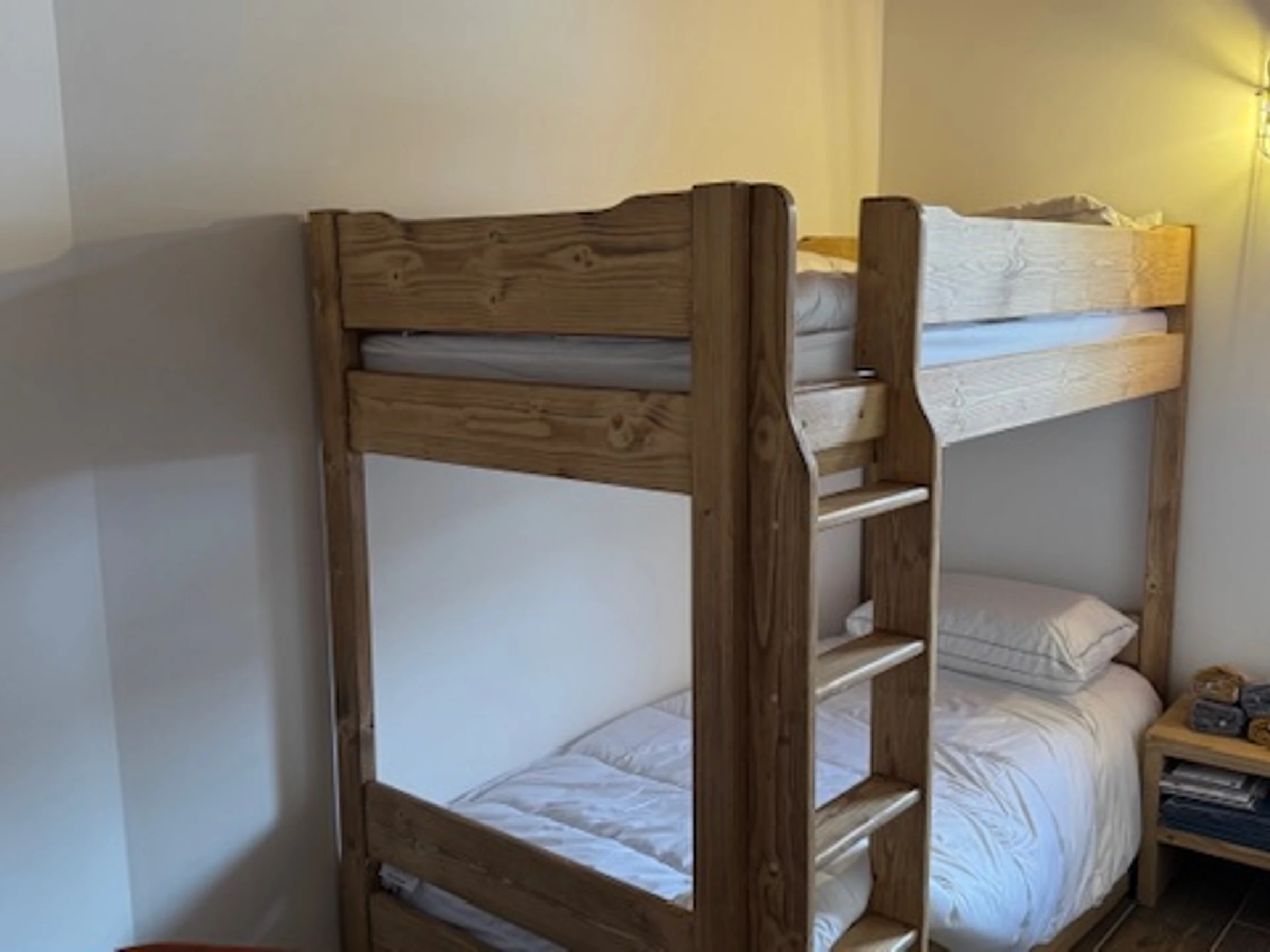 Großes, zweistöckiges Zwischengeschoss im Berghüttenstil mit 2 Einzelbetten, ausgestattet mit Bettdecke, Kissen und Matratzenschoner.