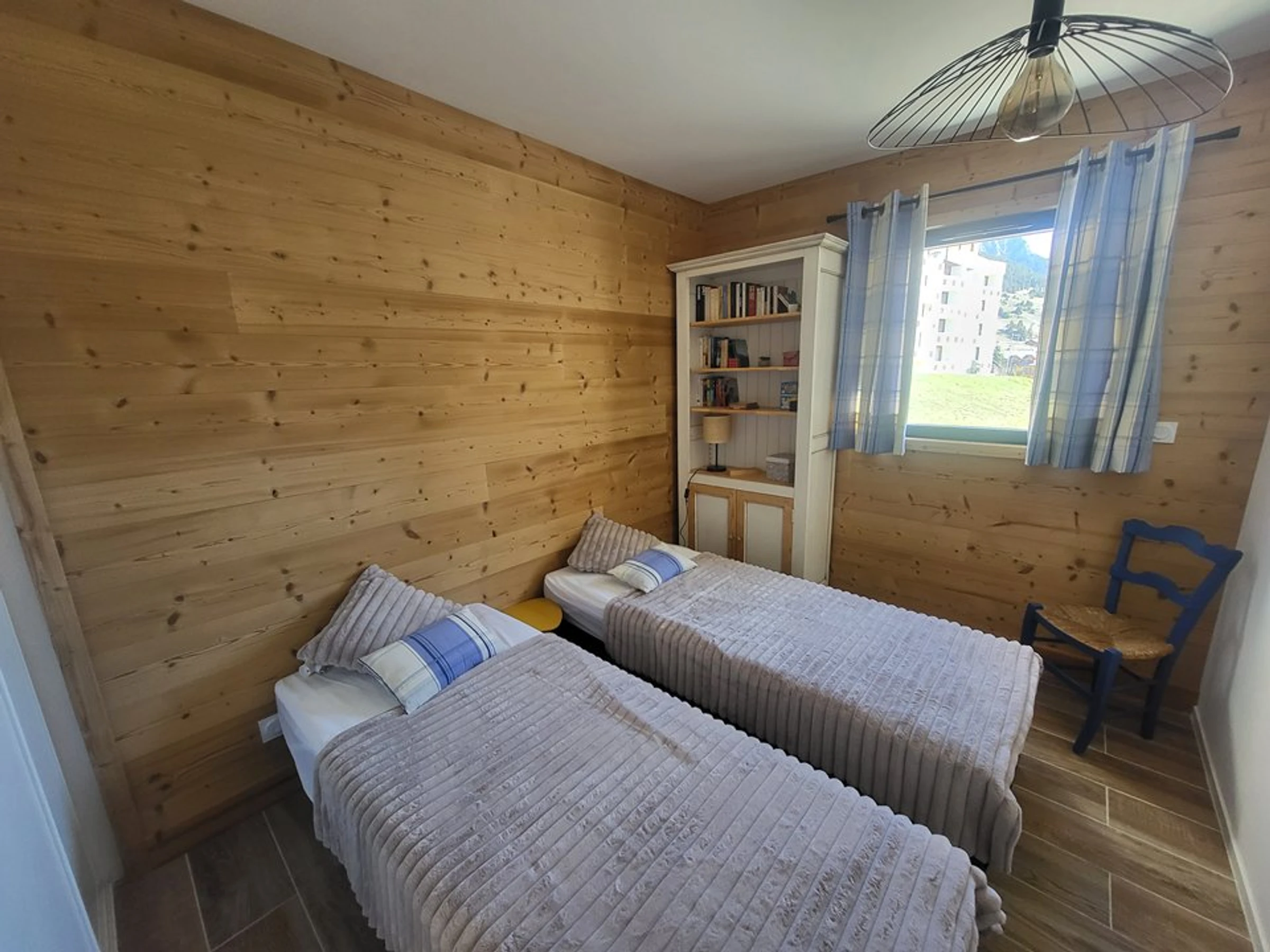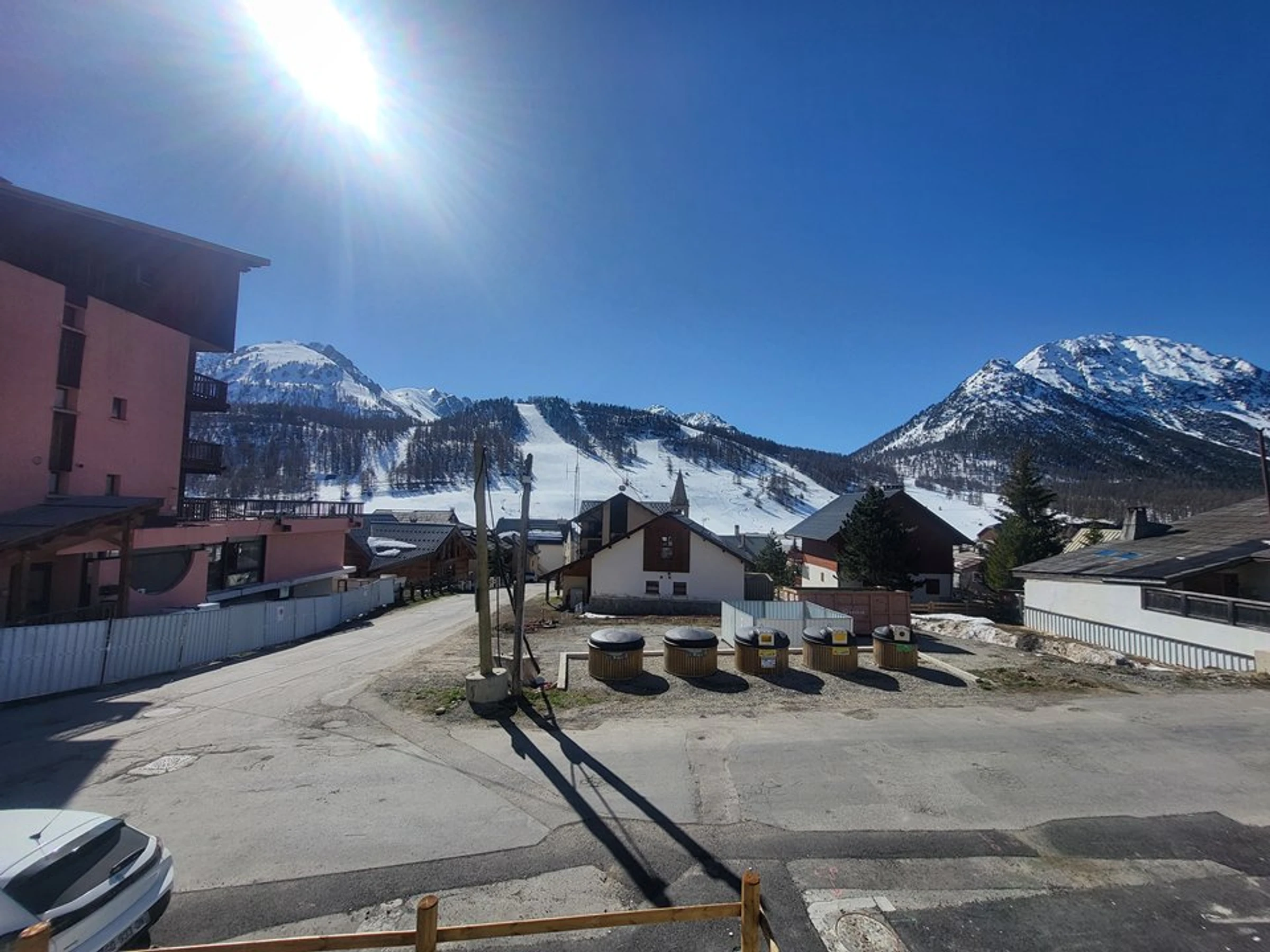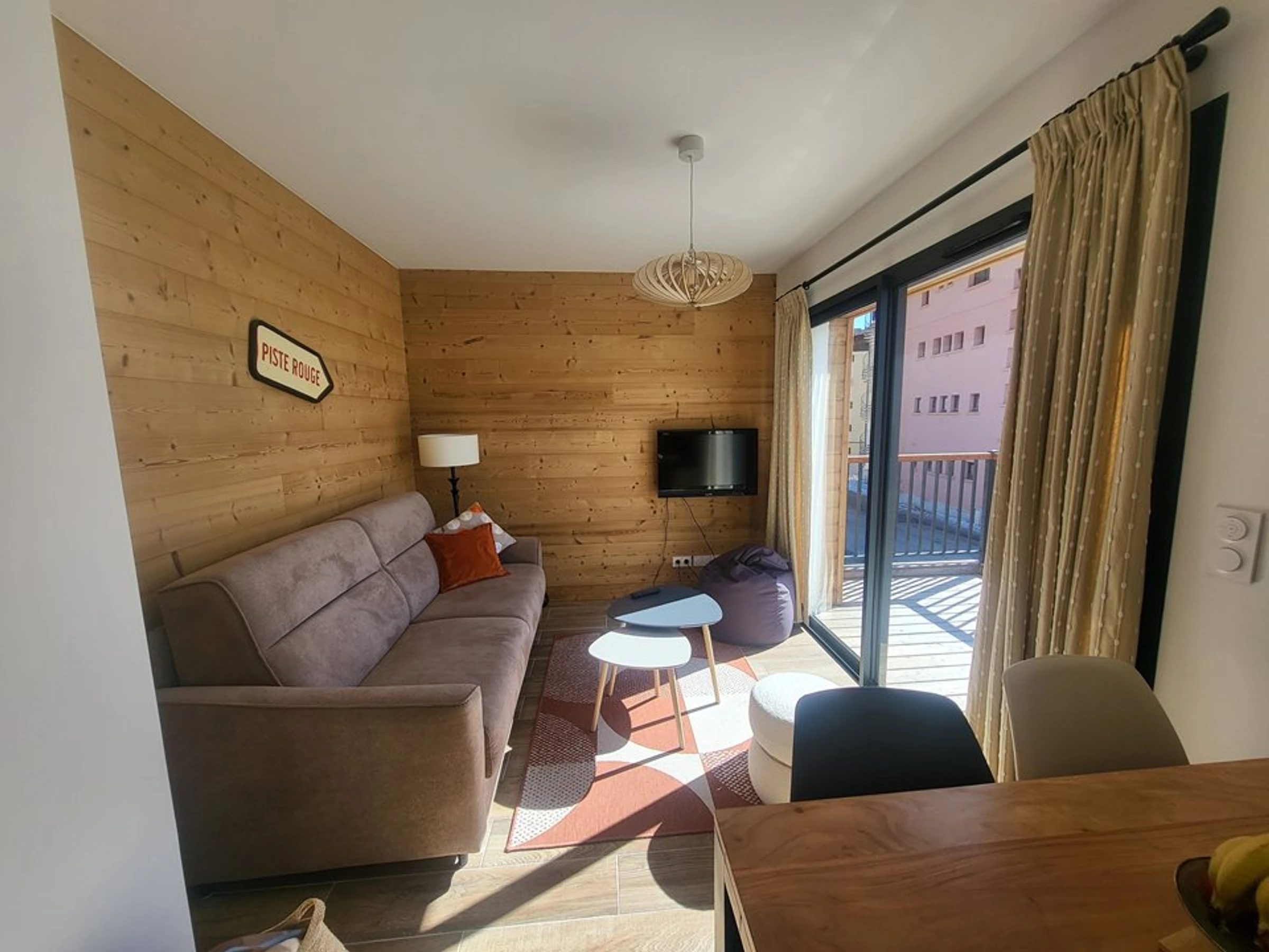 - einem Wohnzimmer mit einem Einzelschlafsofa im Rapido-Stil und Fernseher sowie Zugang zu einem möblierten Südbalkon mit Blick auf das Dorf und die Pisten,