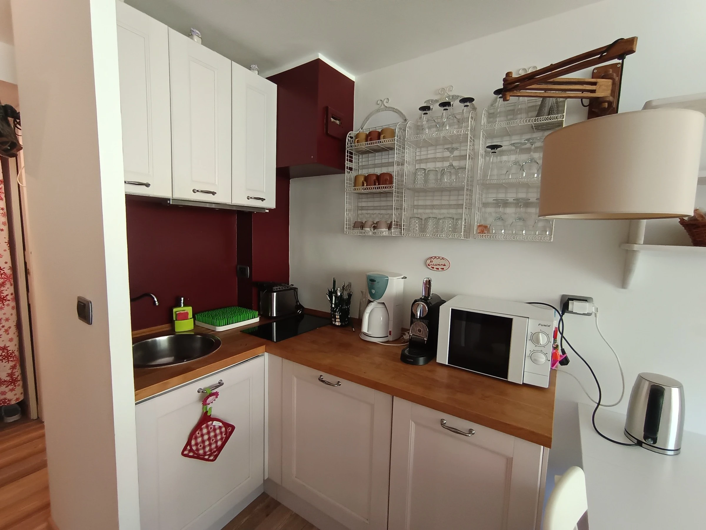 Kitchenette: a top-of-the-range refrigerator, two ceramic hobs, a microwave, a dishwasher, a filter coffee maker, a toaster, a kettle, kitchen accessories and utensils. Living room: Television, sofa, various furniture, balcony access, dining area with table and chairs for 4 people