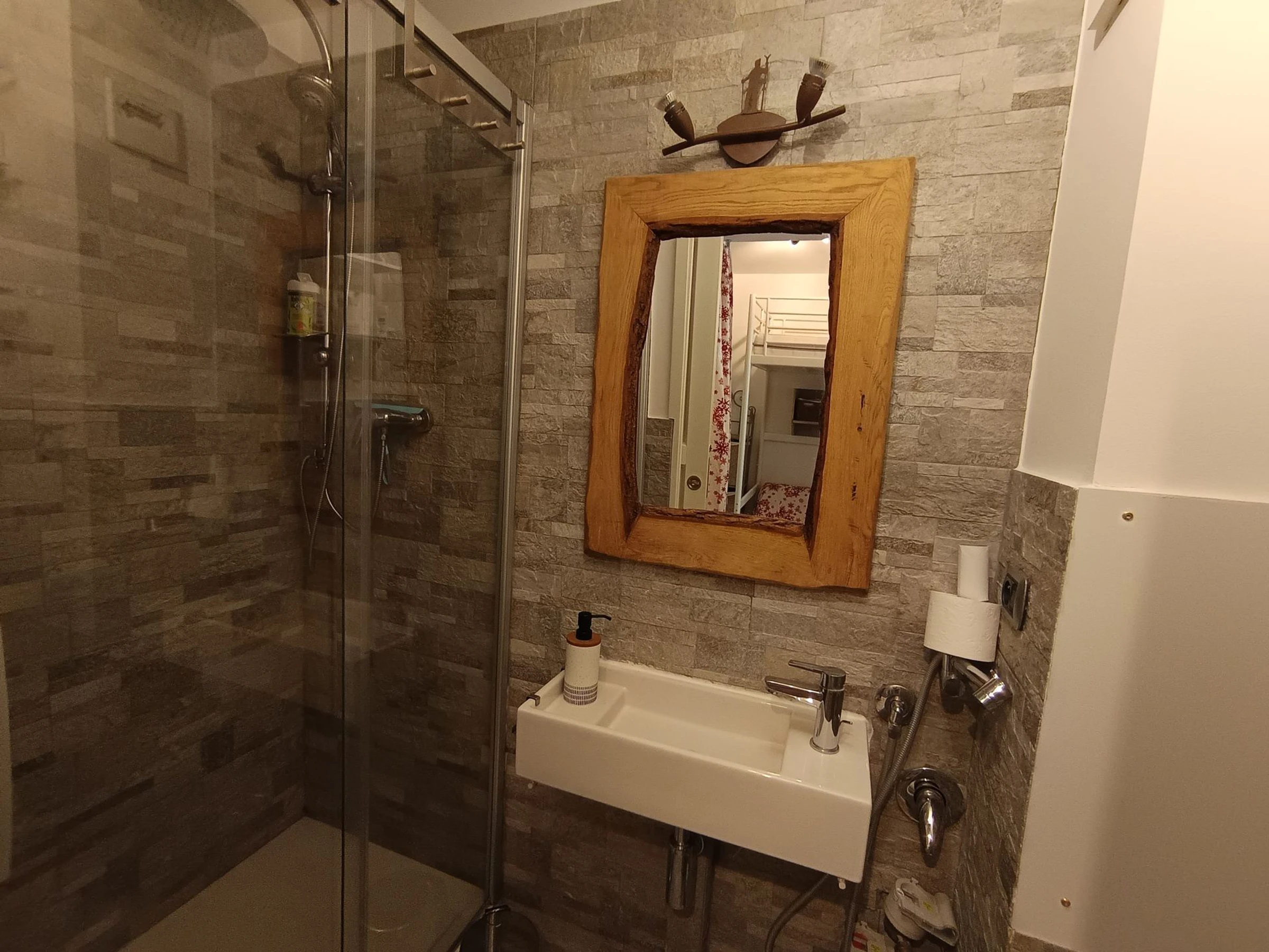 Bathroom: Walk-in shower with shower screen, sink, mirror, toilet