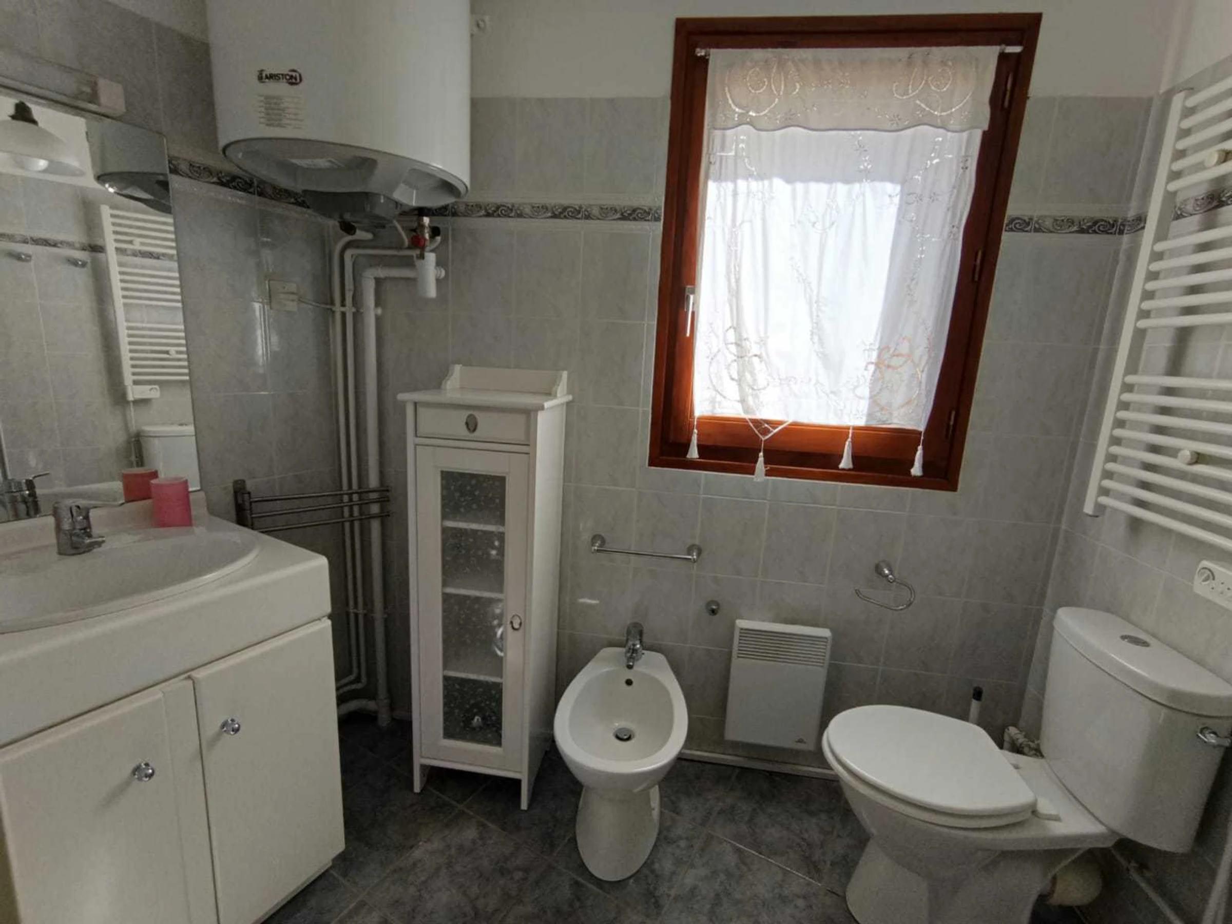 Bathroom: Shower cubicle with shower screen, toilet, bidet, sink, wall-mounted electric towel dryer, storage, and window.