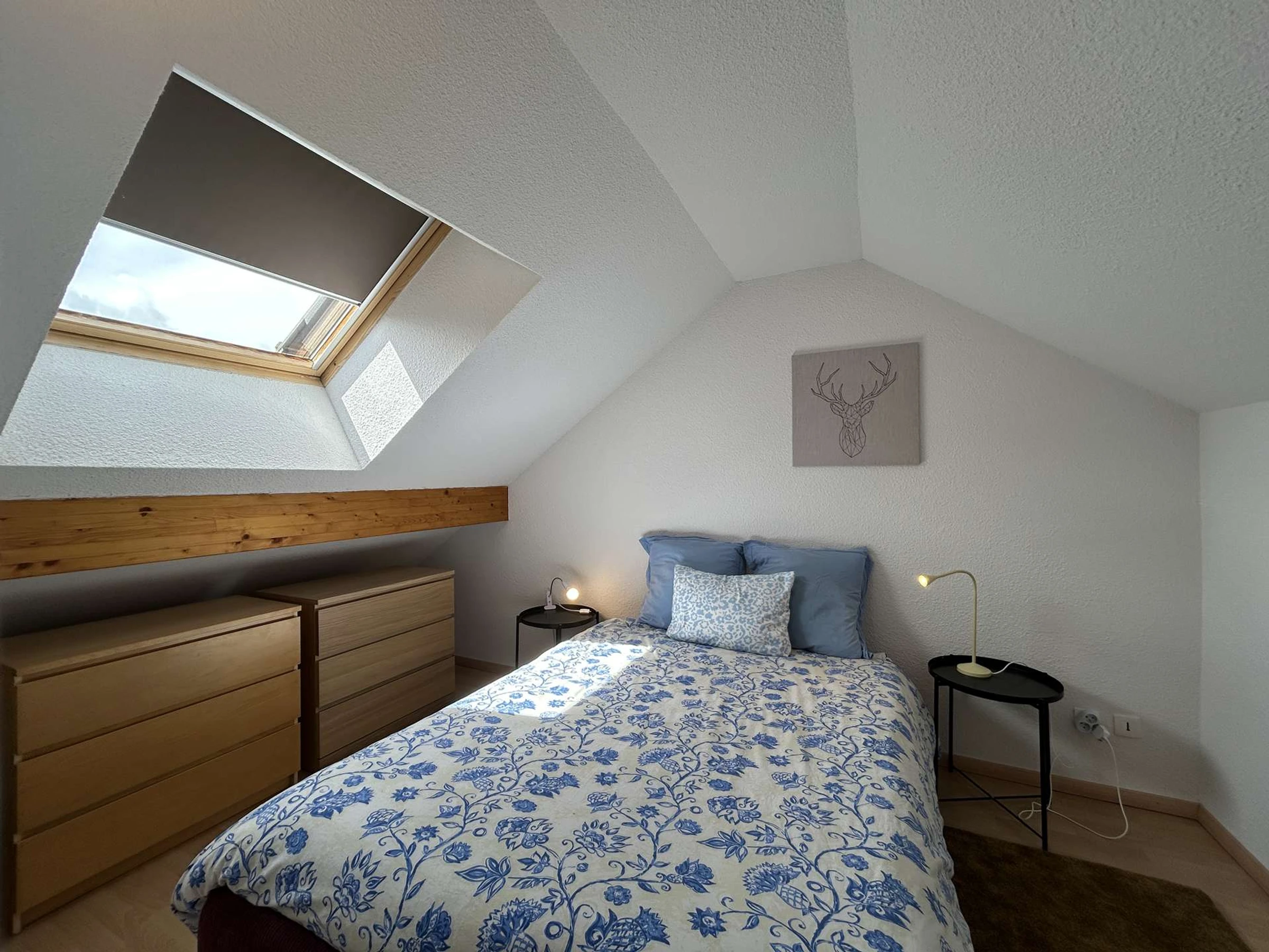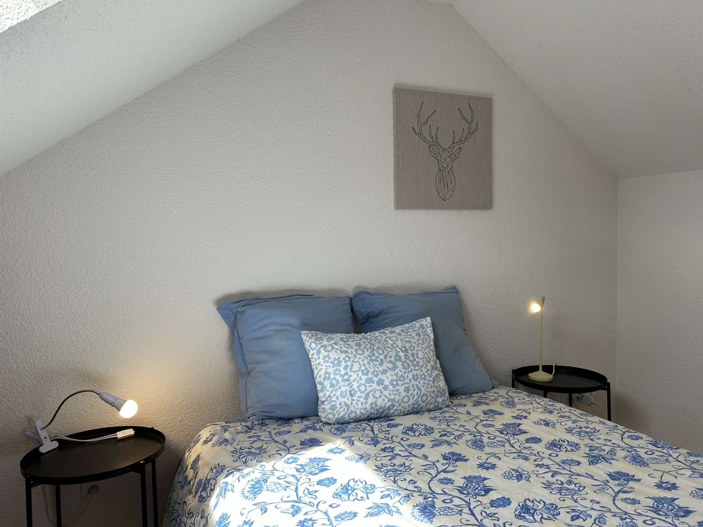 - Ein Schlafzimmer mit einem 140 cm breiten Doppelbett.