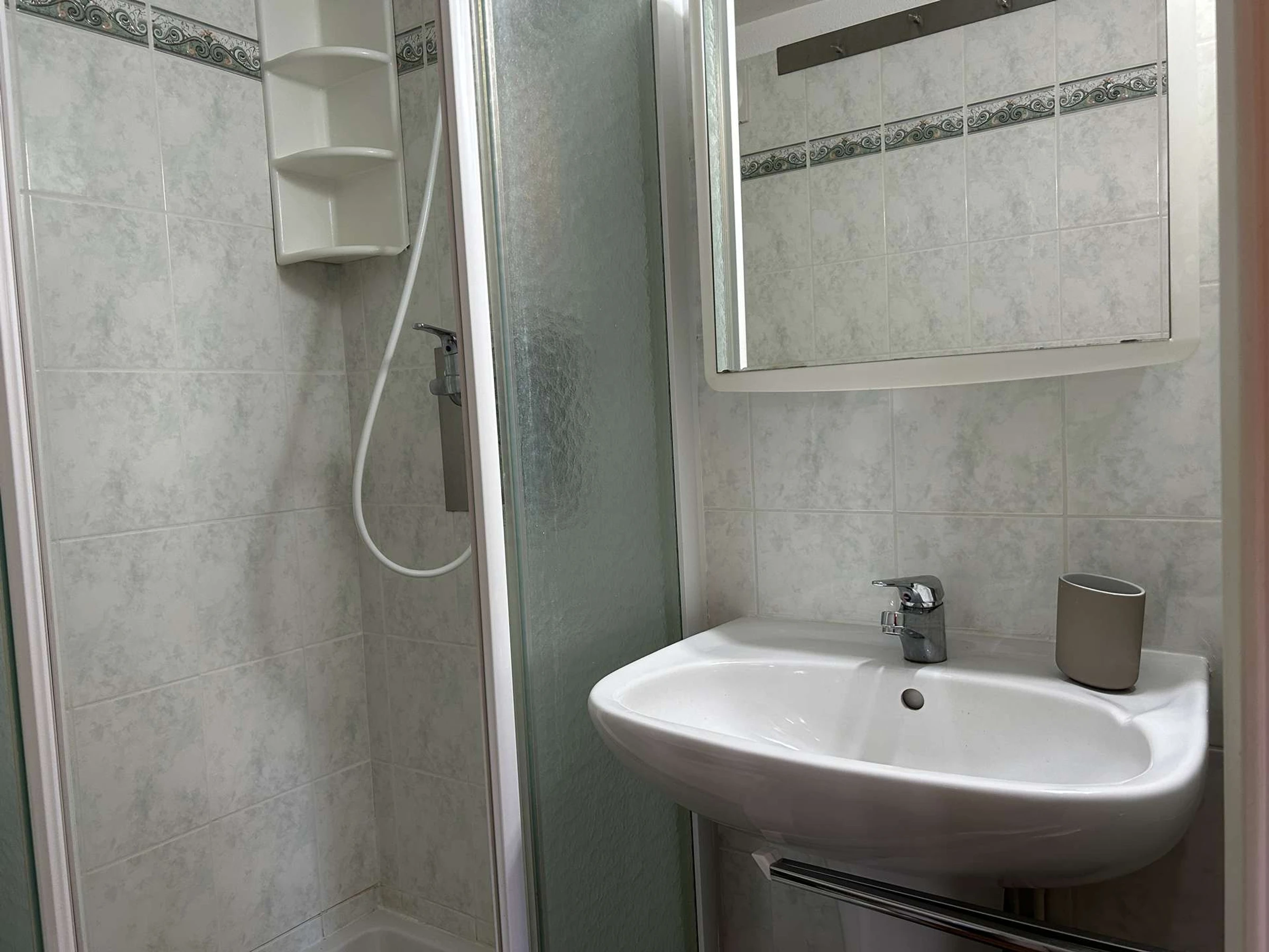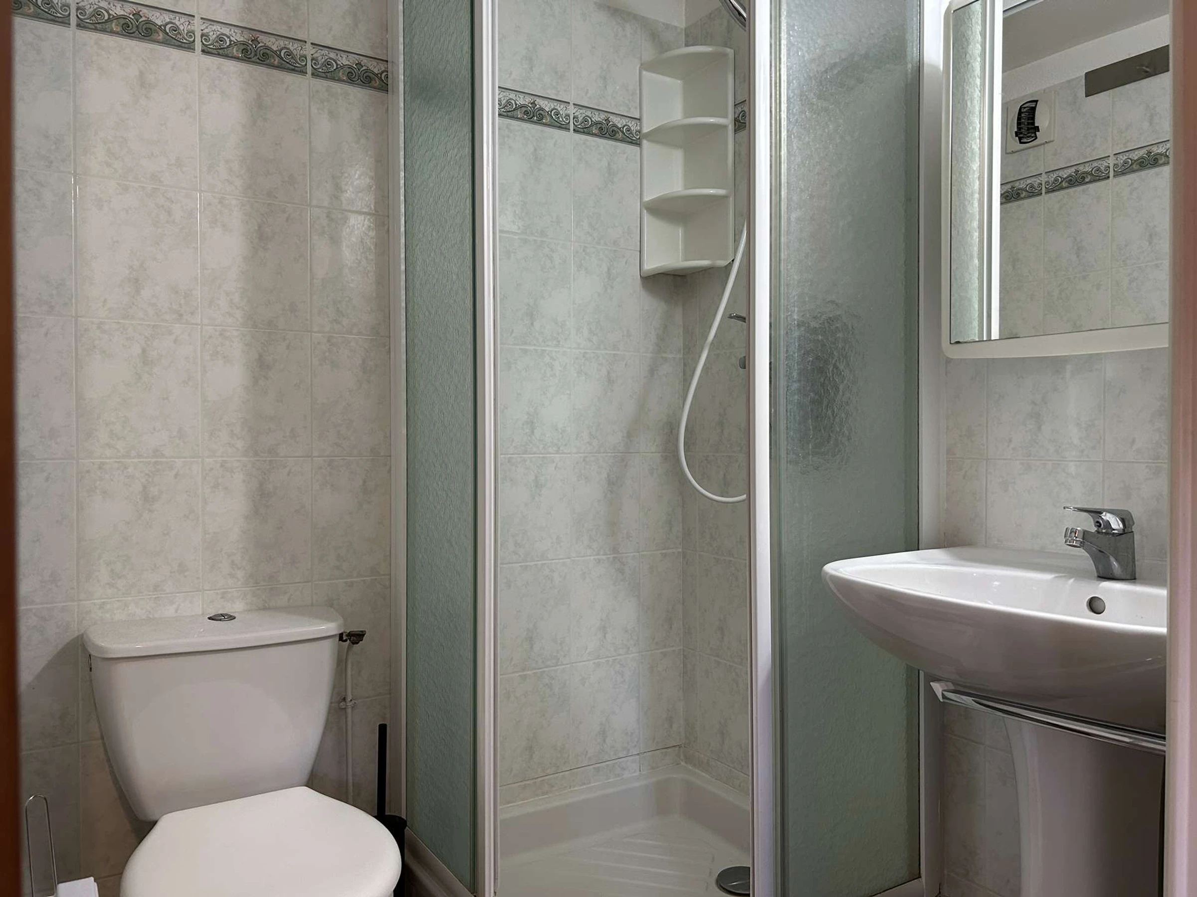 - Ein Badezimmer mit Dusche, Waschbecken und Toilette.