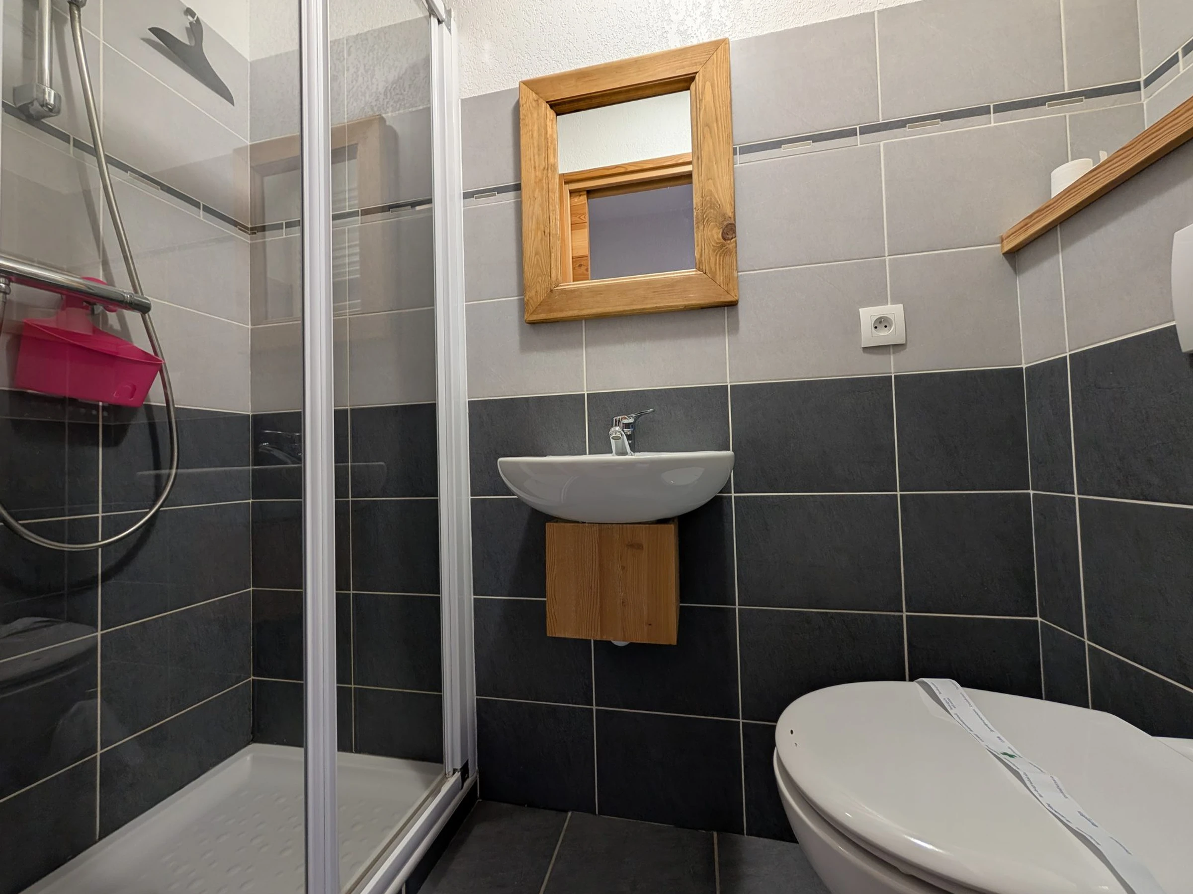 Duschbad: Duschkabine, Waschbecken, Spiegel, WC, Ablage, elektrischer Handtuchtrockner.