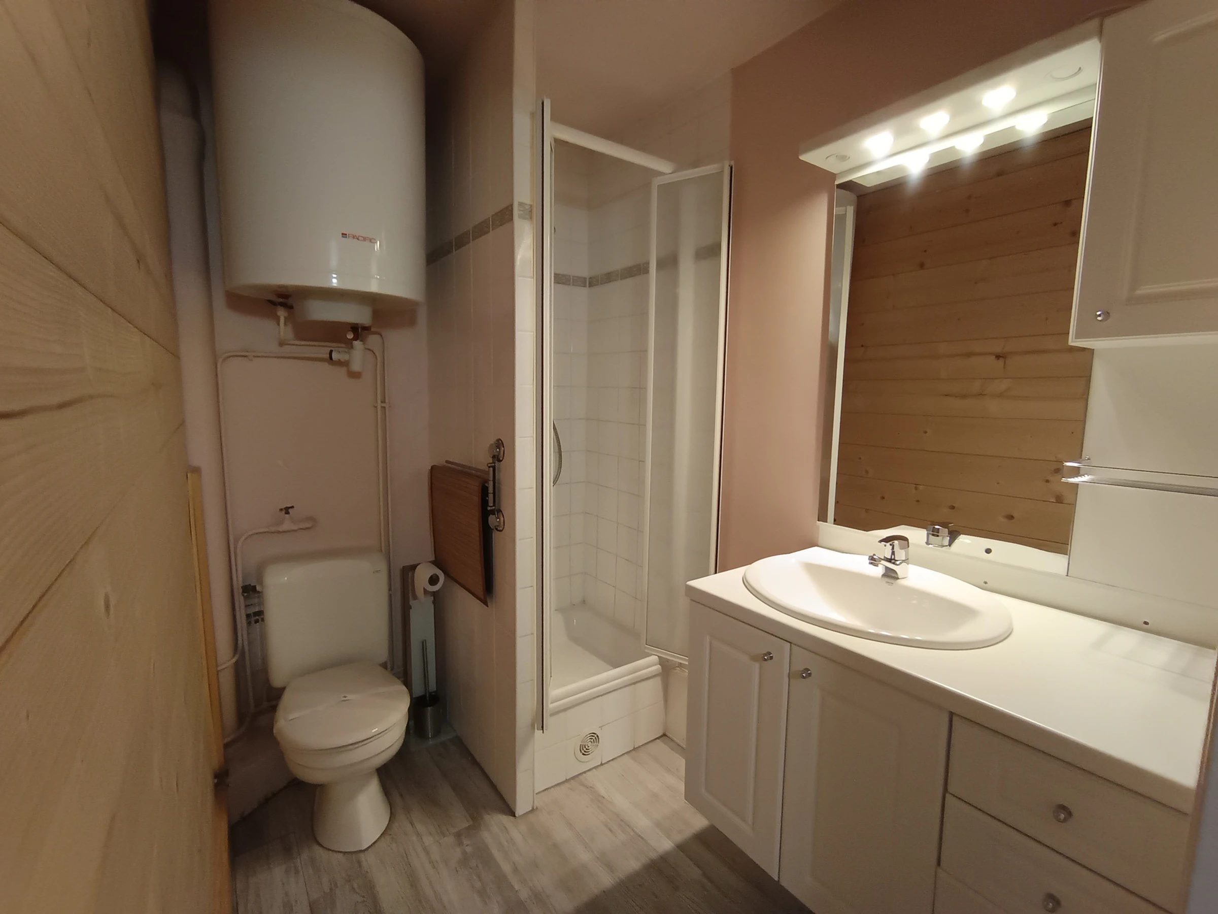 Badezimmer: Duschkabine, WC, Waschbecken, Föhn, Wandheizlüfter