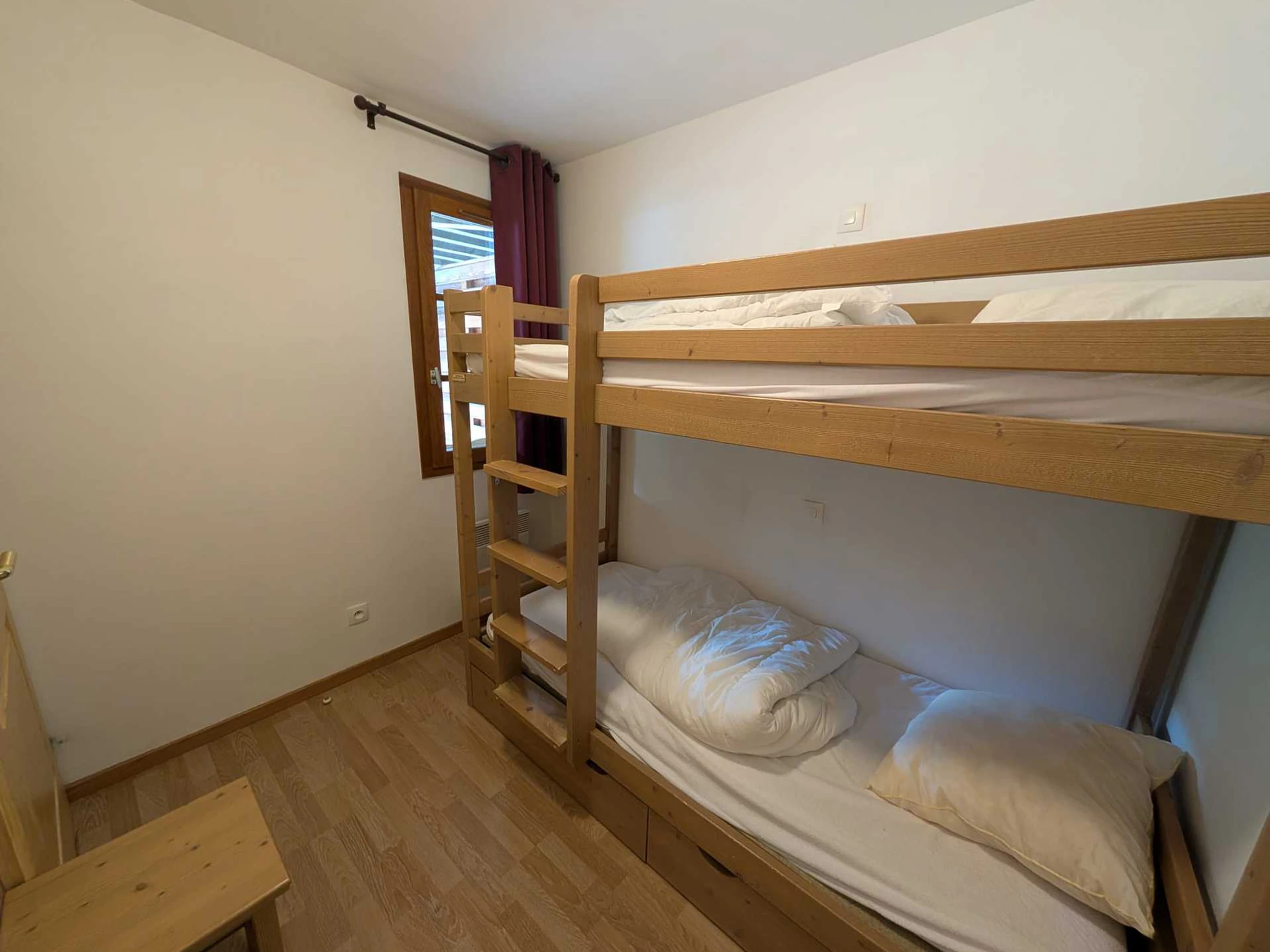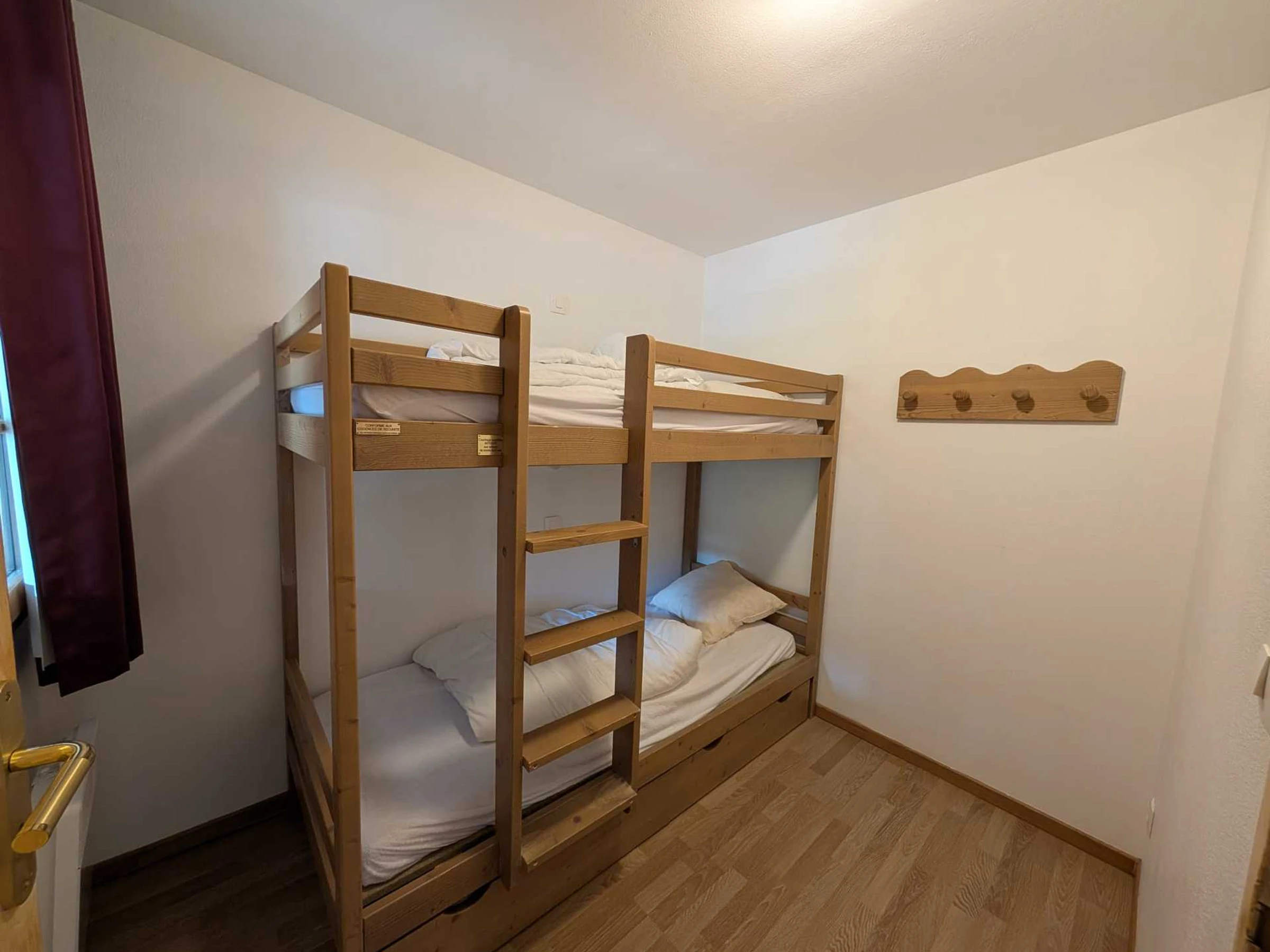Schlafbereich durch eine Tür vom Wohnbereich abgetrennt: 2 Etagenbetten (80 x 190 cm), Fenster zur Terrasse.