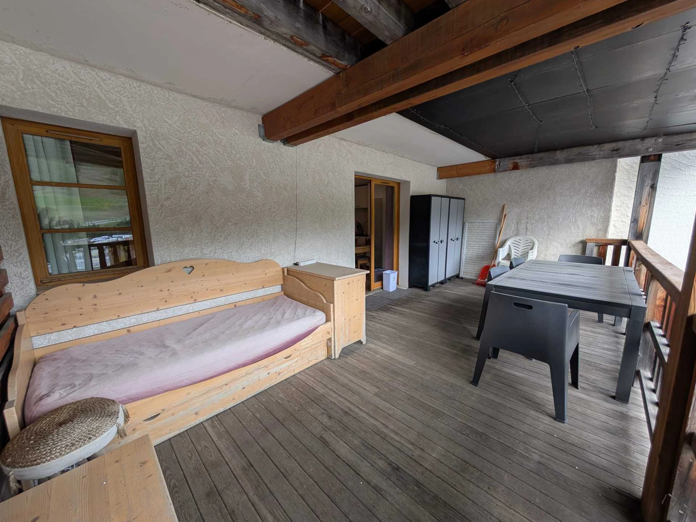 Überdachte Terrasse (17 m²) in Südlage mit herrlichem Blick auf die Pisten und Gartenmöbeln für 4 Personen, 1 Schlafsofa, 1 Plane, 1 Besen, 1 Schneeschaufel, 2 Mülltonnen (je 50 l)