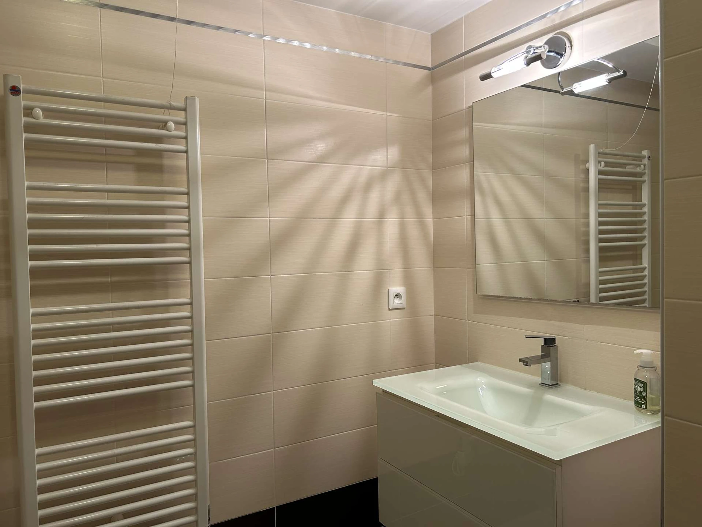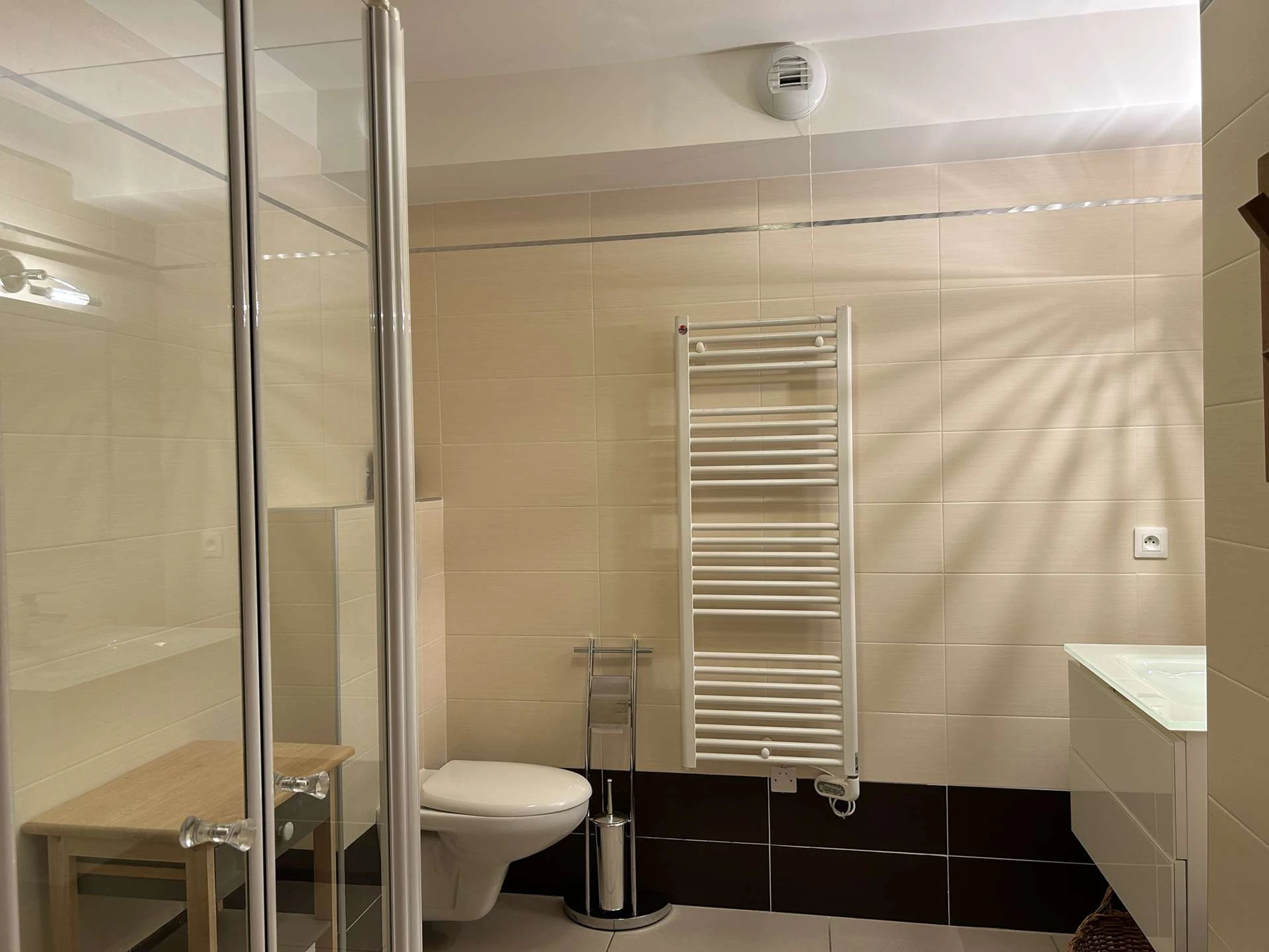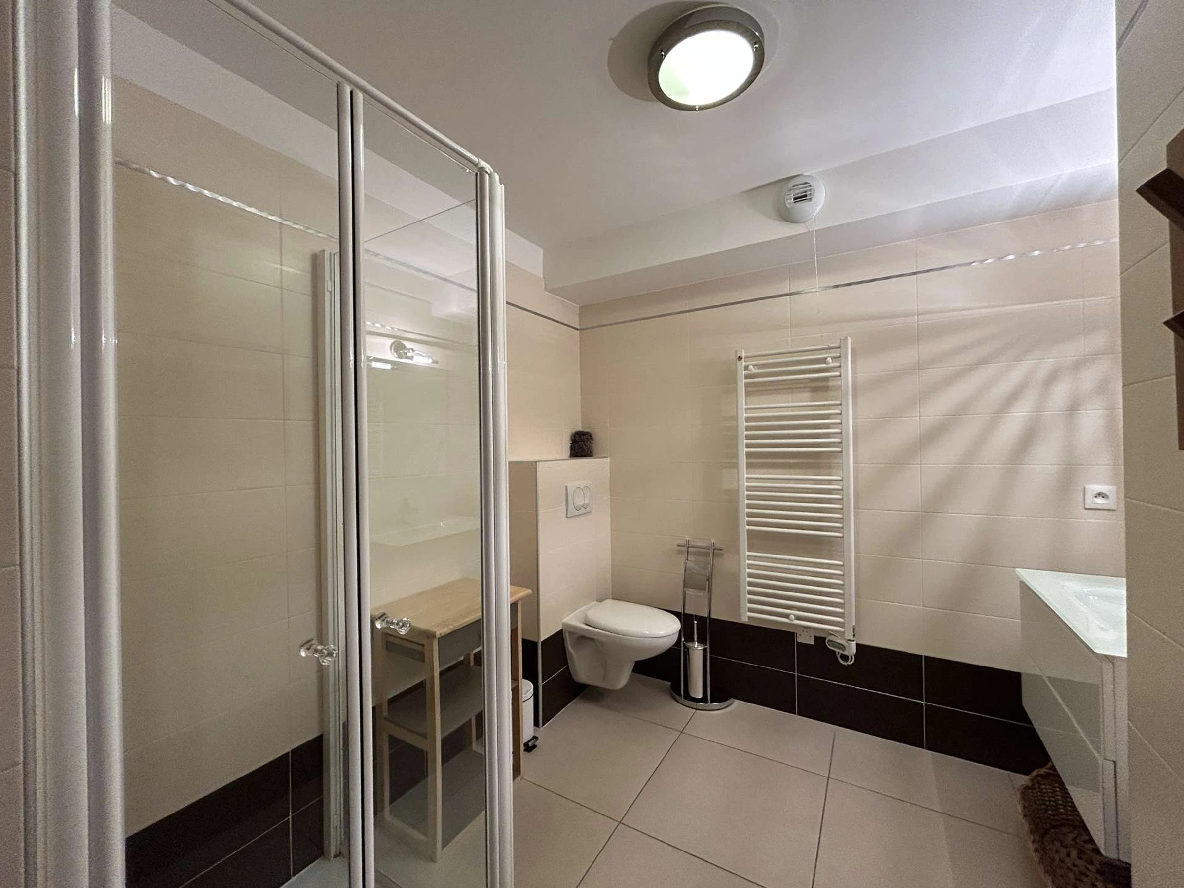 - dem Badezimmer mit Waschbecken und Toilette.
