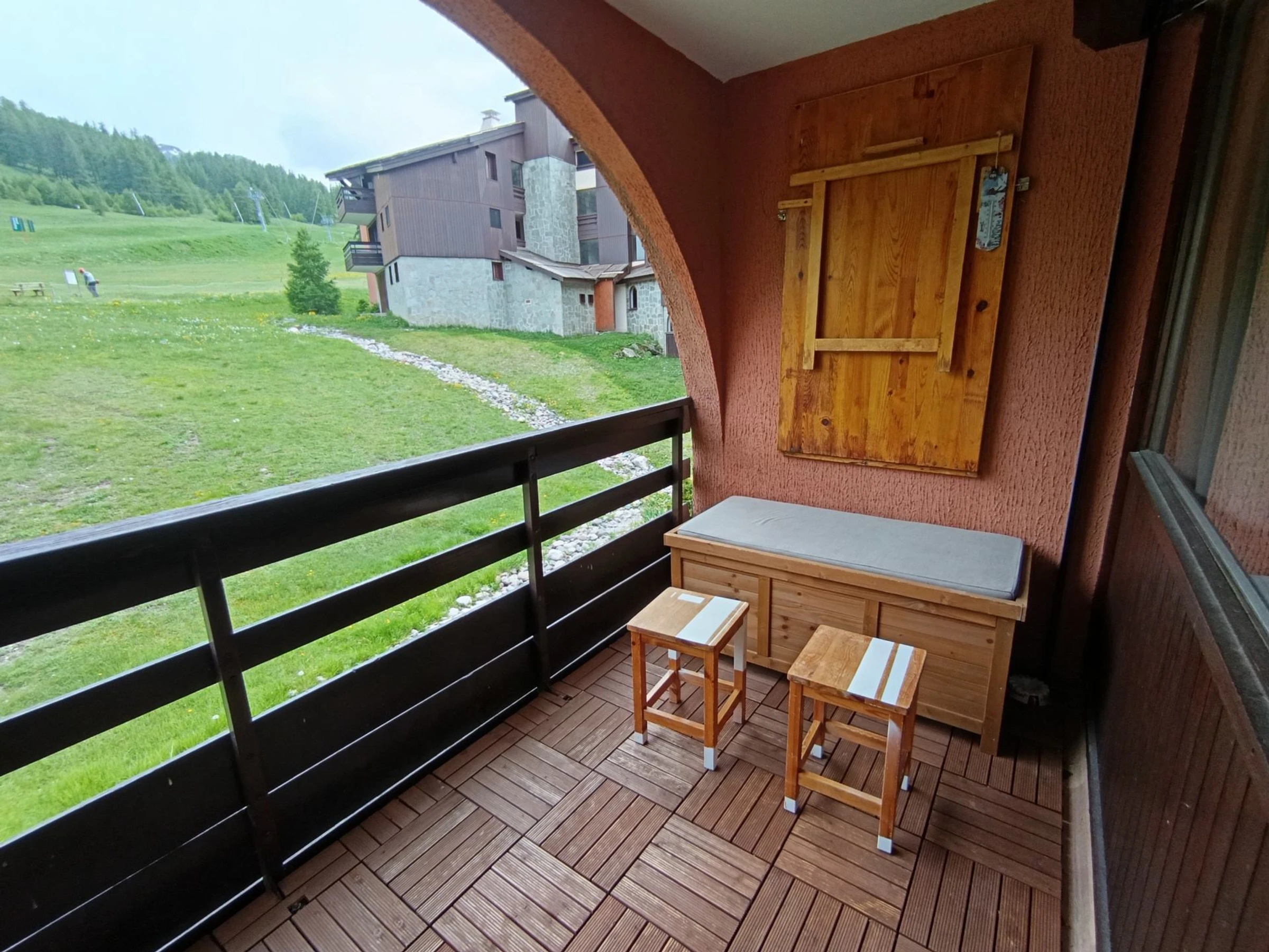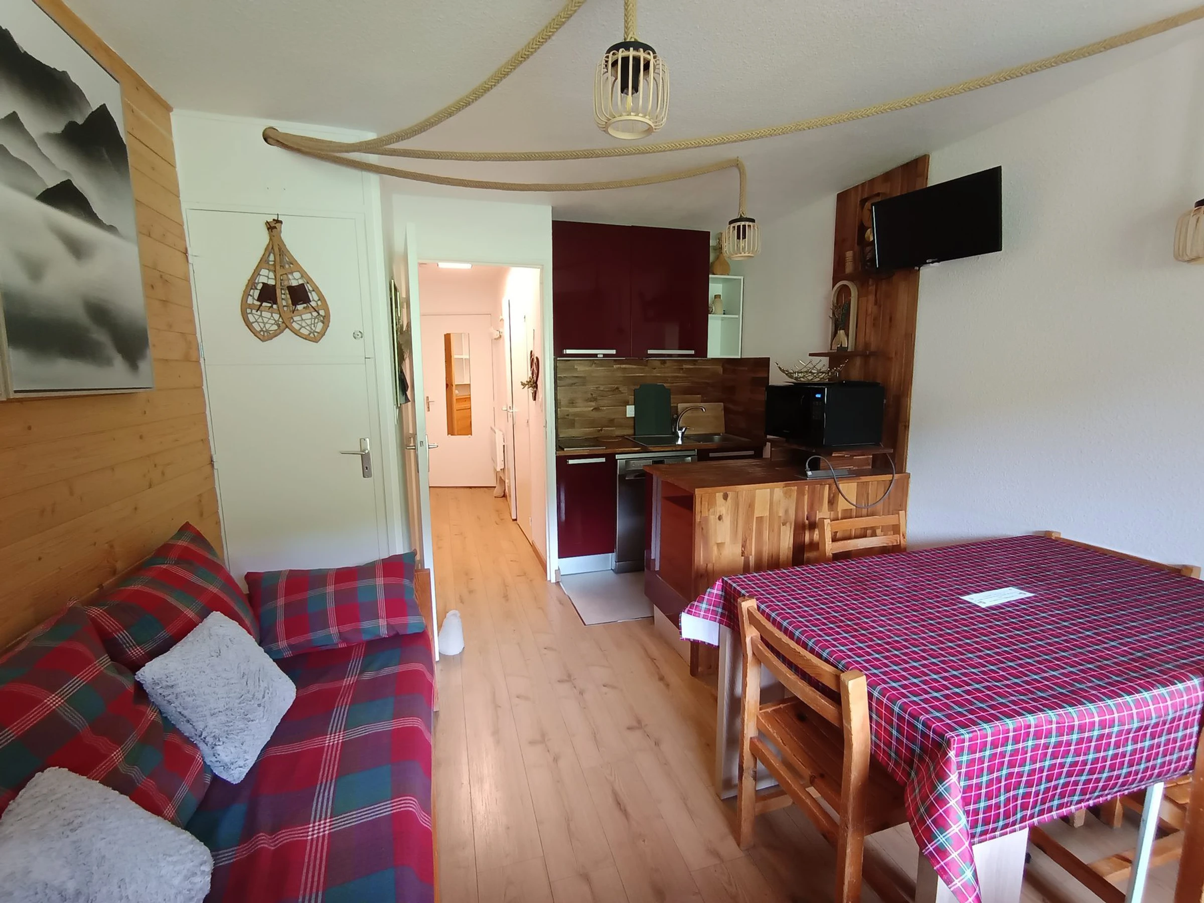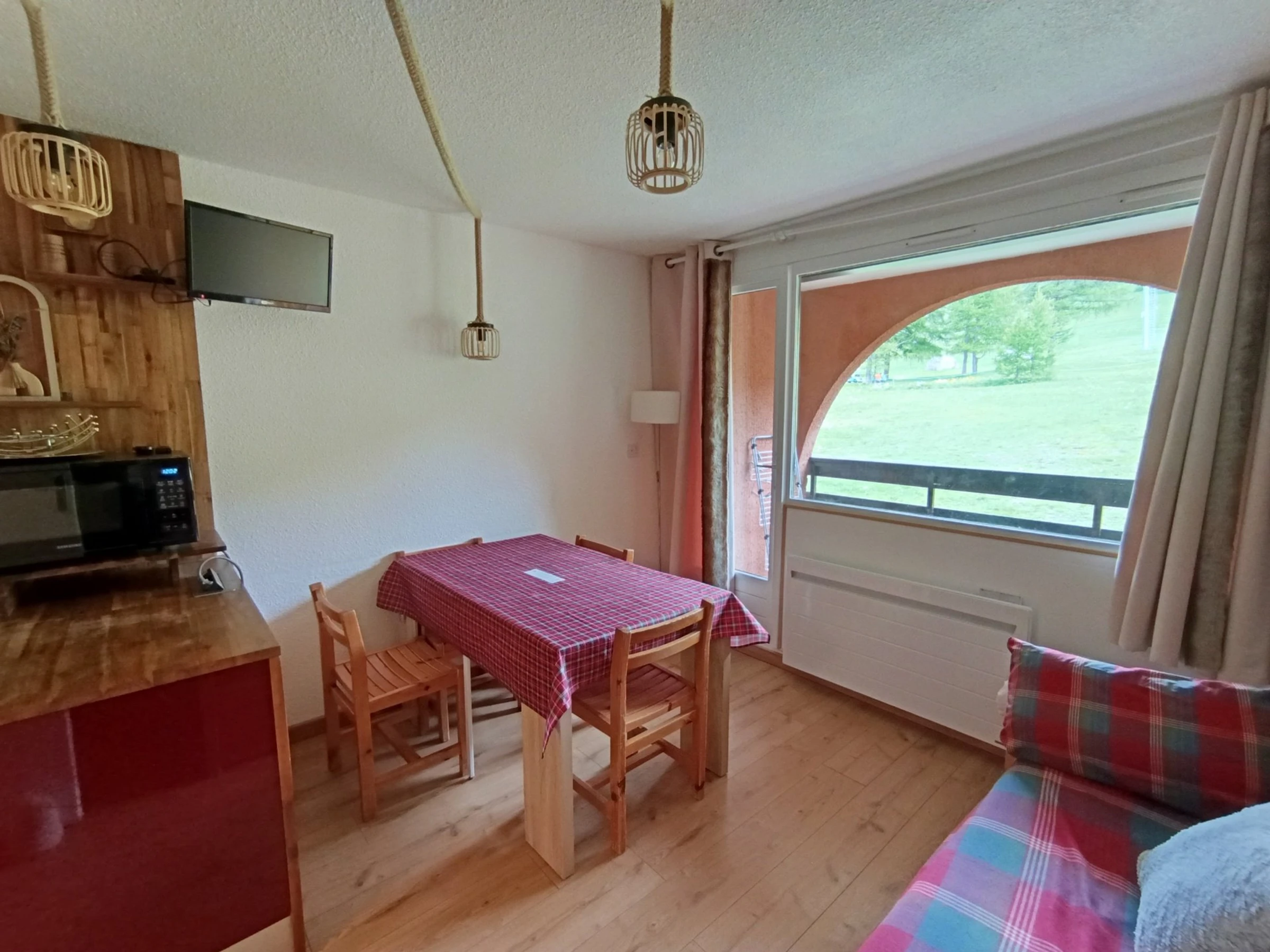 Wohnzimmer: Wandfernseher, 3-Sitzer-Schlafsofa, Essbereich mit Tisch und 4 Stühlen, Zugang zum Balkon mit Blick auf die Piste. Rollläden.