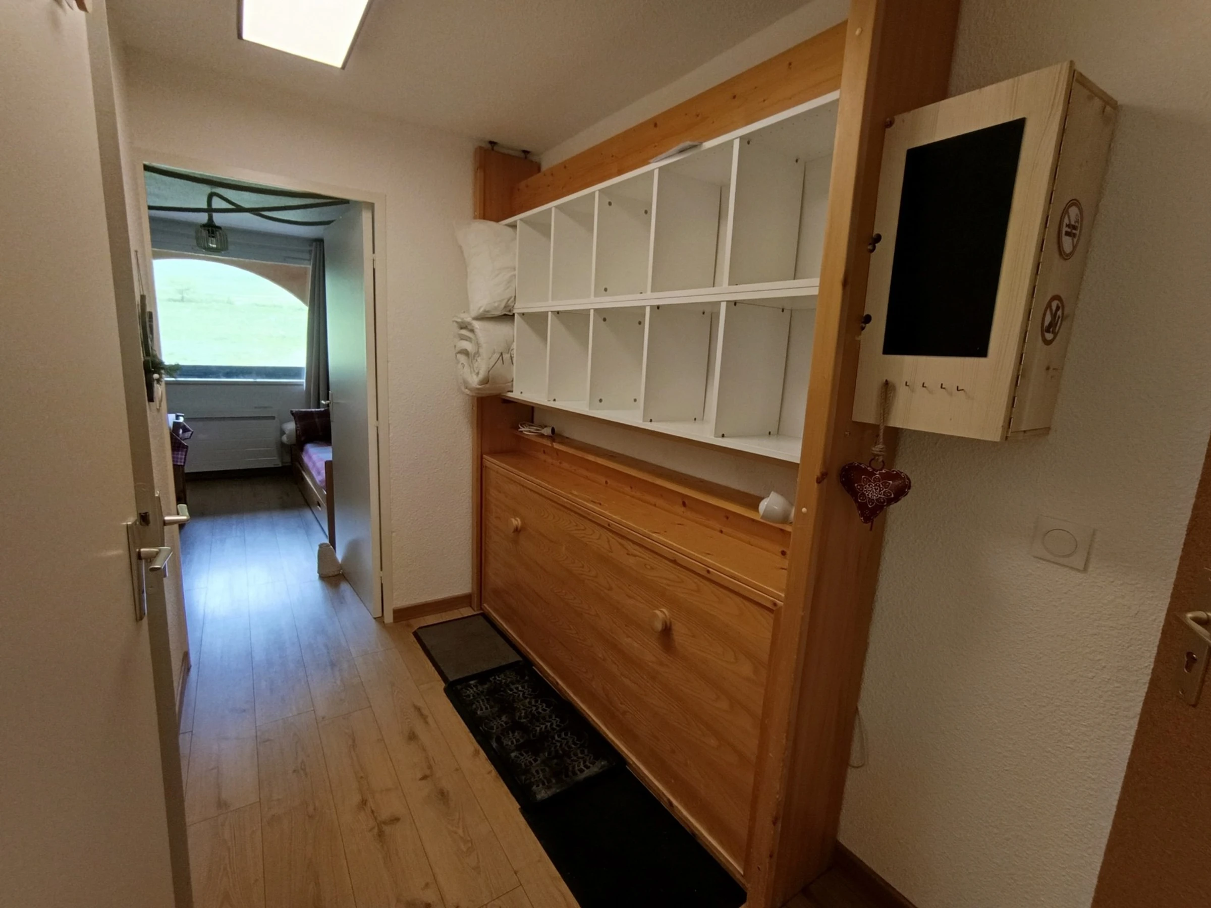 Eingangsbereich: Großzügiger Eingangsbereich mit Zugang zu den Zimmern, Kleiderhaken, Ablageflächen, Klappbett.