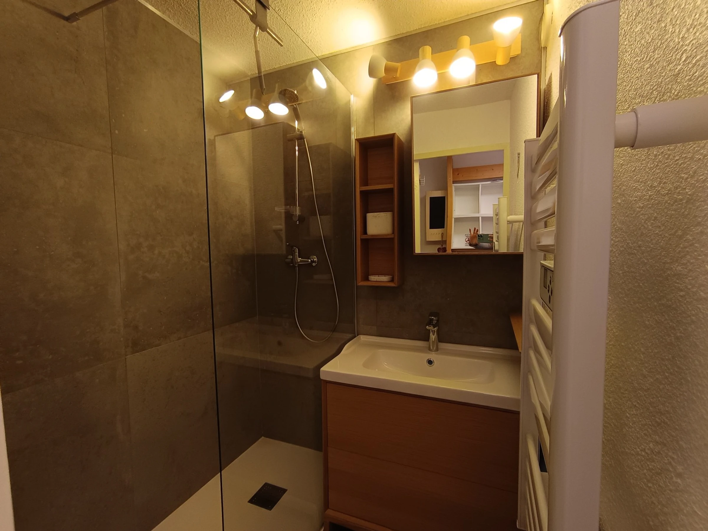 Badezimmer: Ebenerdige Dusche, Waschtisch, großer Spiegel, Ablageflächen, elektrischer Handtuchtrockner.