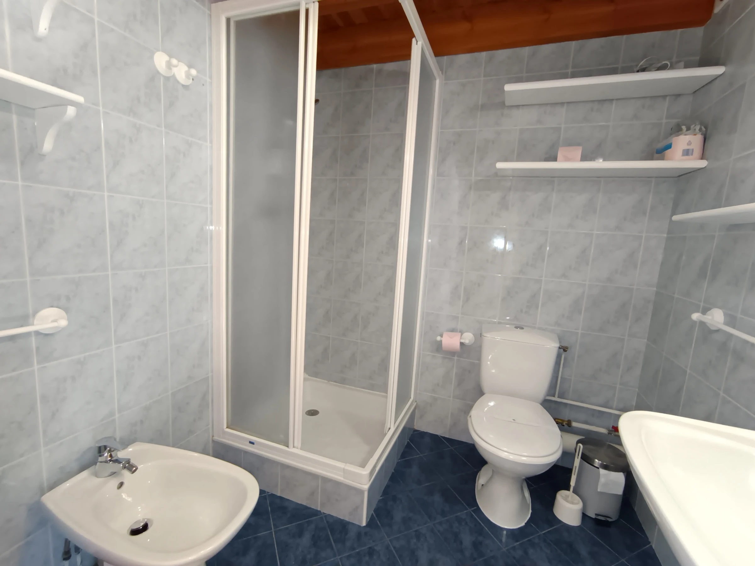 Duschbad: Duschkabine, Bidet, Waschbecken mit Spiegel, WC. Wandmontierte Handtuchhalter, Ablagen