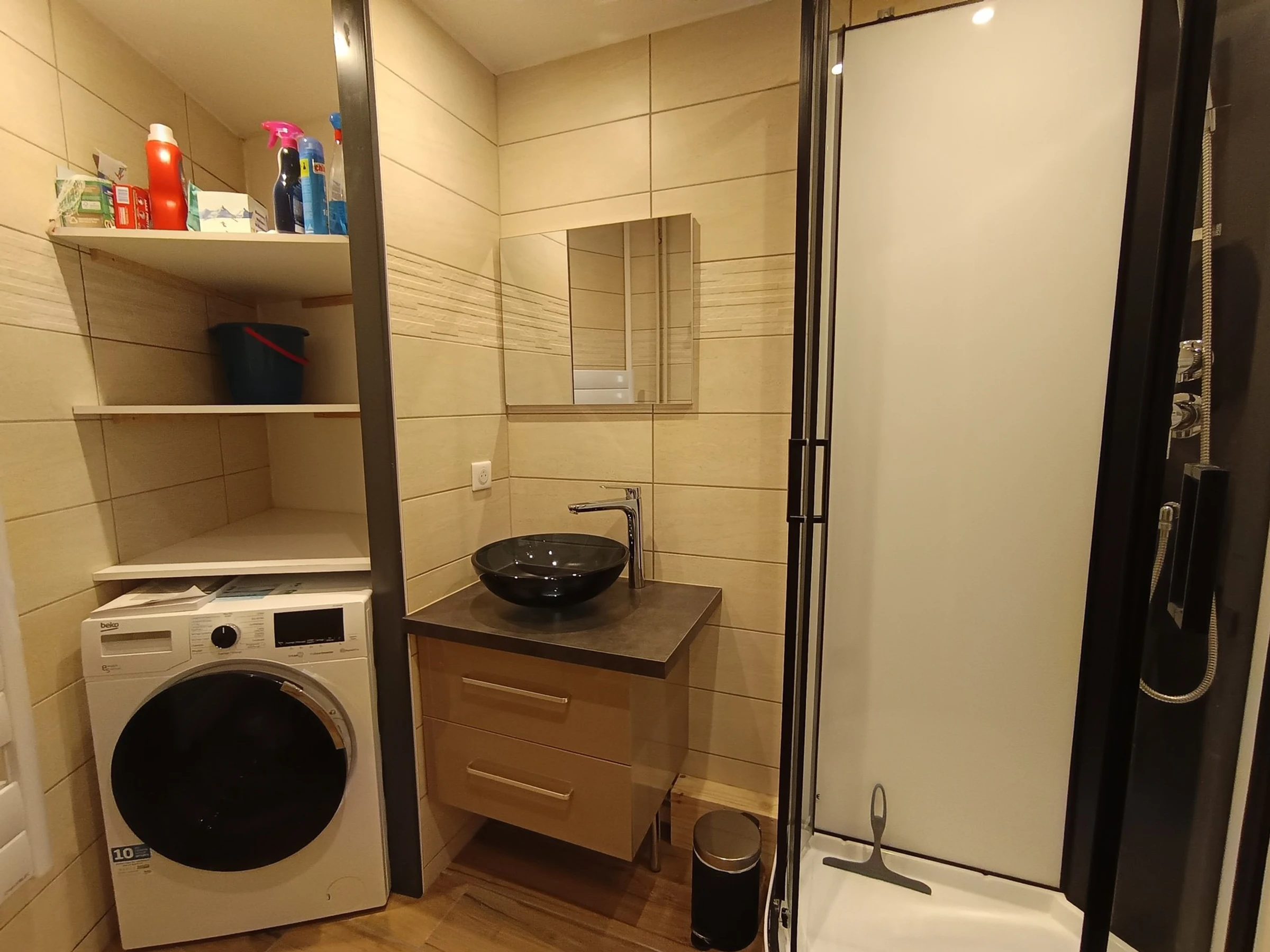 Badezimmer: Große Dusche mit Duschabtrennung, Waschbecken, Spiegel, elektrischer Handtuchwärmer, Ablagen.