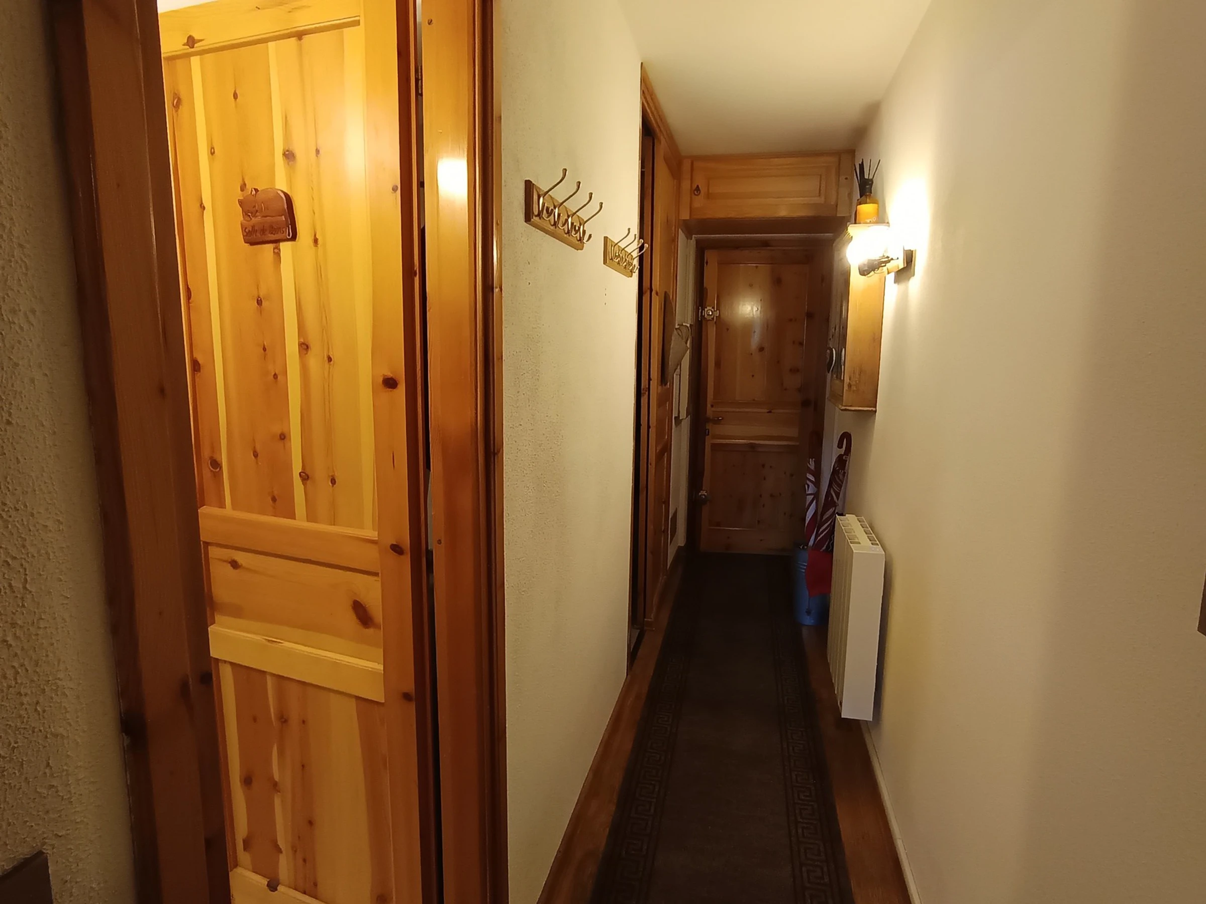 Eingangsbereich mit Kleiderhaken und Regalen.