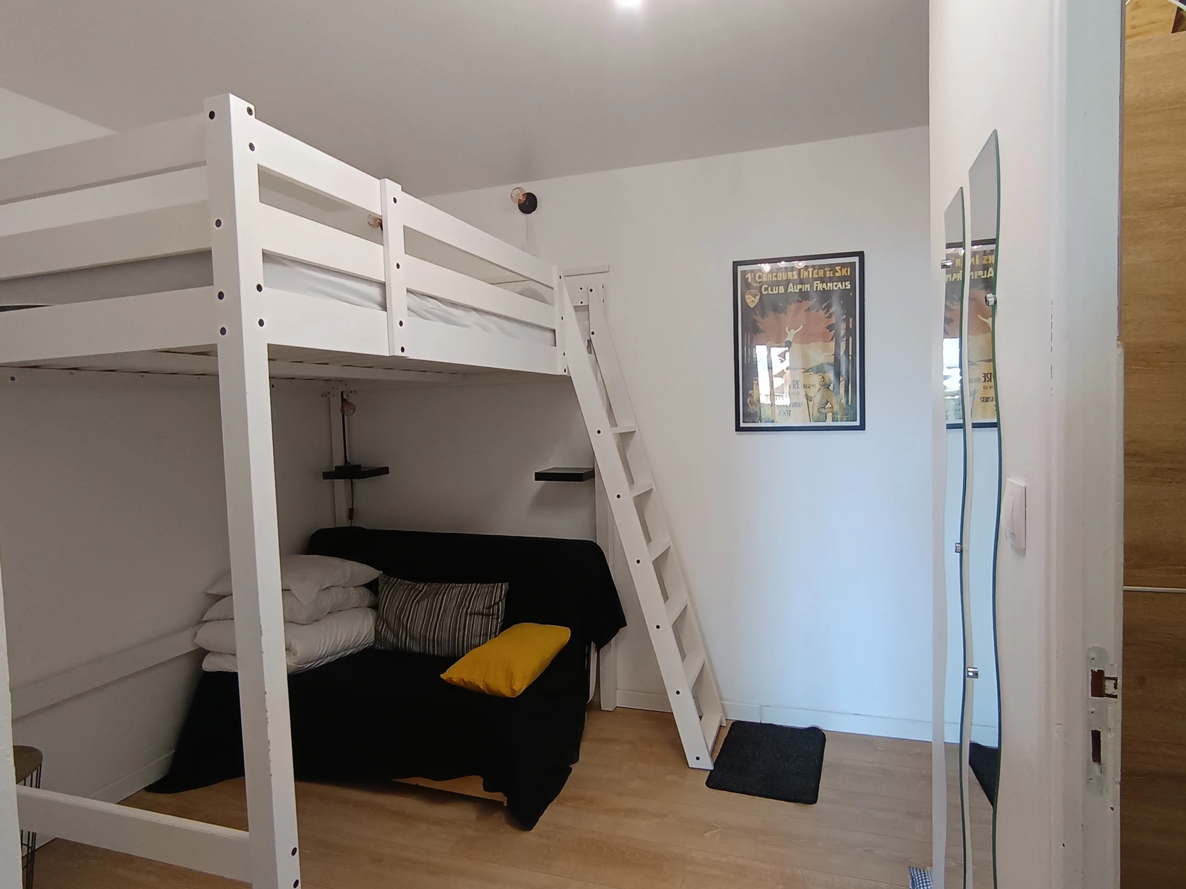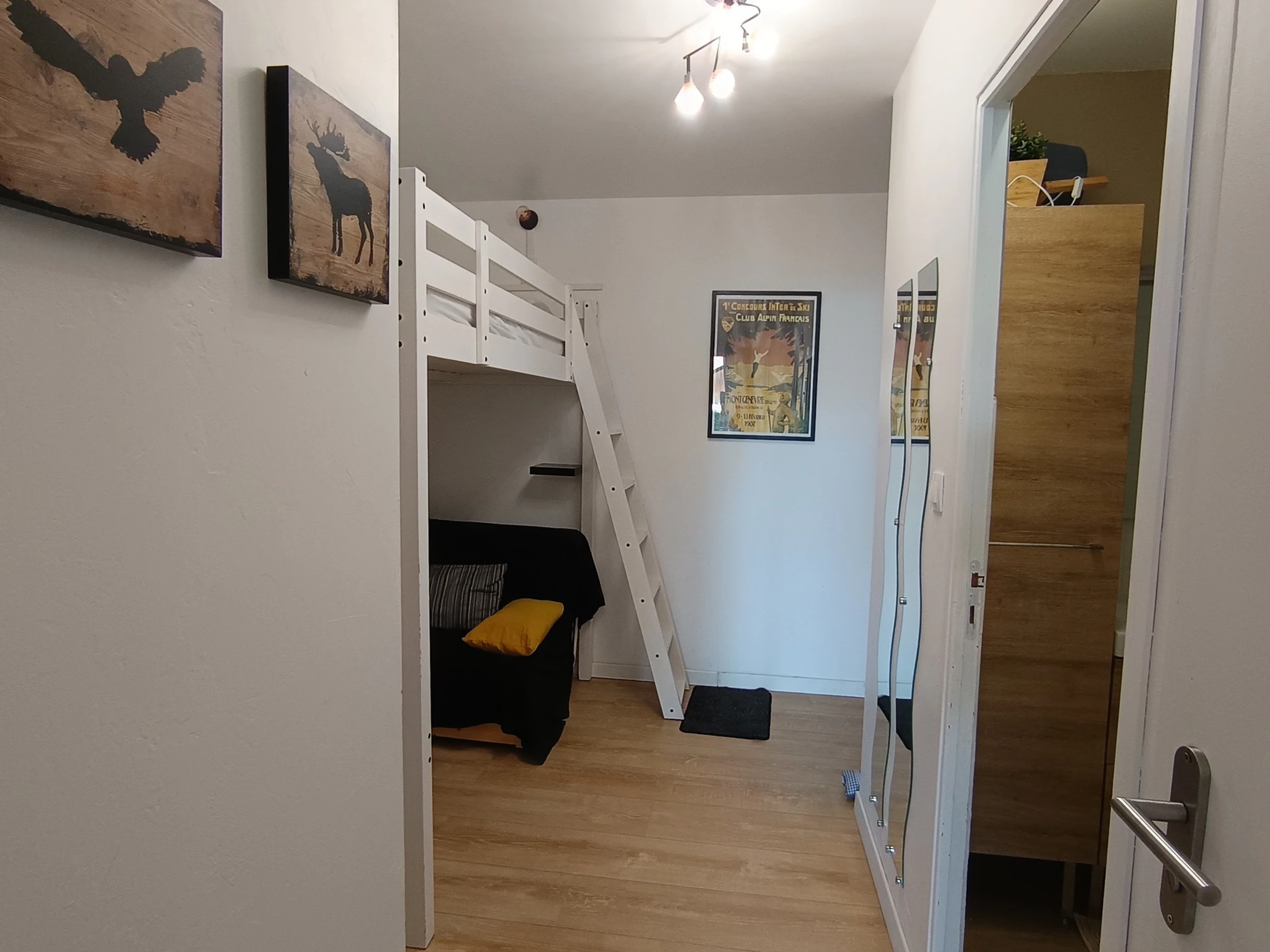Der Eingang führt in eine große Nische mit einem Hochbett und einem Schlafsofa darunter. Großer Kleiderschrank mit Kleiderhaken.