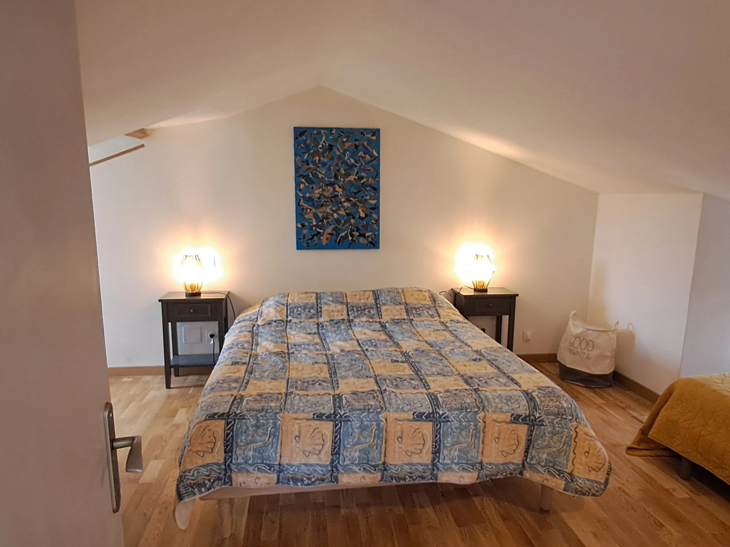 Im Obergeschoss führt eine kleine Galerie zu einem 9 m² großen Schlafzimmer (17 m² Wohnfläche) unter dem Dach. Es ist mit einem Bett (160 x 200 cm) und einem Bett (90 x 190 cm) ausgestattet. Auf der anderen Seite der Galerie befindet sich ein kleines, 8 m² großes Zimmer mit zwei Betten (90 x 190 cm), das sich ideal für Kinder eignet.