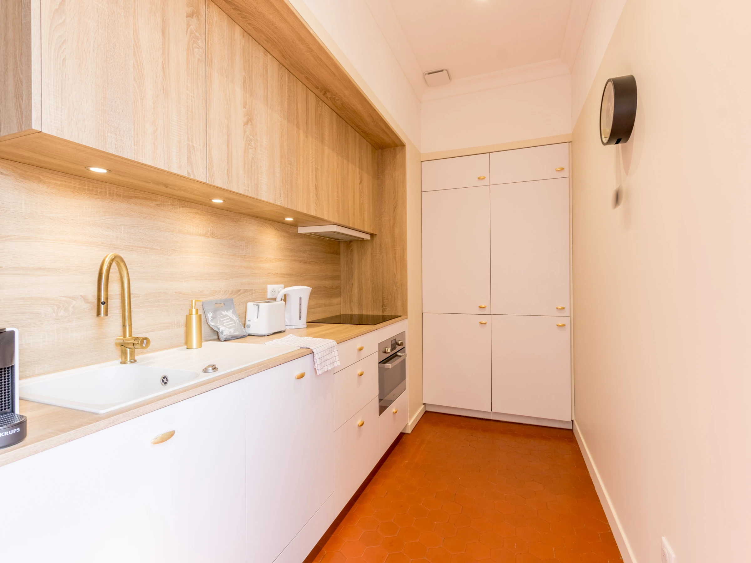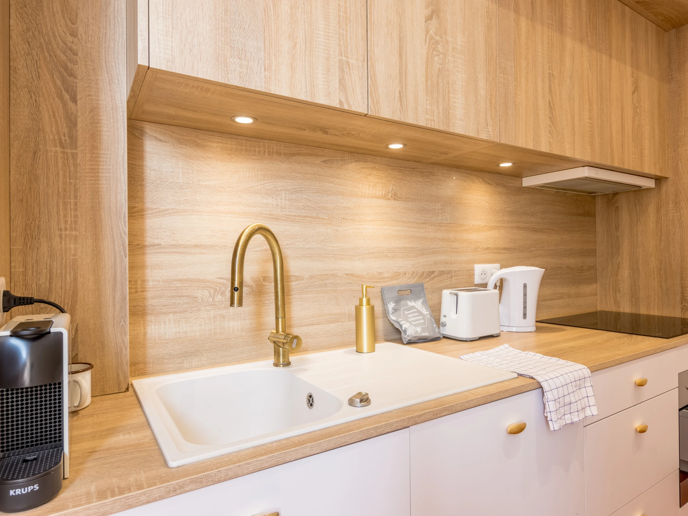 Dieses offene küche, mit induktions-kochfeld, ist ausgestattet in kühlschrank, backofen, gefrierschrank, spülmaschine, geschirr/besteck, kochutensilien, kaffeemaschine, toaster und wasserkocher.