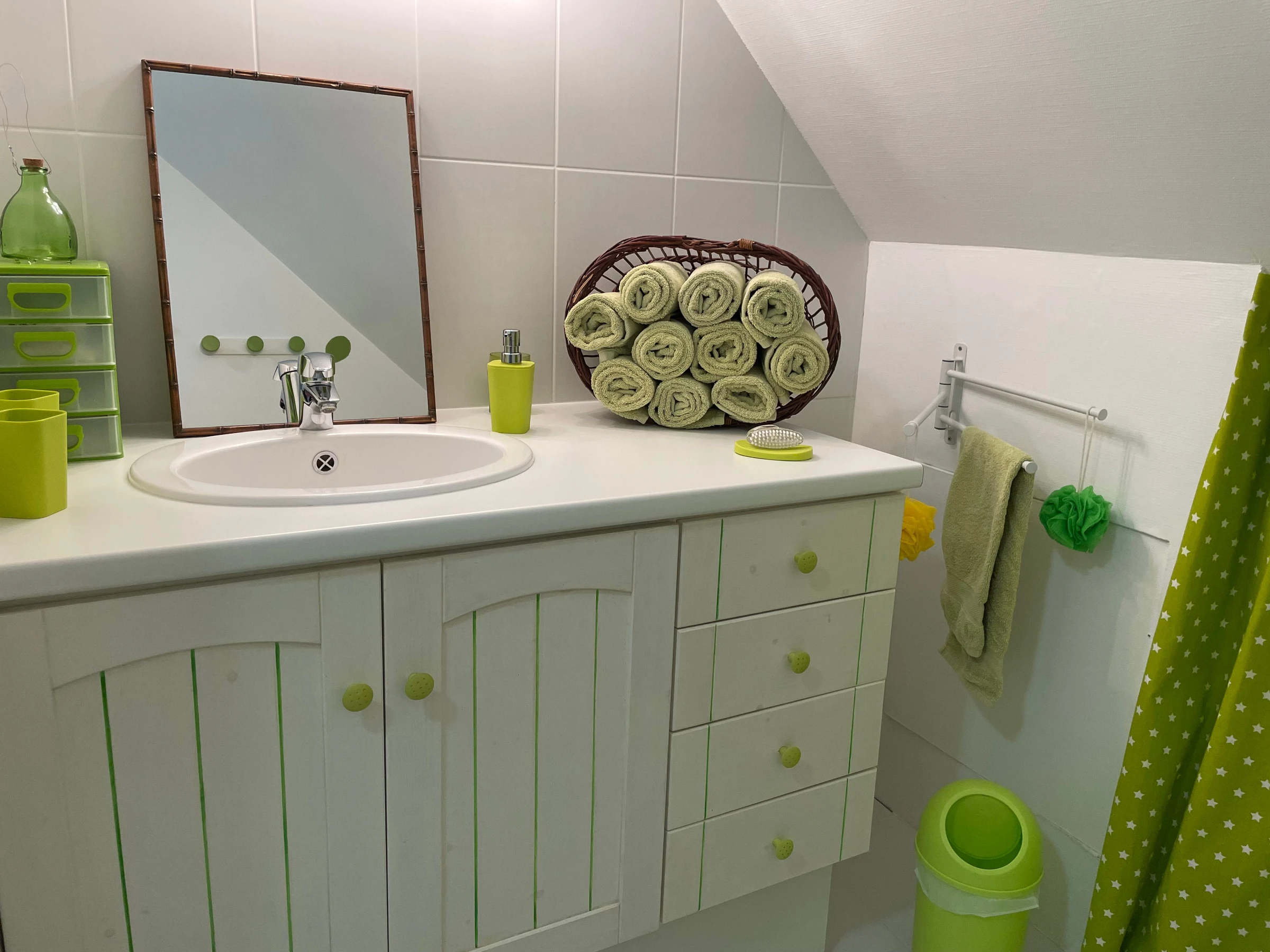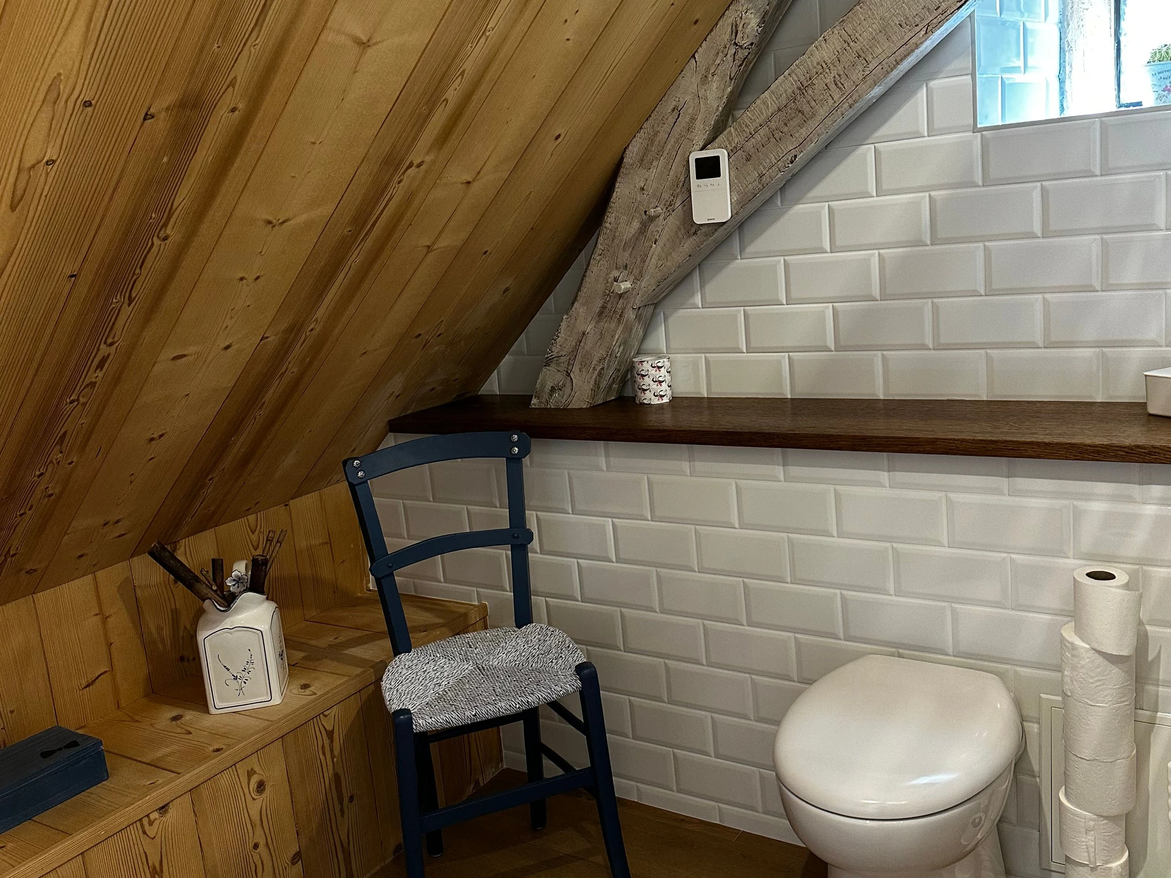 Im Obergeschoss finden Sie ein großes, 90 m² großes Schlafzimmer mit einem 170 cm x 200 cm großen Bett, einen Arbeitsbereich und einen Wohnbereich mit einem bequemen Schlafsofa für 2 Personen. Das Schlafzimmer verfügt über ein eigenes Badezimmer mit großer ebenerdiger Dusche, Toilette und Waschbecken.