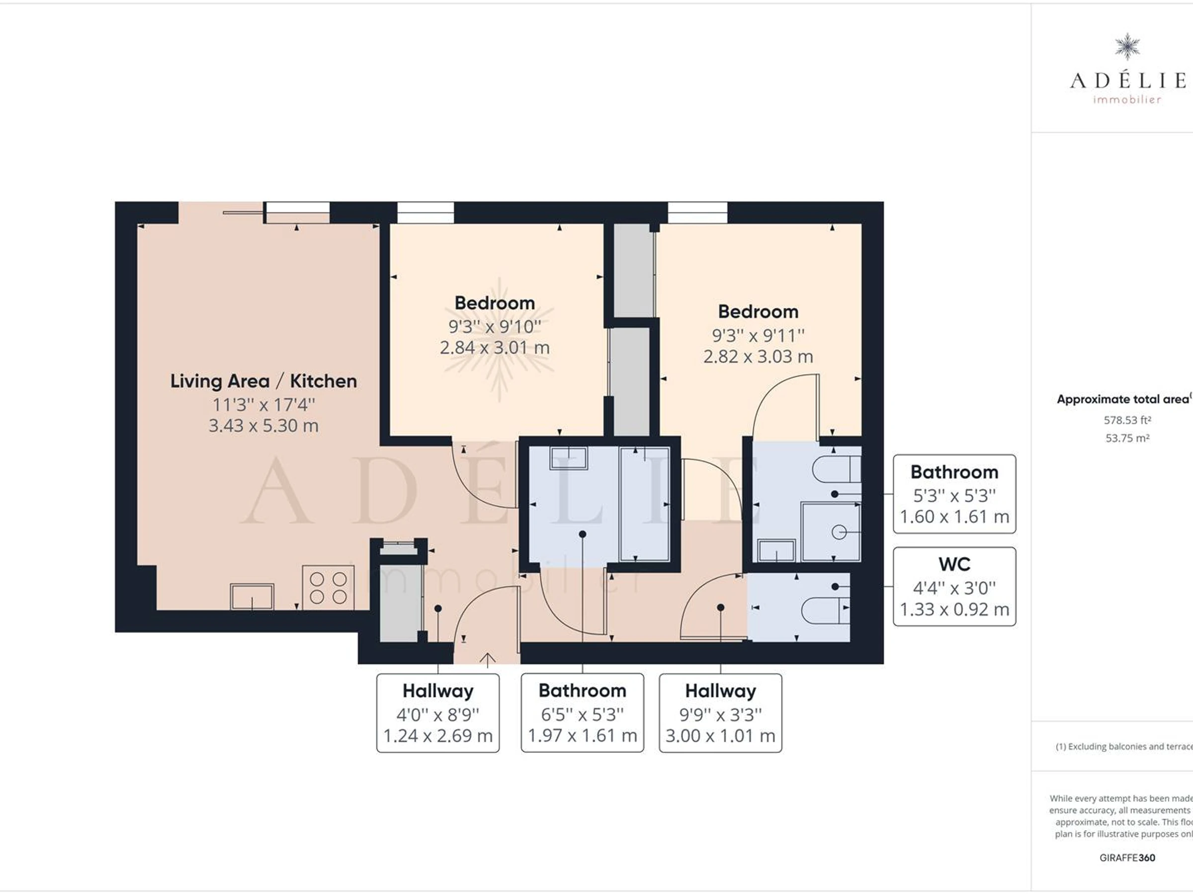 55 m² großes Appartement mit Eingangsbereich und begehbarem Kleiderschrank.