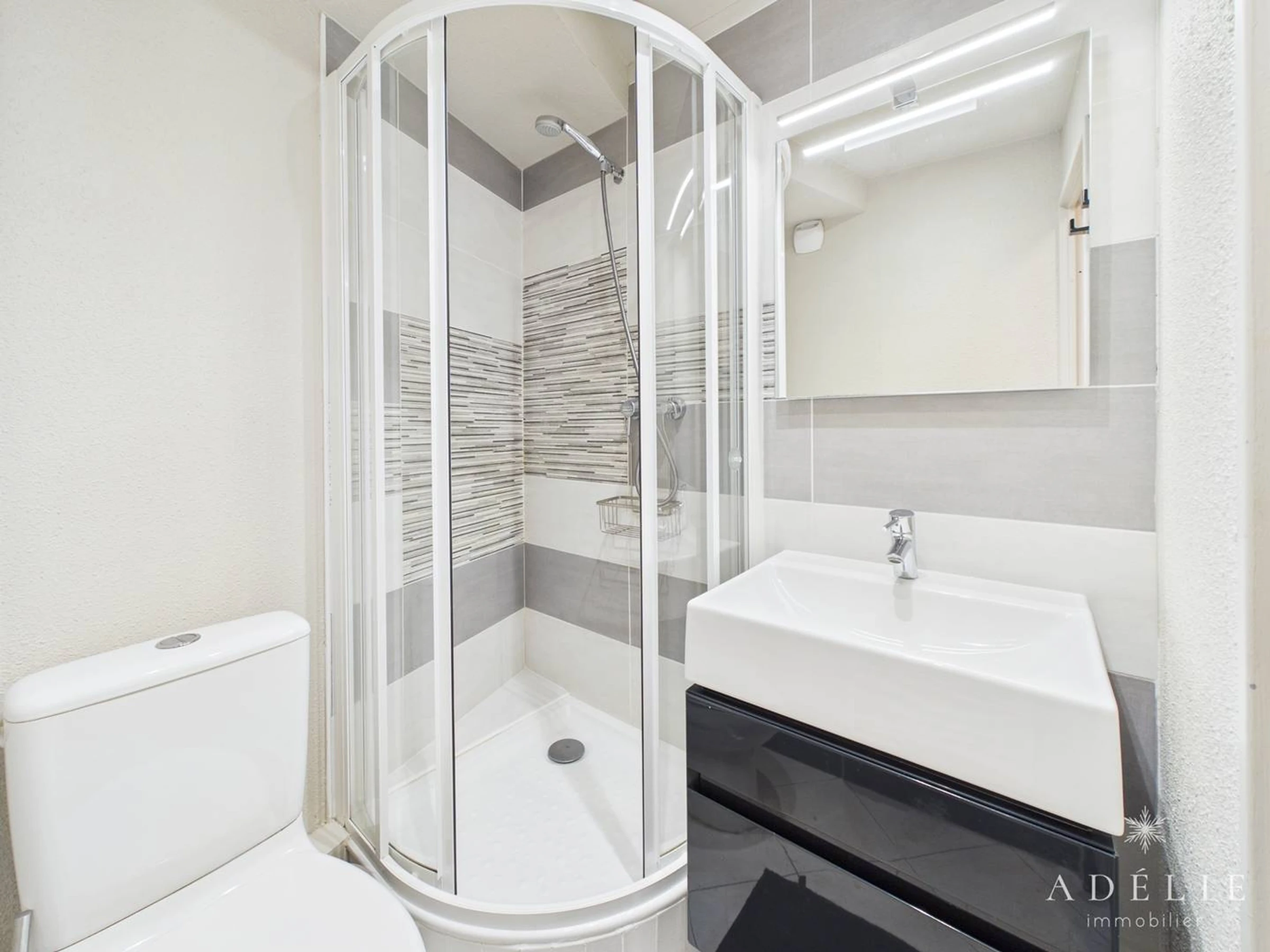 Badezimmer: Duschraum mit WC. Haartrockner.