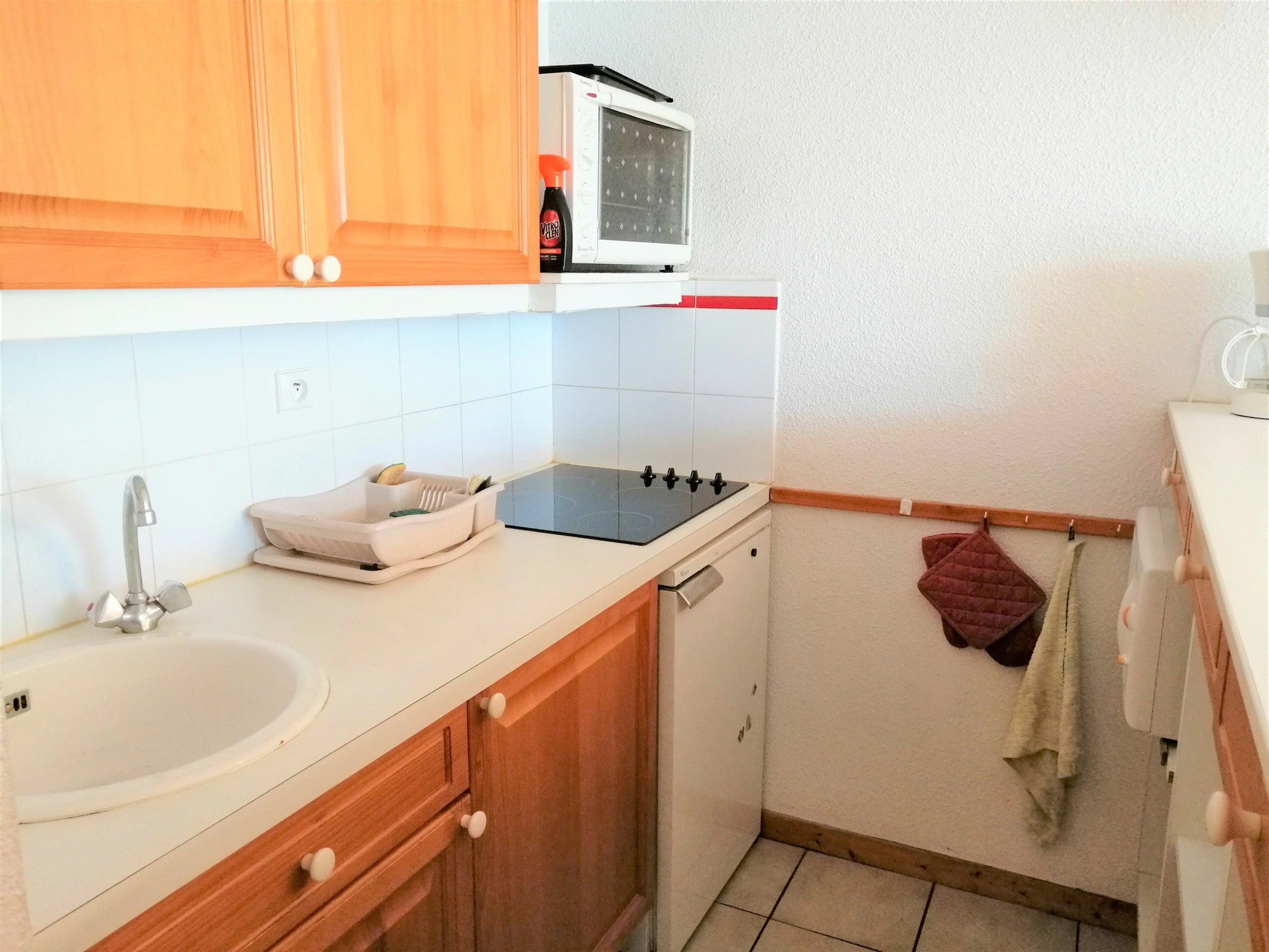 KÜCHE ausgestattet: Elektroherd, Kühlschrank, Backofen, Mikrowelle.
