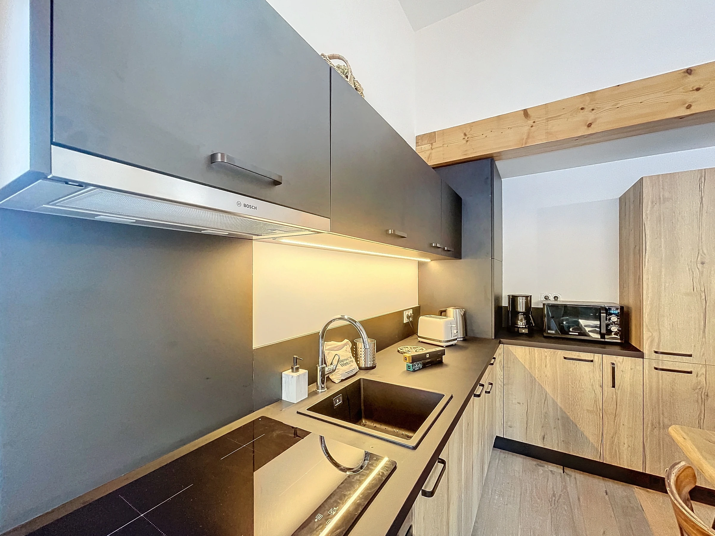 Dieses offene küche, mit induktions-kochfeld, ist ausgestattet in kühlschrank, mikrowelle, backofen, gefrierschrank, spülmaschine, geschirr/besteck, kochutensilien, kaffeemaschine, toaster und wasserkocher.