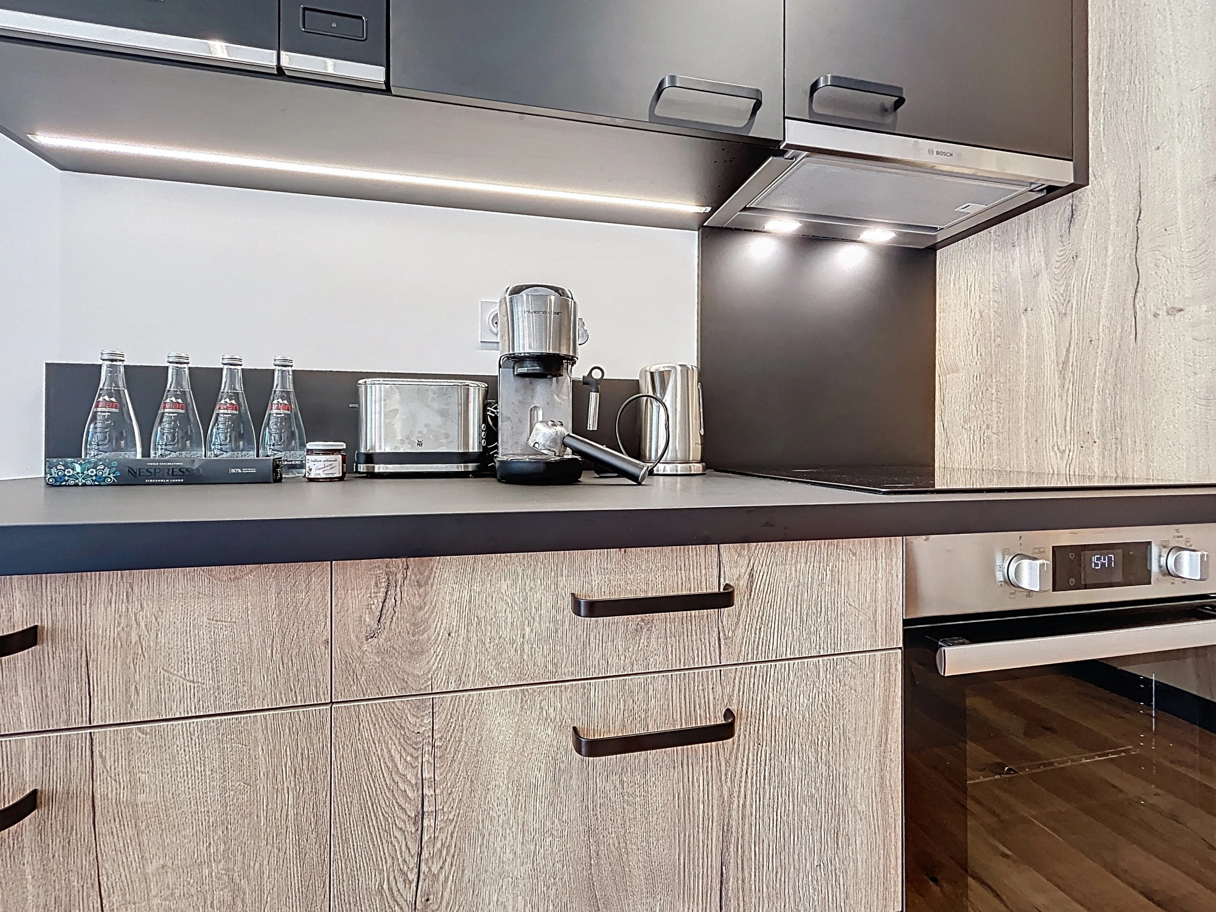 Dieses offene küche, mit induktions-kochfeld, ist ausgestattet in kühlschrank, mikrowelle, backofen, gefrierschrank, spülmaschine, geschirr/besteck, kochutensilien, kaffeemaschine, toaster und wasserkocher.