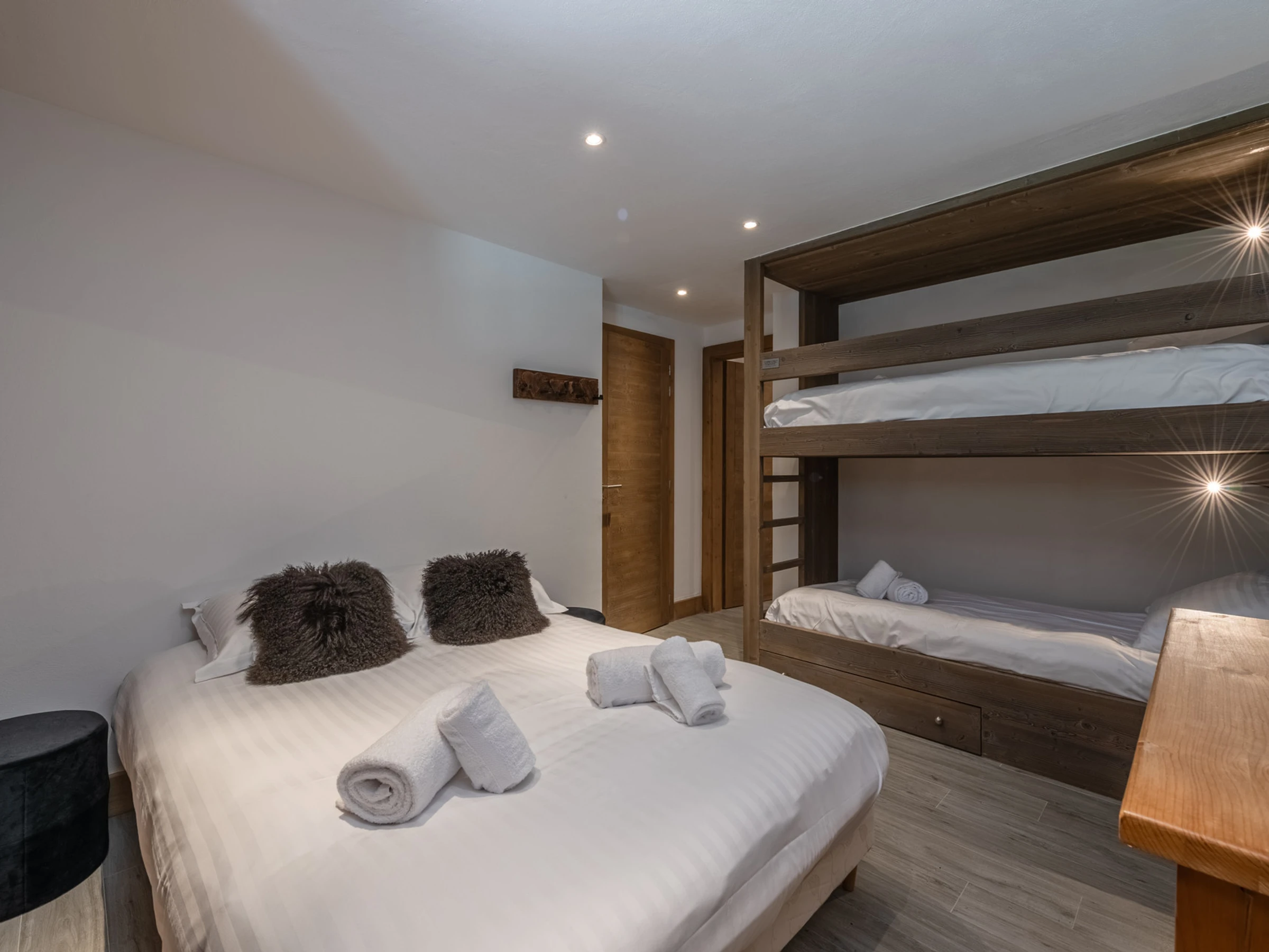 - Schlafzimmer 4: Doppelbett (140 x 190 cm) + 2 Etagenbetten (90 x 190 cm) mit eigenem Bad (Dusche und WC)