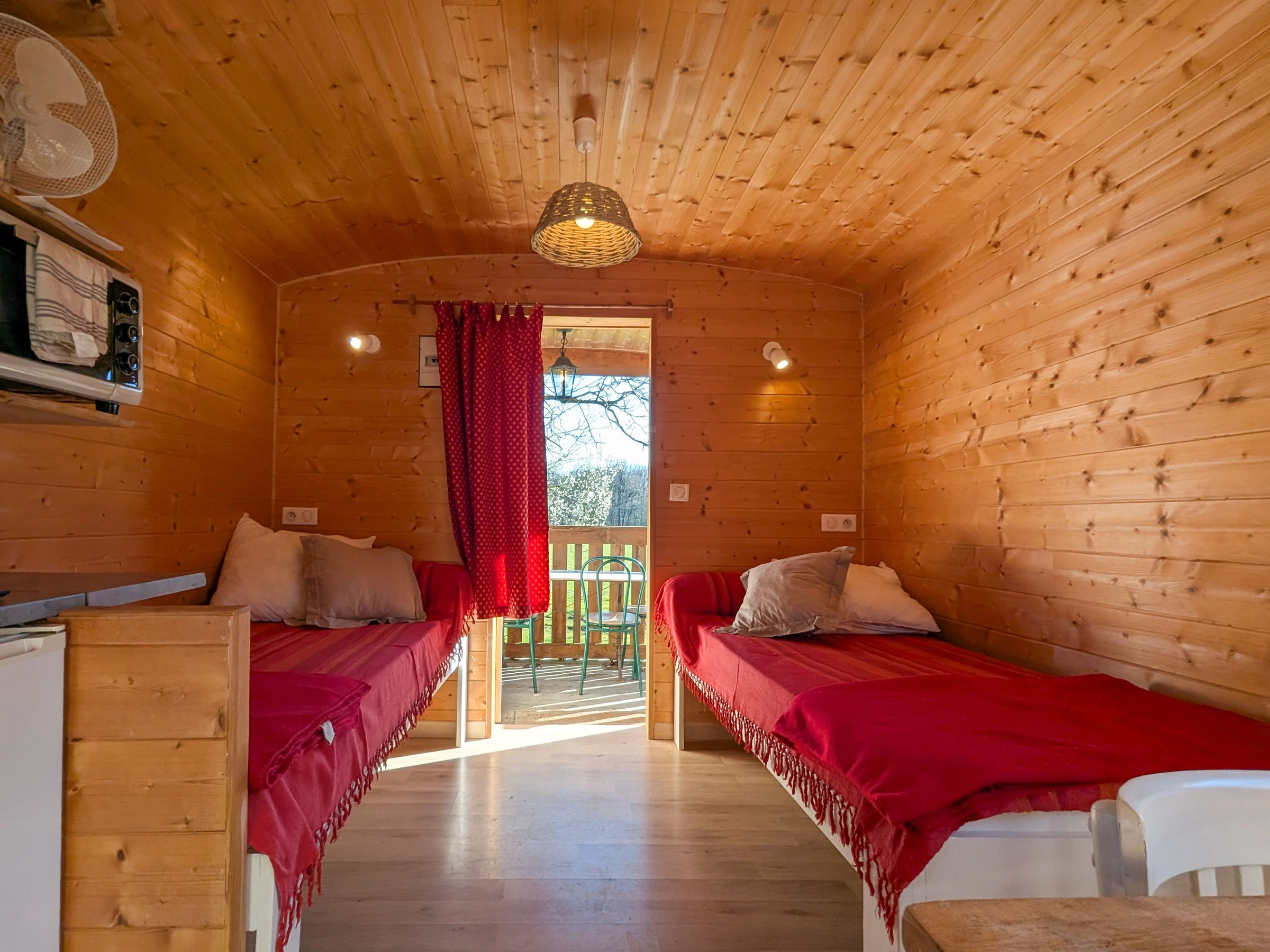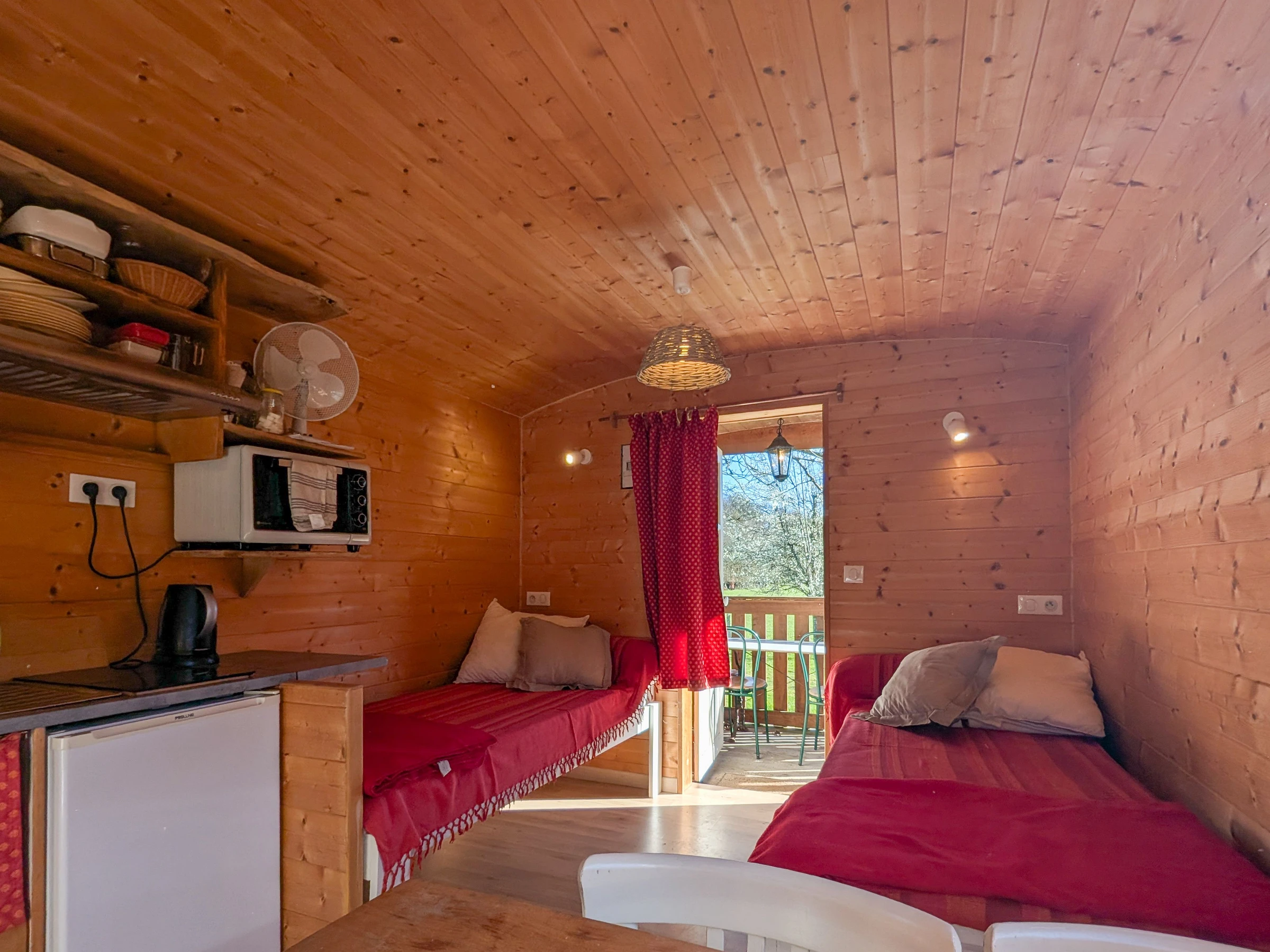 Freuen Sie sich vor Ort auf einen gemütlichen Außenbereich mit Pétanque-Platz, Fußballtor und einem 5 x 10 m großen Swimmingpool (geöffnet von Juni bis September), der gemeinsam mit den Eigentümern und einer zweiten Unterkunft genutzt wird. Charmanter 20 m² großer Wohnwagen mit überdachter und geschlossener Terrasse, ideal für einen ungewöhnlichen Aufenthalt mitten in der Natur. Es besteht aus einem Wohnzimmer mit Küchenzeile, Essbereich und 2 Einzelbetten, einem separaten Schlafzimmer mit 1 Doppelbett sowie einem Badezimmer mit Trockentoilette.