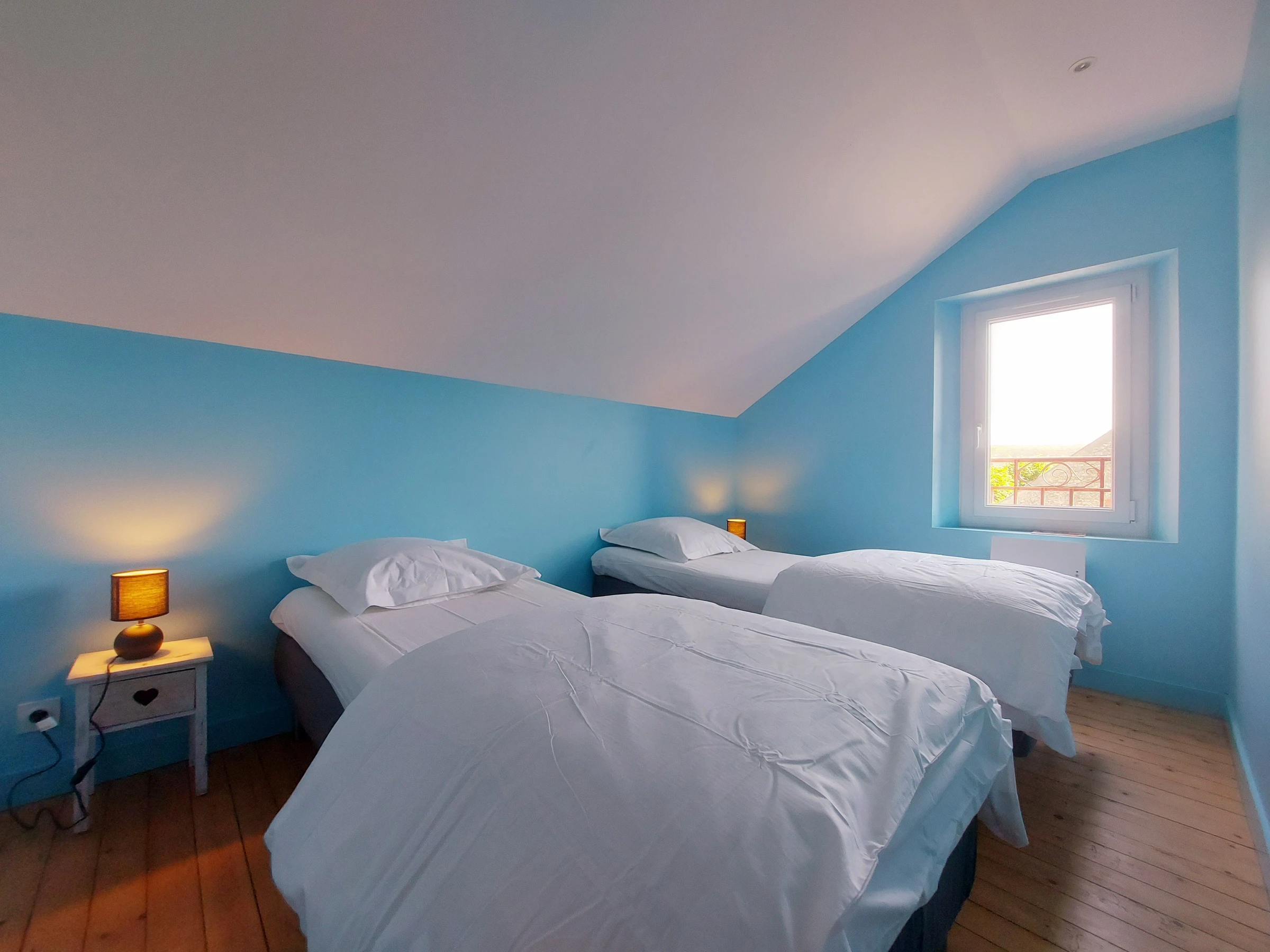 Vier geräumige Schlafzimmer: drei mit zwei Einzelbetten und eines mit einem Doppelbett, jeweils mit eigenem Bad und WC.