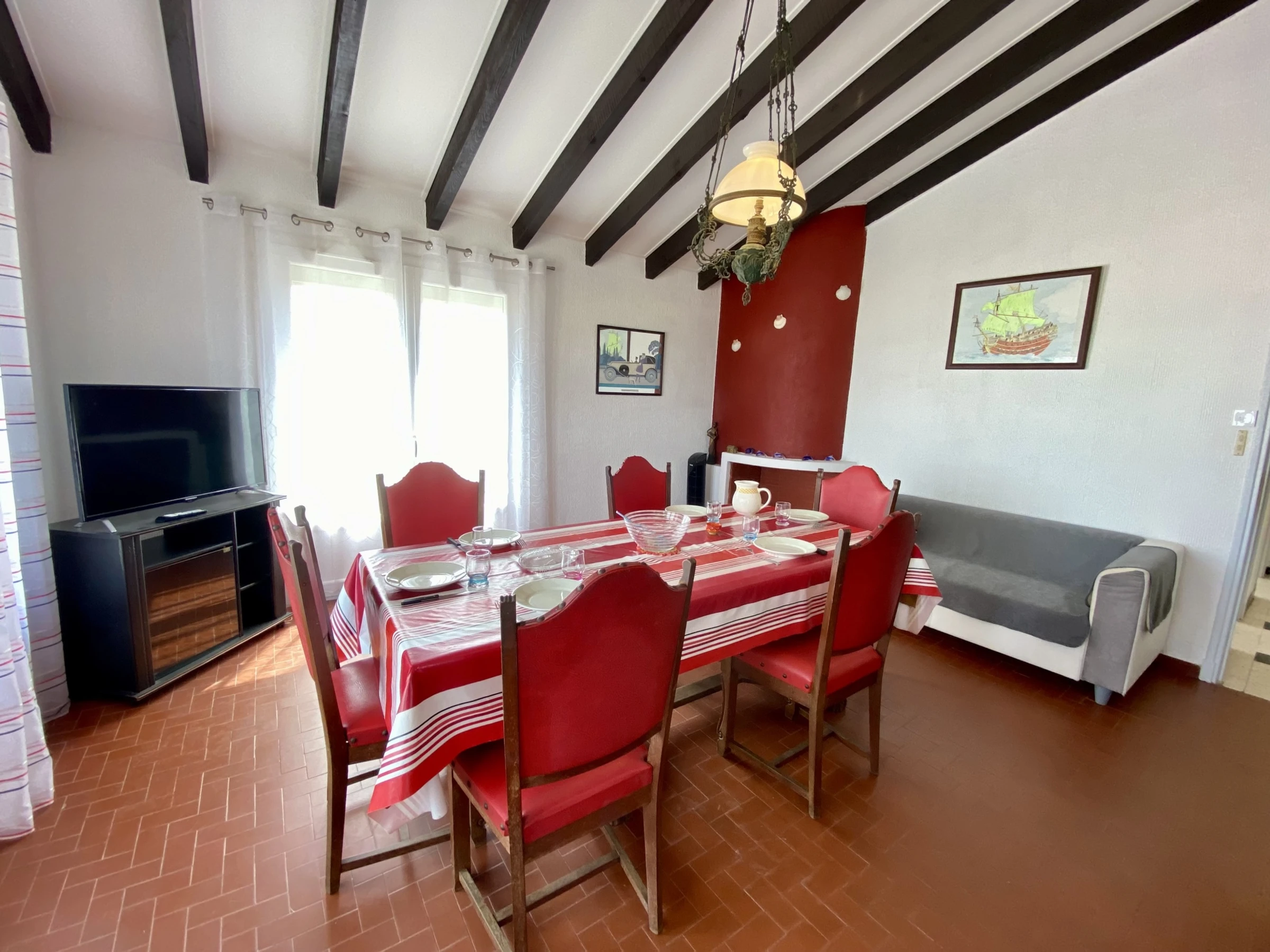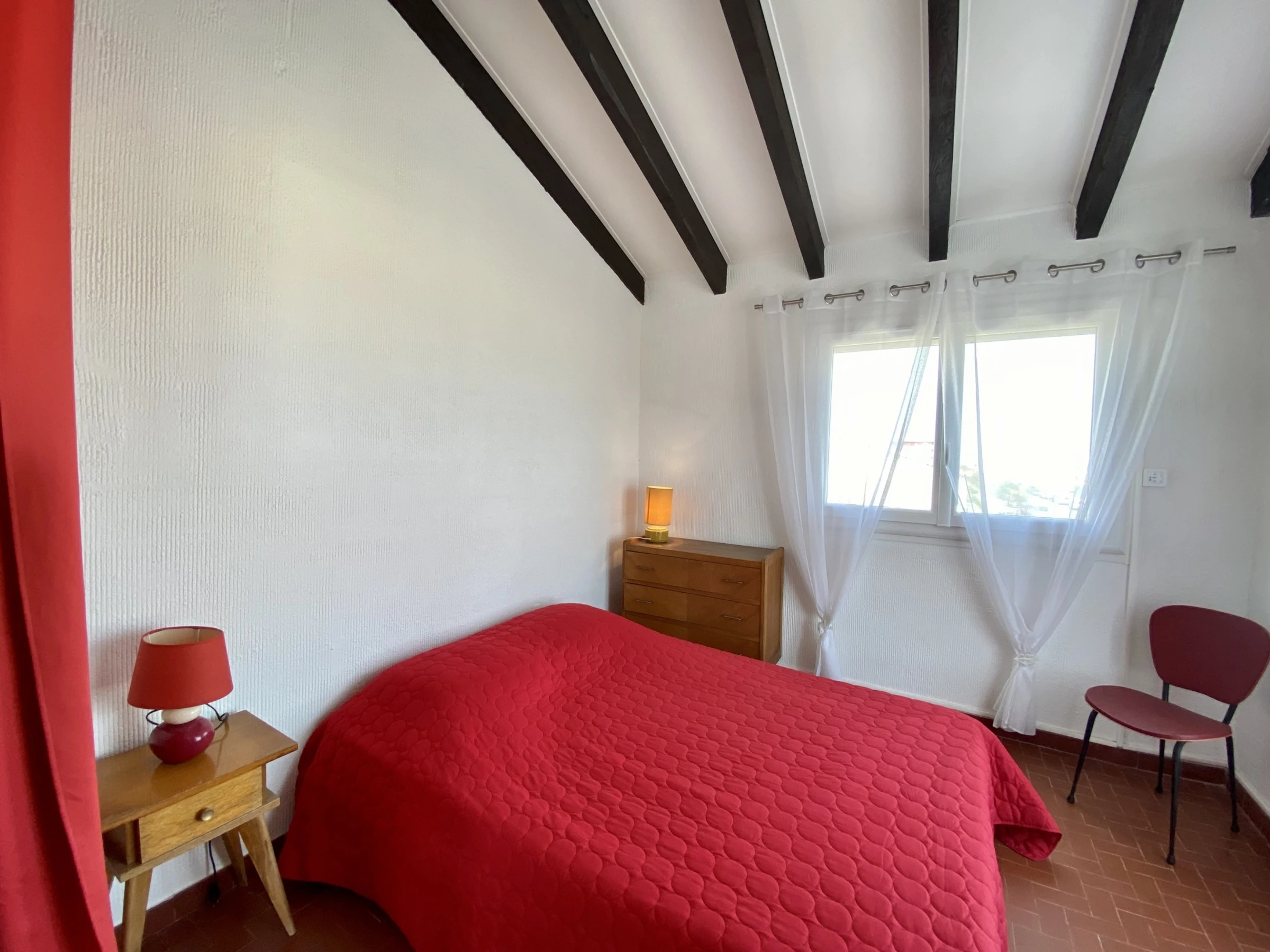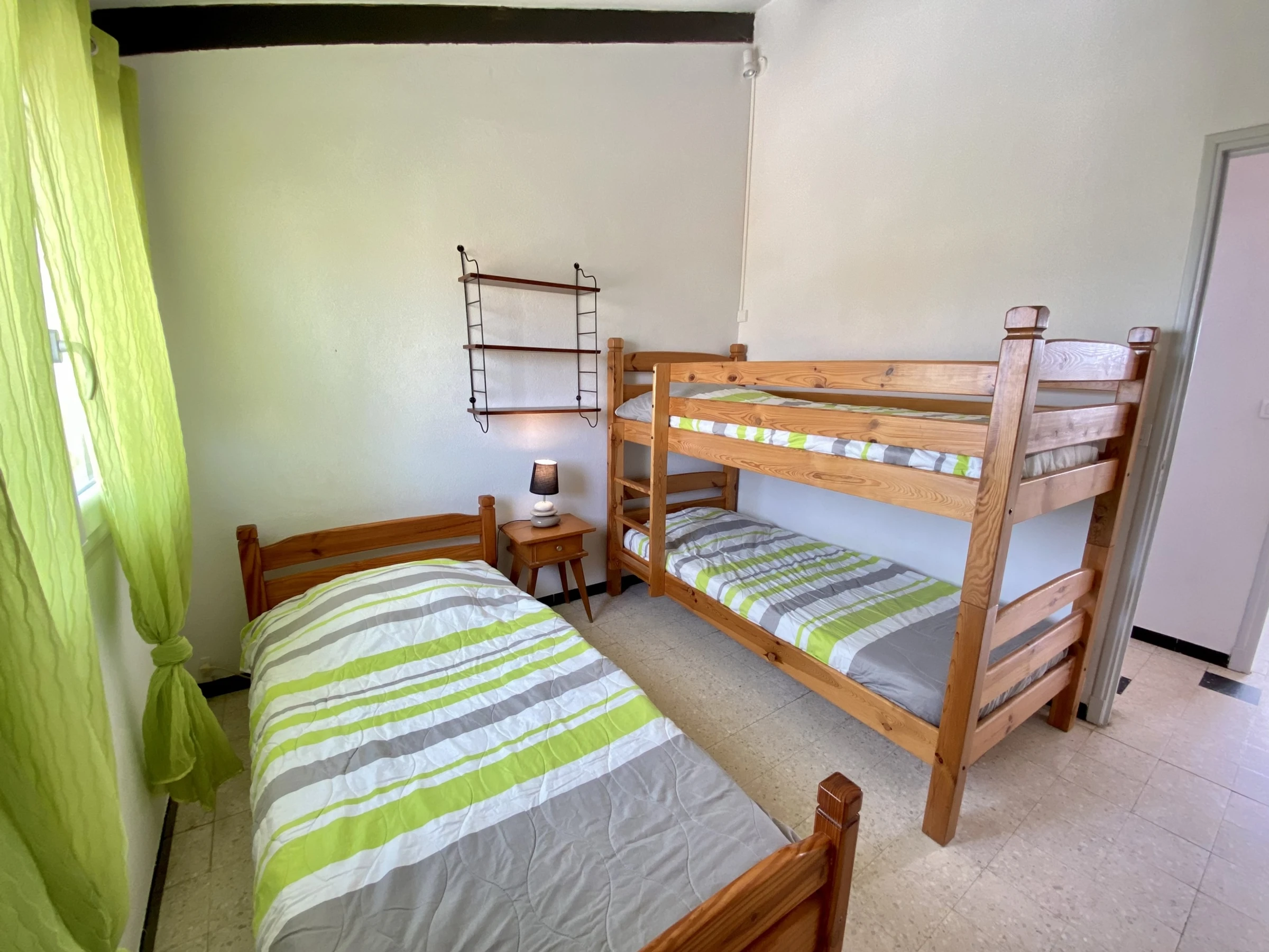 Am Eingang: Hauptschlafzimmer (1 Doppelbett, Einbauschrank) + 1 Kinderzimmer: 2 Etagenbetten à 90 cm und 1 Einzelbett (Einbauschrank) + 1 Schlafzimmer (1 Doppelbett) mit Zugang zum Wohnzimmer.