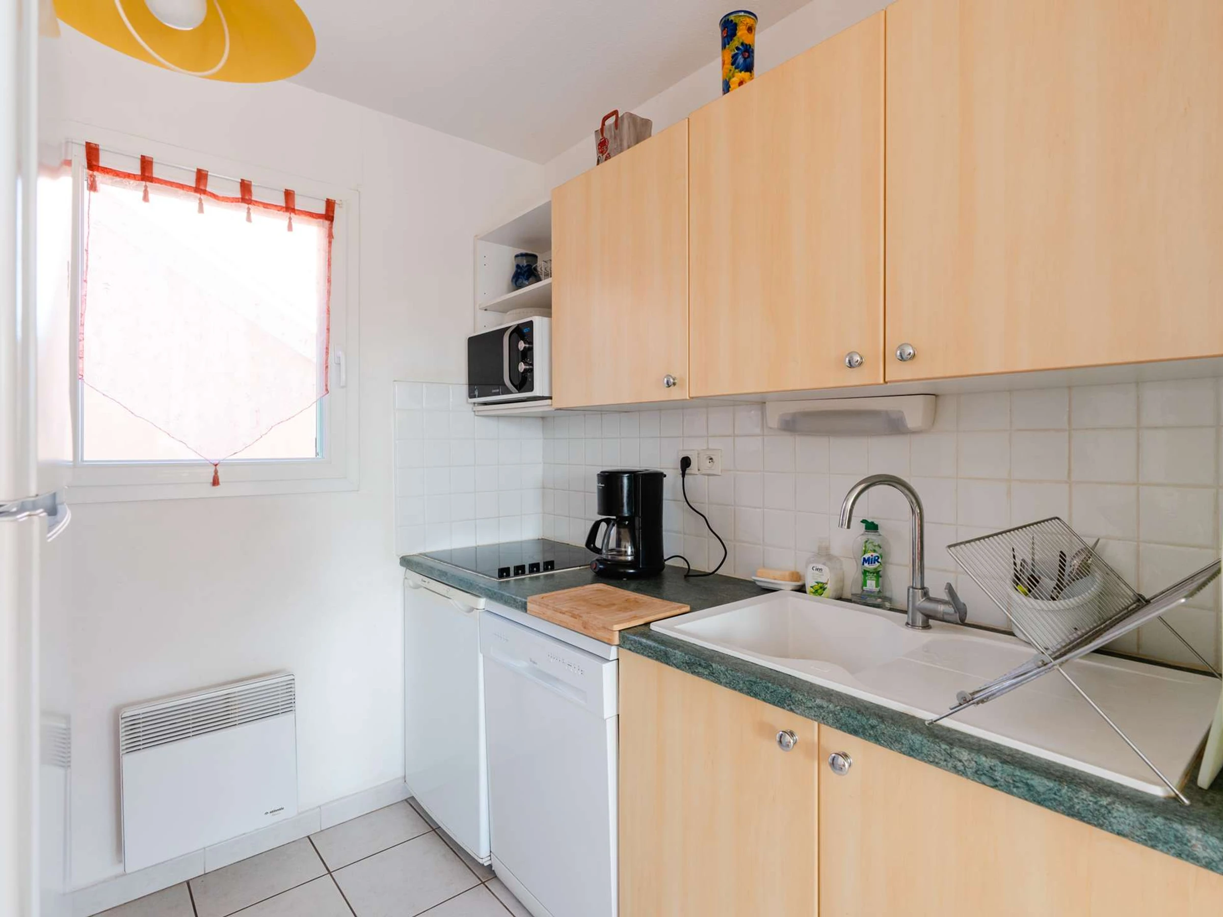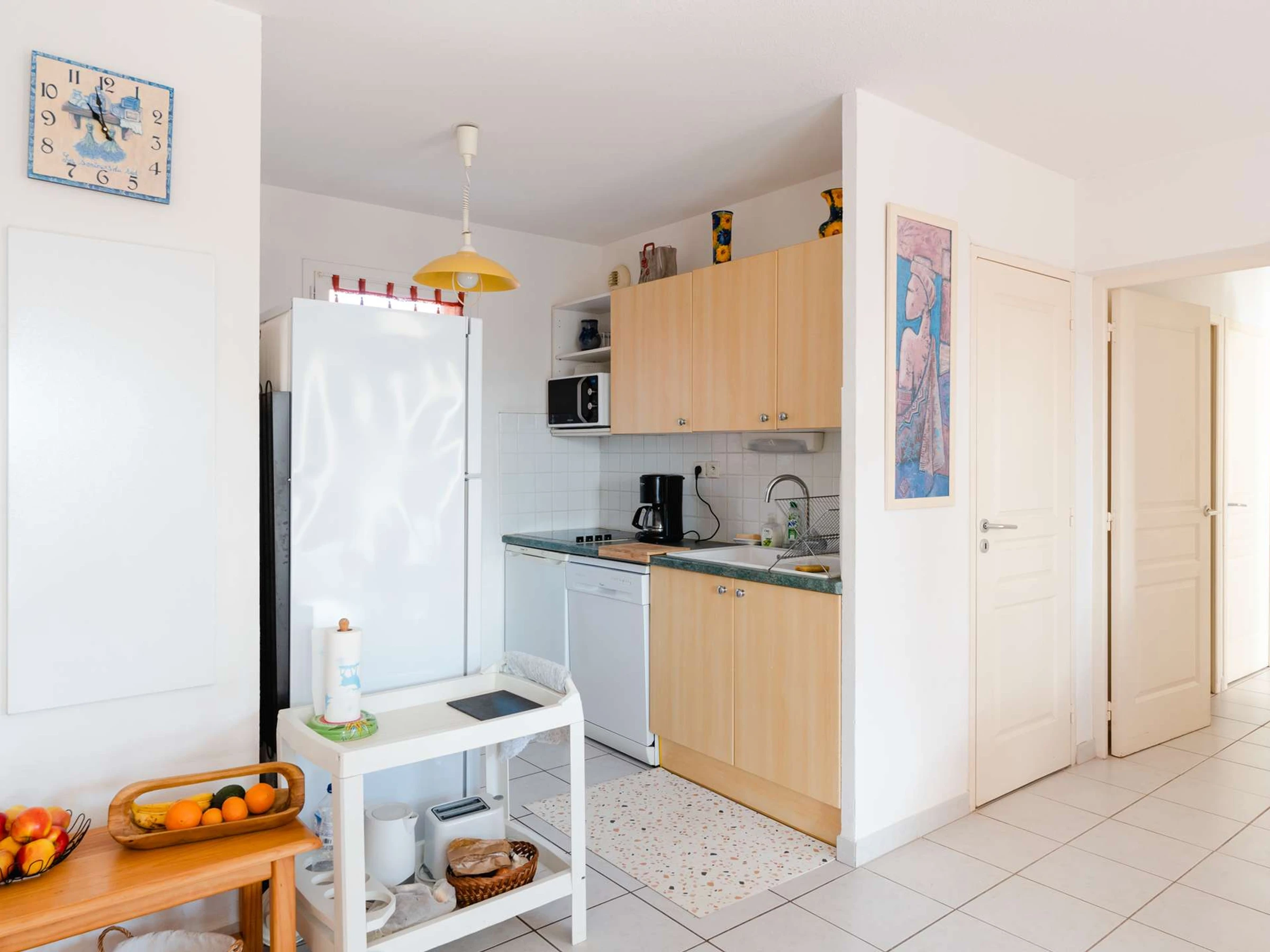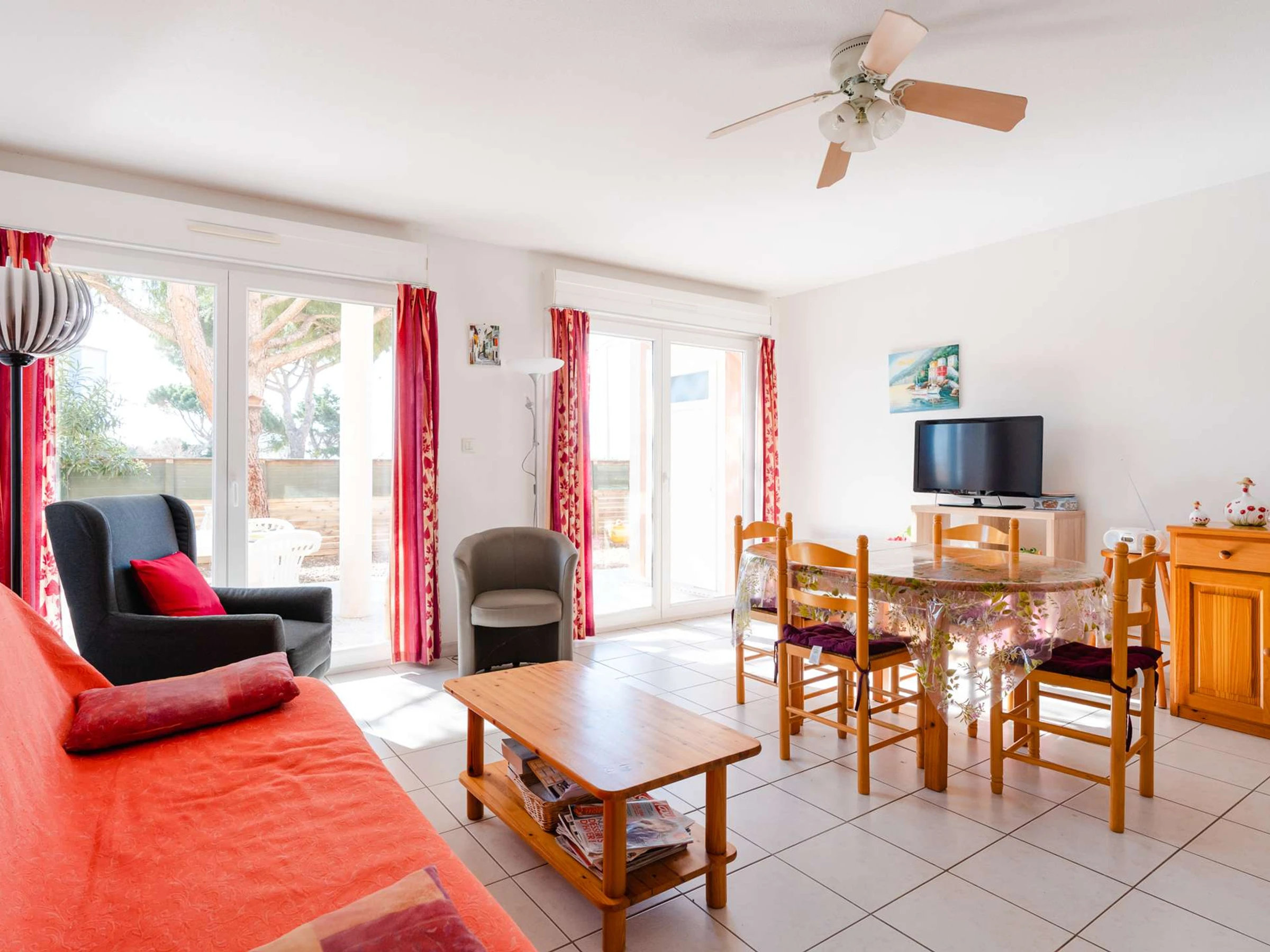 Der helle Wohnraum besteht aus einem Wohnbereich mit Tisch, Fernseher (französische Sender), Sofa, 2 Sesseln, Zugang zur Terrasse und einer Küchenzeile (Glaskeramikkochfelder, klassische Kaffeemaschine, Minibackofen, Mikrowelle, Toaster, Wasserkocher, Geschirrspüler, Schnellkochtopf, großer Kühlschrank mit Gefrierfach, Top-Kühlschrank mit Gefrierfach).