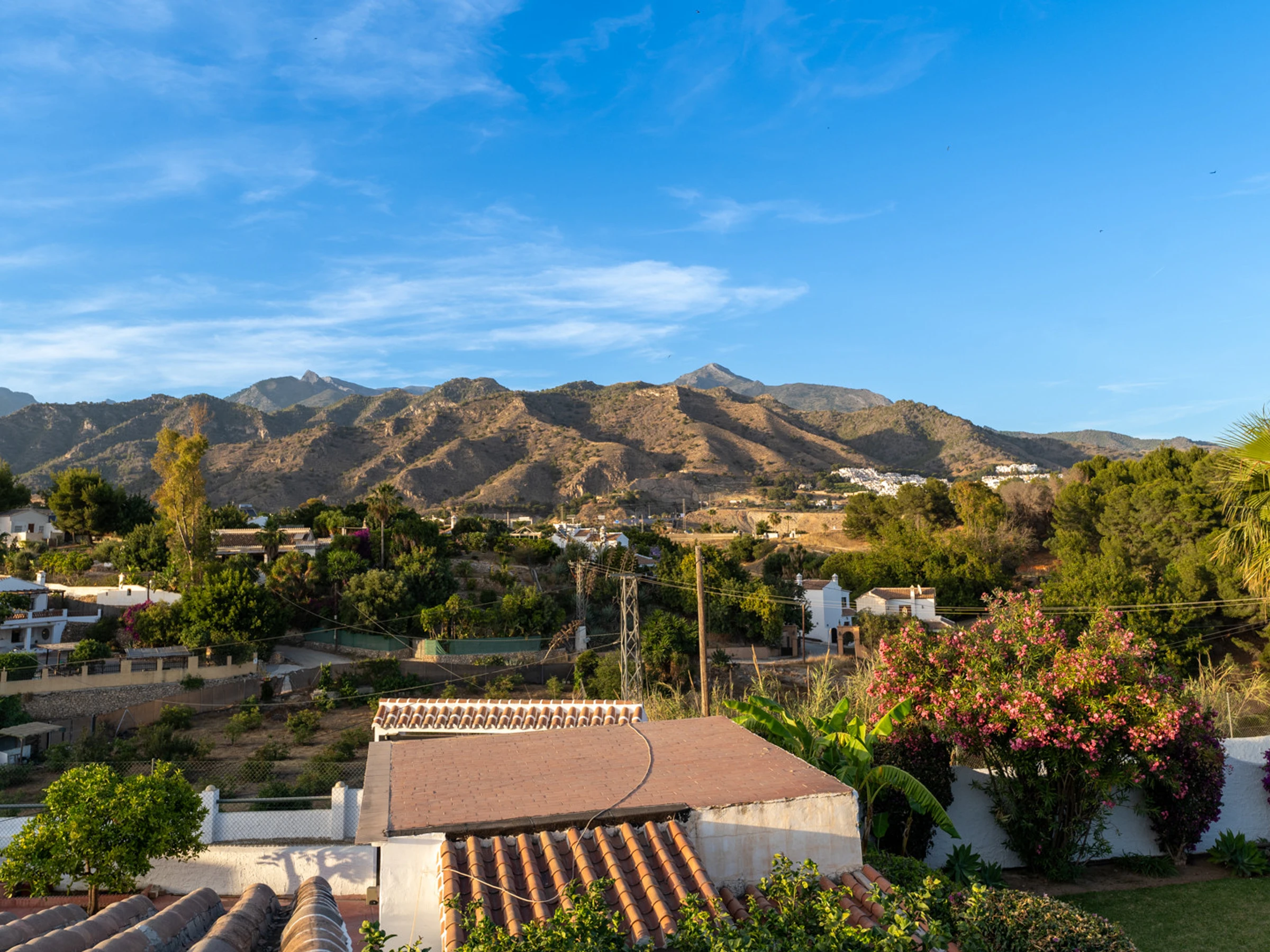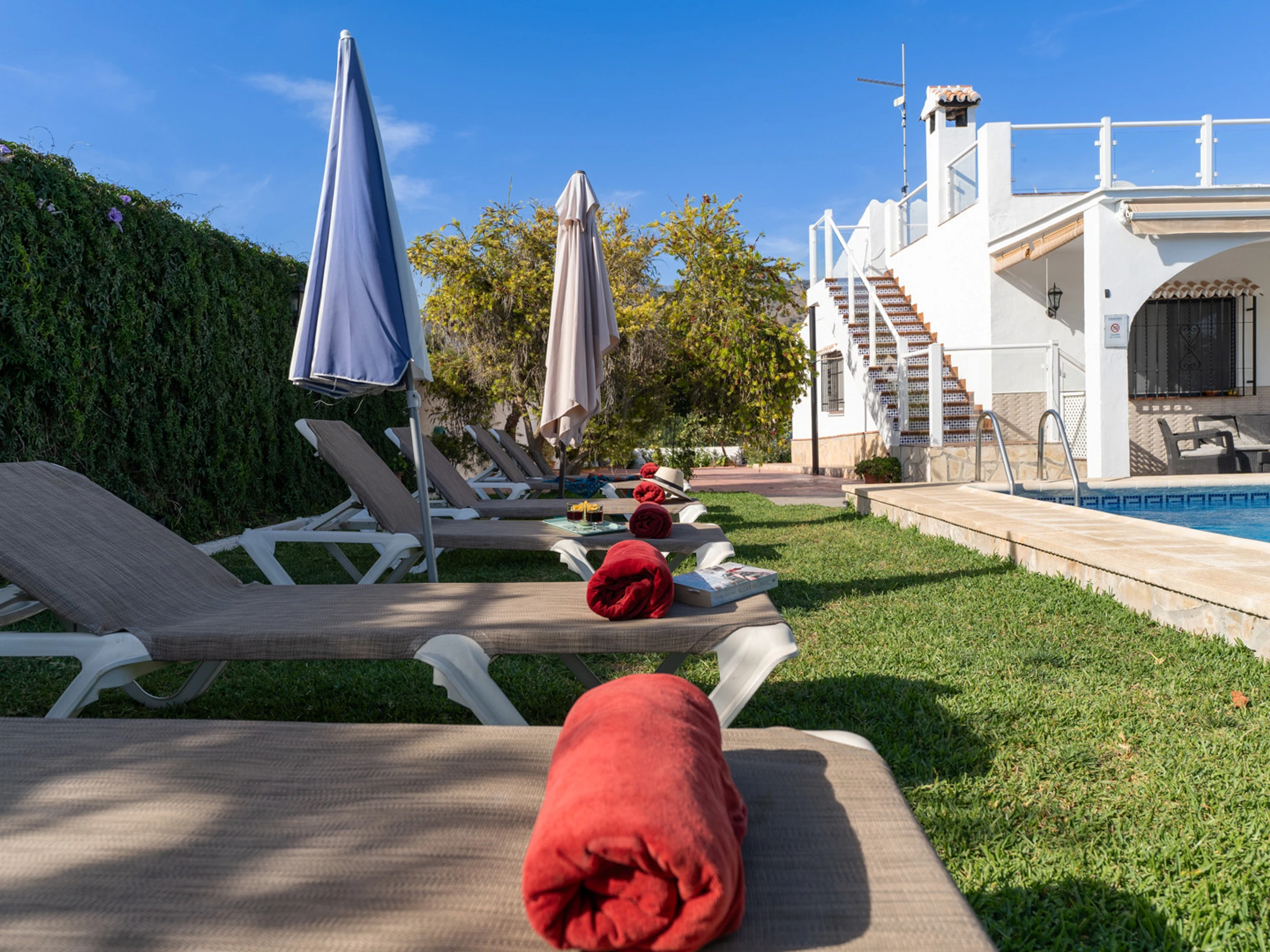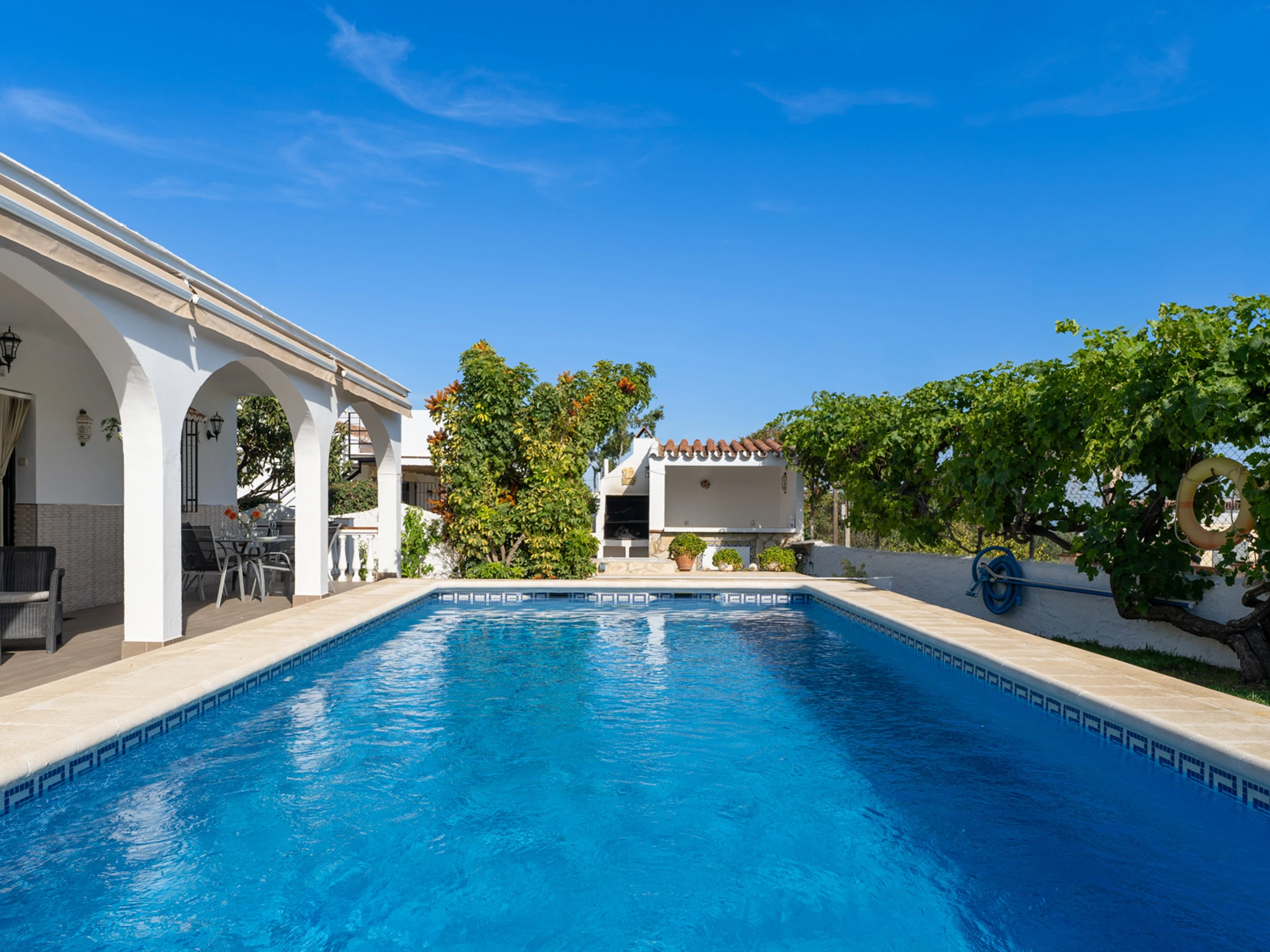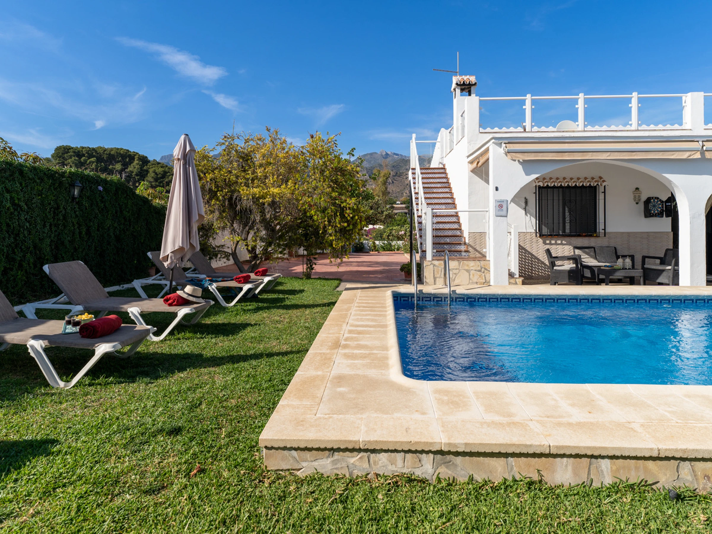 Diese Villa hat ein erfreuliche, fast ländliche Lage 2 km von Nerja entfernt. Sie beschert inspirierende Ausblicke auf die friedvolle Umgebung und verspricht einen sorglosen Urlaub. Gleich in der Nähe befindet sich eine panificadora (Großbäckerei), und der Lidl-Supermarkt ist nur 800 m entfernt. Umgeben von einer weißgetünchten Mauer und grünem Rasen vermittelt es ein Gefühl von absoluter Privatsphäre. Zum Haus gelangt man über eine Parkbucht für zwei Autos und einem von der Frontseite sichtbaren Pfad durch den Garten. Die Einrahmung des Swimmingpools (7x4 m) ist etwas erhöht und von viel Rasen umgeben, der einen idealen Spielplatz für die Kinder bildet. Eine hübsche überdachte Terrasse nimmt die gesamte Front des Hauses ein. Ein gemauerter Grill lädt Sie eventuell dazu ein, sich selbst zu bekochen. Die Dachterrasse mit fabelhaftem Blick auf die Landschaft ist ebenfalls ein idealer Platz für das segensreiche Sonnenbad. Es handelt sich also um eine hochwertige Villa mit einer Lage, in der man sich geruhsam erholen, aber auch die Attraktionen der in der Nähe liegenden Ortschaft Nerja genießen kann.