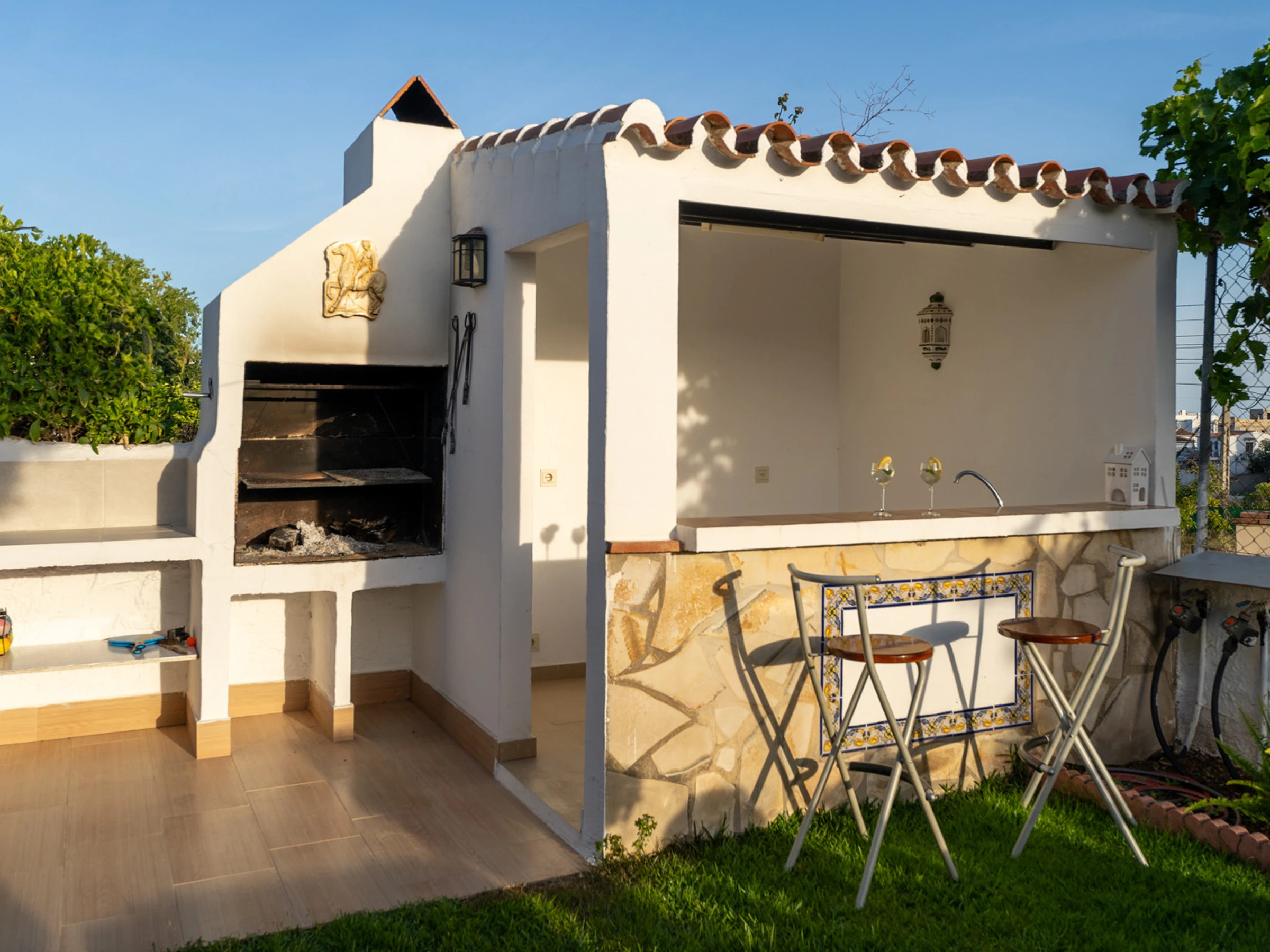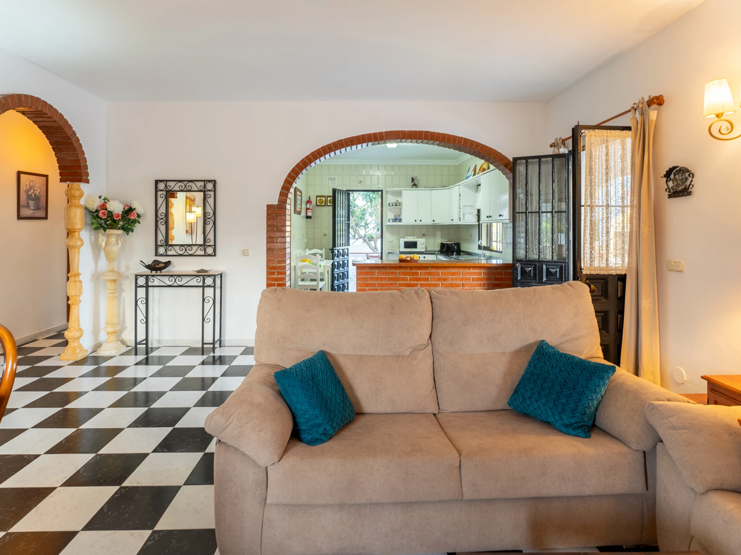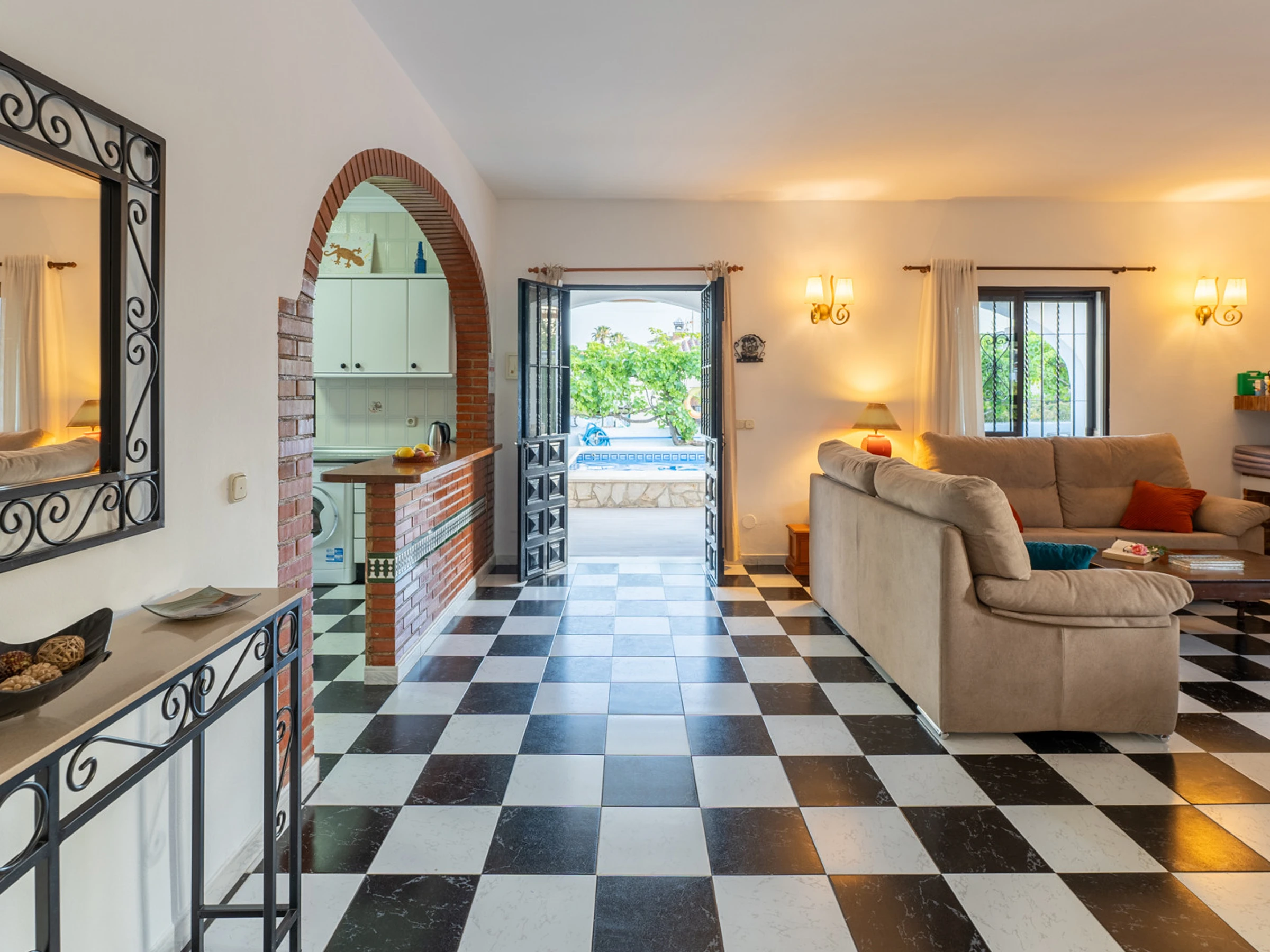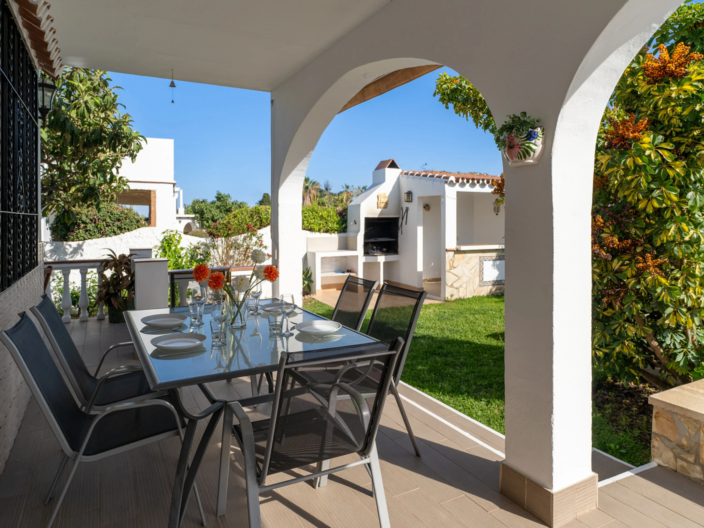 Diese Villa hat ein erfreuliche, fast ländliche Lage 2 km von Nerja entfernt. Sie beschert inspirierende Ausblicke auf die friedvolle Umgebung und verspricht einen sorglosen Urlaub. Gleich in der Nähe befindet sich eine panificadora (Großbäckerei), und der Lidl-Supermarkt ist nur 800 m entfernt. Umgeben von einer weißgetünchten Mauer und grünem Rasen vermittelt es ein Gefühl von absoluter Privatsphäre. Zum Haus gelangt man über eine Parkbucht für zwei Autos und einem von der Frontseite sichtbaren Pfad durch den Garten. Die Einrahmung des Swimmingpools (7x4 m) ist etwas erhöht und von viel Rasen umgeben, der einen idealen Spielplatz für die Kinder bildet. Eine hübsche überdachte Terrasse nimmt die gesamte Front des Hauses ein. Ein gemauerter Grill lädt Sie eventuell dazu ein, sich selbst zu bekochen. Die Dachterrasse mit fabelhaftem Blick auf die Landschaft ist ebenfalls ein idealer Platz für das segensreiche Sonnenbad. Es handelt sich also um eine hochwertige Villa mit einer Lage, in der man sich geruhsam erholen, aber auch die Attraktionen der in der Nähe liegenden Ortschaft Nerja genießen kann.